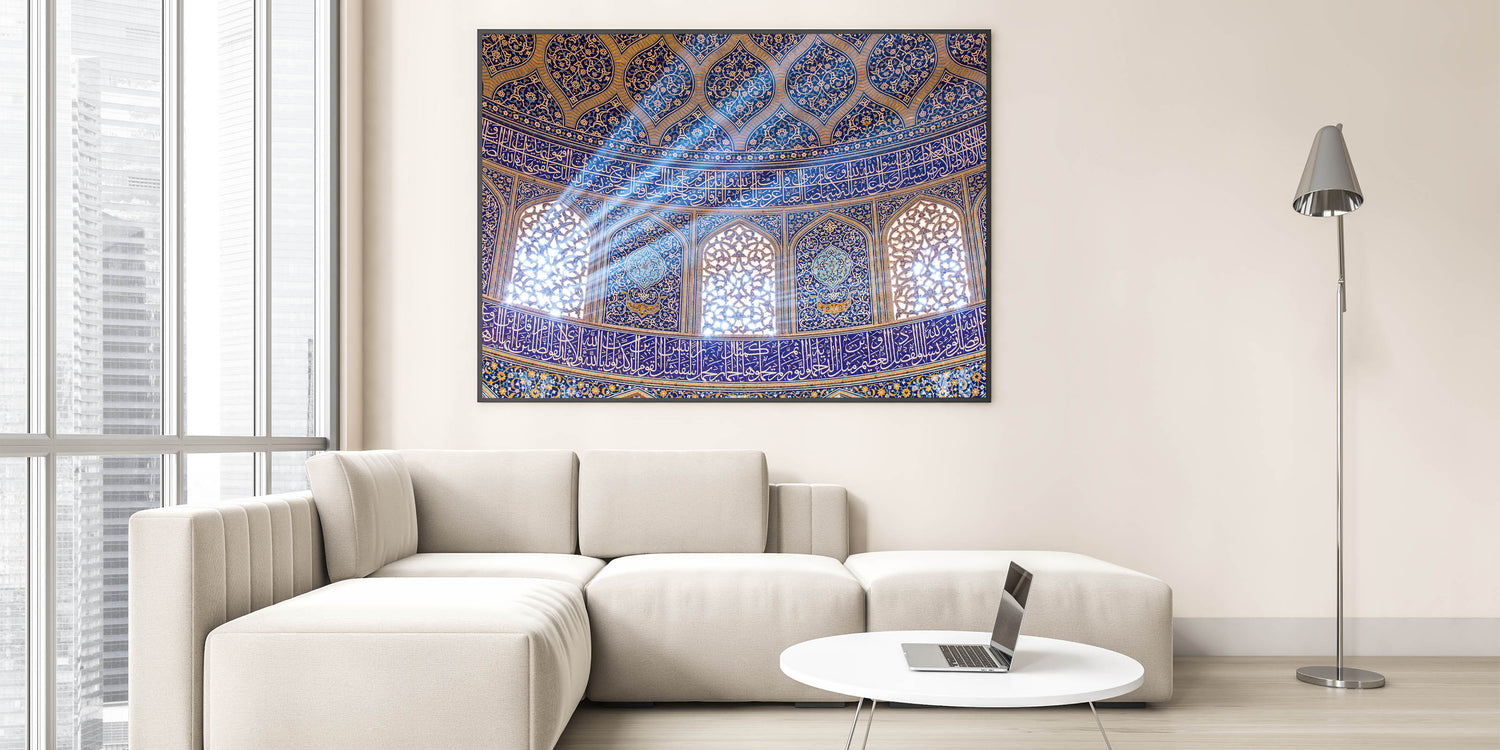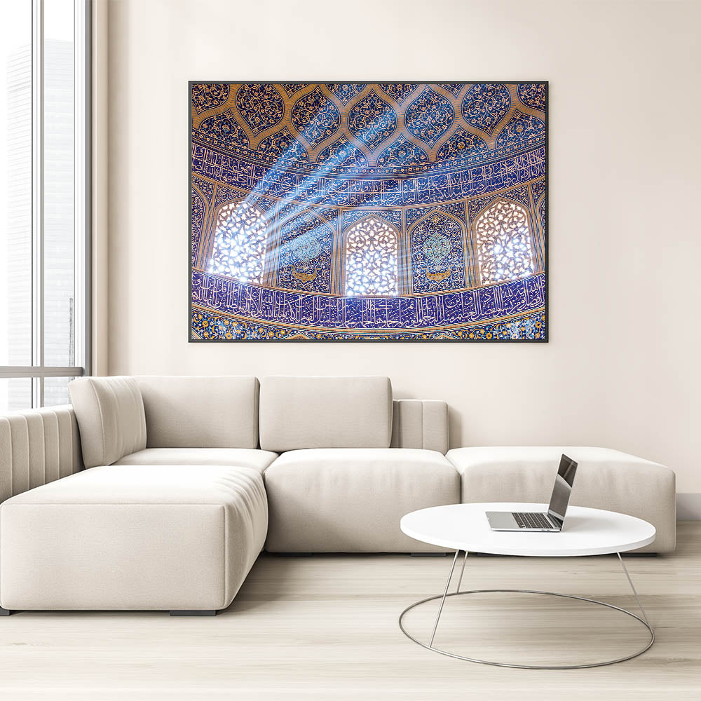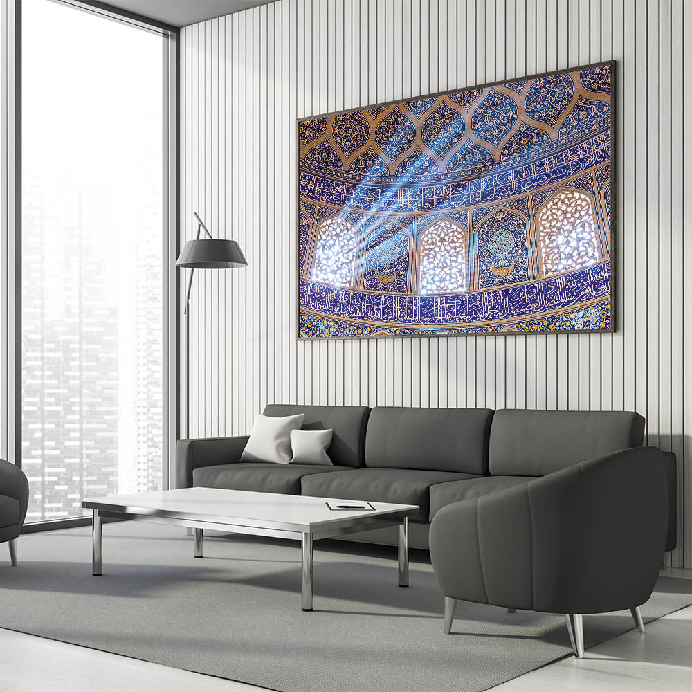 This exquisite Persian calligraphy wall art features stunning geometric patterns and detailed calligraphic inscriptions, all rendered in elegant blue and gold tones. The intricate design, paired with the soft light filtering through the mosque’s windows, creates a serene and captivating atmosphere. This handcrafted Persian artwork offers a glimpse into the rich artistic heritage of Iran, blending architectural beauty with cultural symbolism. Perfect for those who appreciate Islamic art and Persian craftsmanship, this unique Iran wall decor will enhance any room with its timeless elegance.