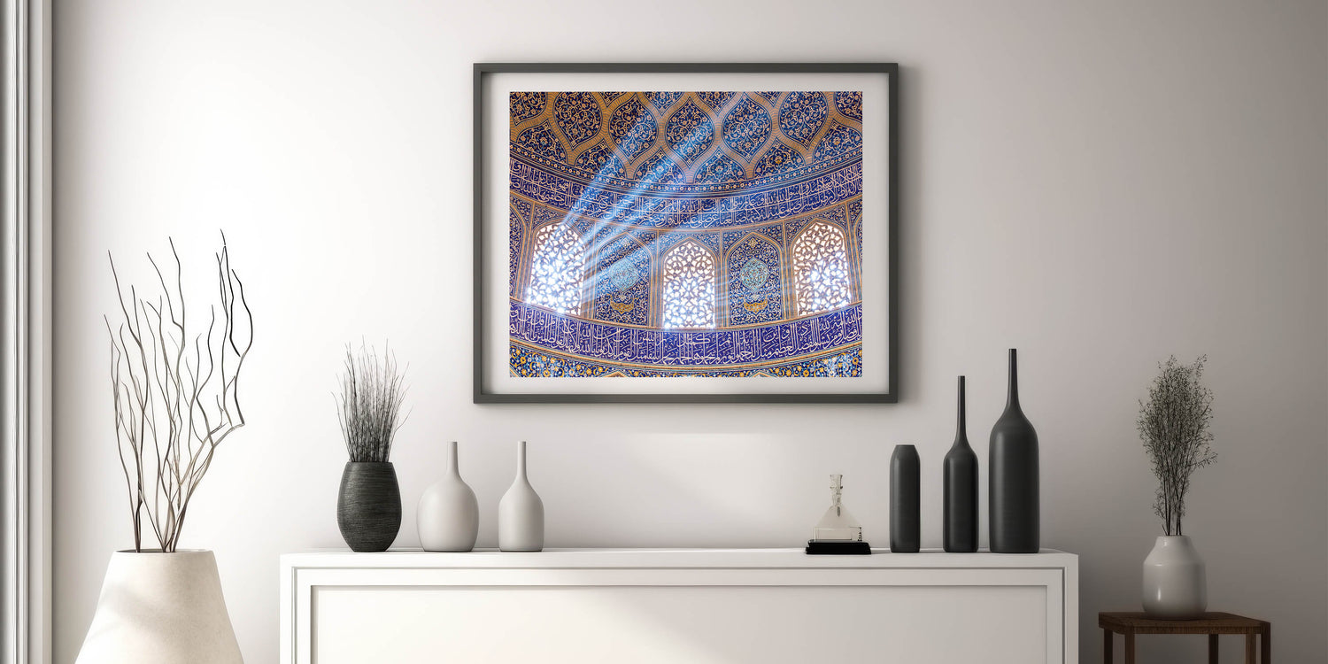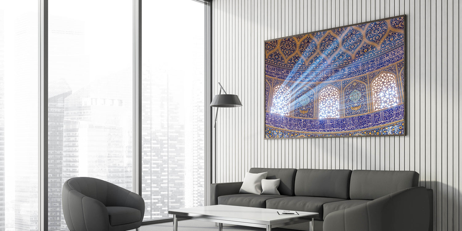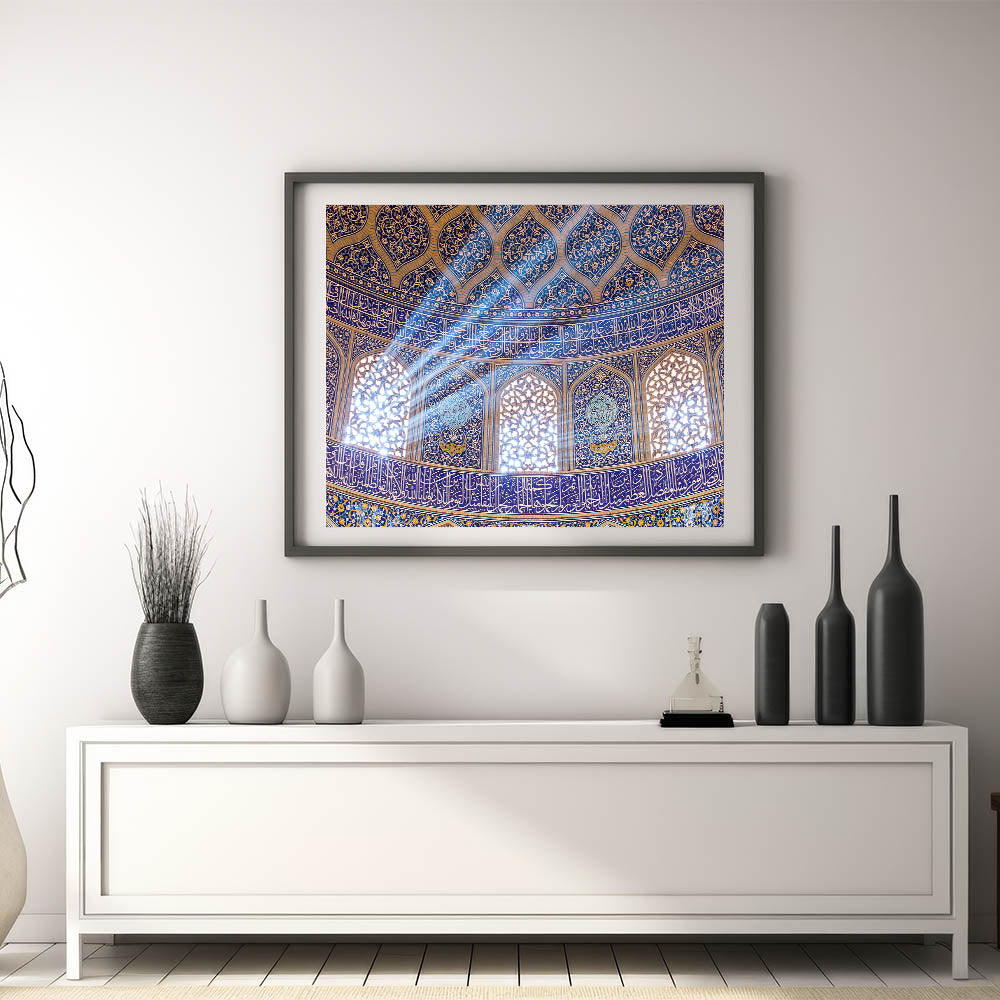 This exquisite Persian calligraphy wall art features stunning geometric patterns and detailed calligraphic inscriptions, all rendered in elegant blue and gold tones. The intricate design, paired with the soft light filtering through the mosque’s windows, creates a serene and captivating atmosphere. This handcrafted Persian artwork offers a glimpse into the rich artistic heritage of Iran, blending architectural beauty with cultural symbolism. Perfect for those who appreciate Islamic art and Persian craftsmanship, this unique Iran wall decor will enhance any room with its timeless elegance.