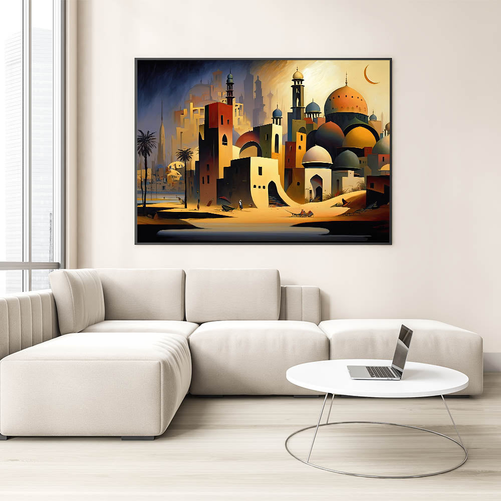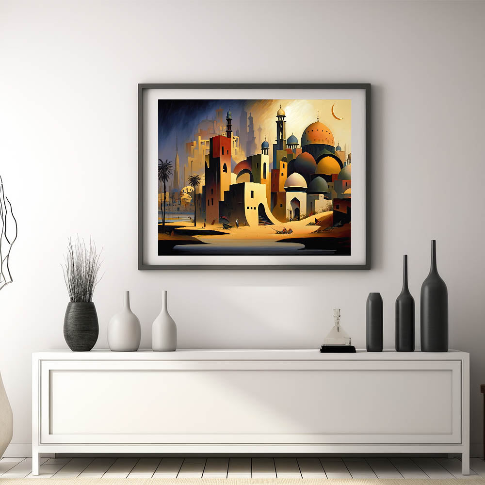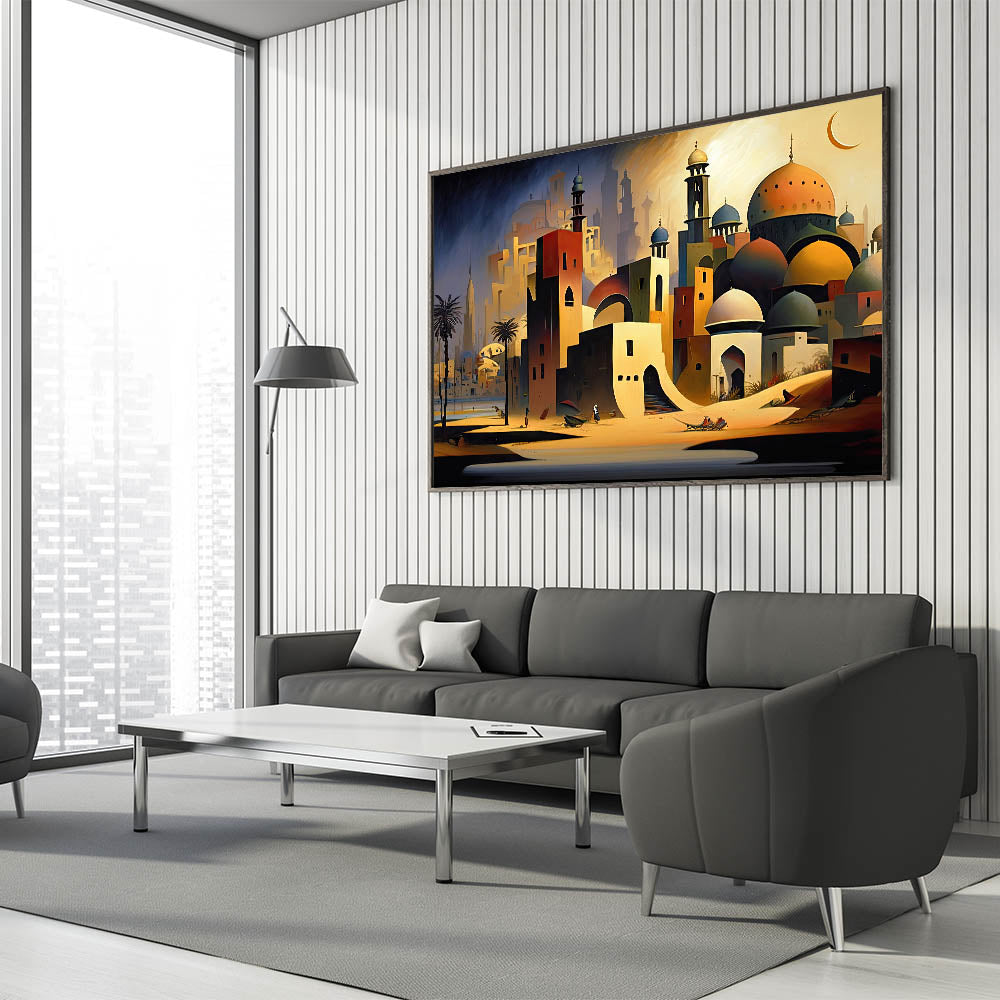 Discover the vibrant beauty of a Mesopotamian city with this stunning Golden Domes of Mesopotamia wall art. The painting captures a mesmerizing cityscape filled with grand domes, towering minarets, and palm trees, all set beneath a golden, dusky sky. The warm, rich colors create an inviting glow, evoking the charm and architectural splendor of ancient Middle Eastern cities. This artwork beautifully combines history, culture, and artistry, making it a perfect addition to any home or office space.