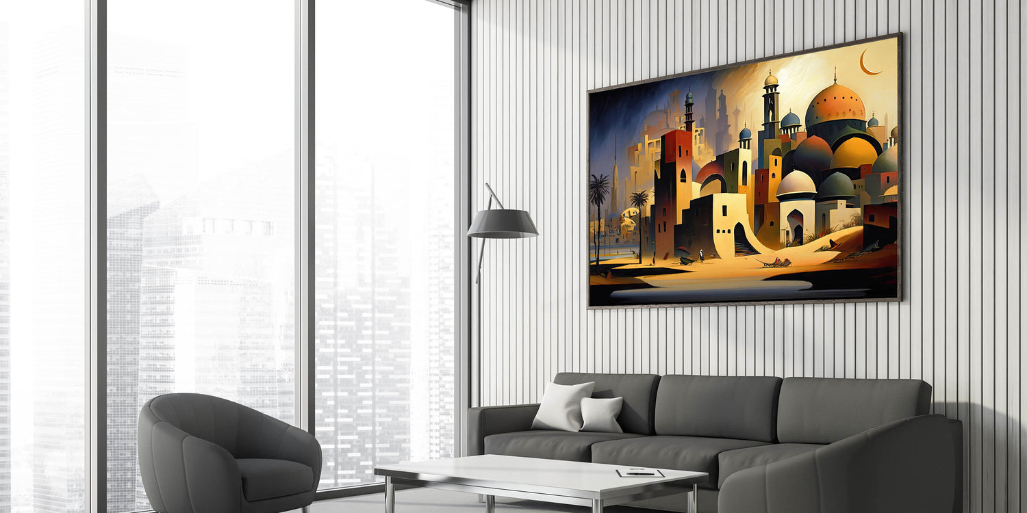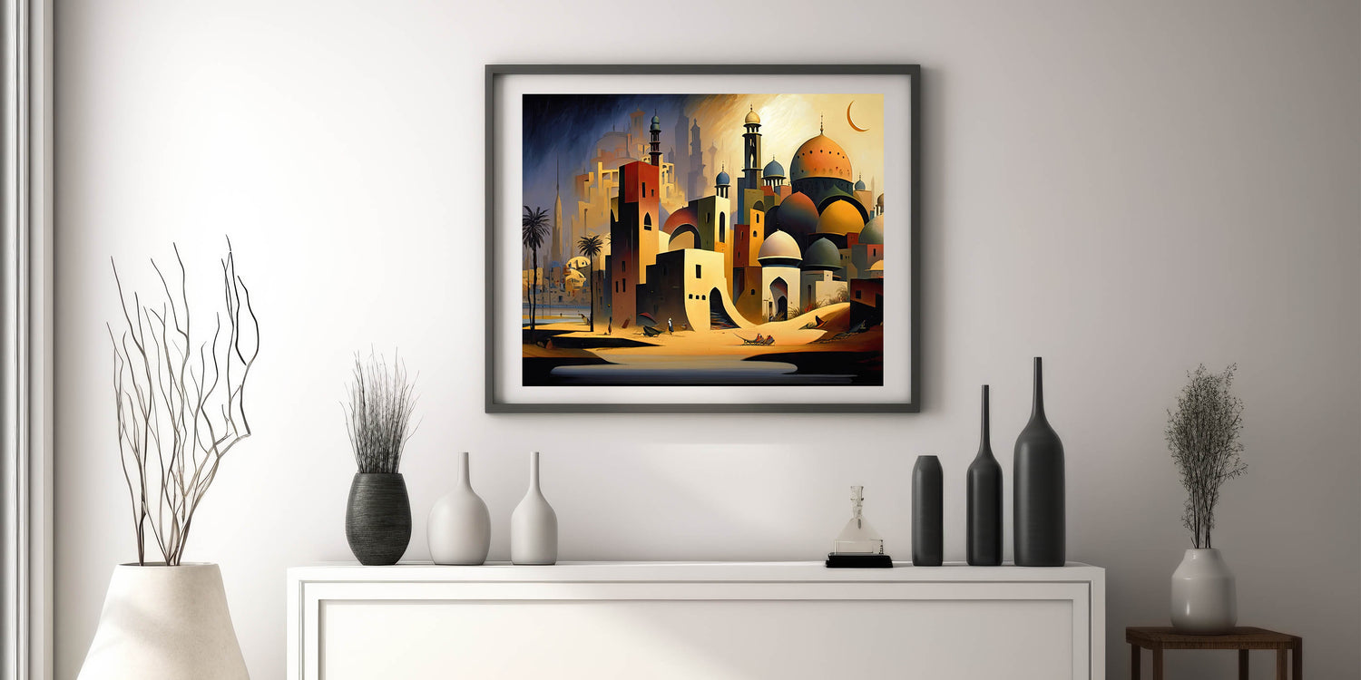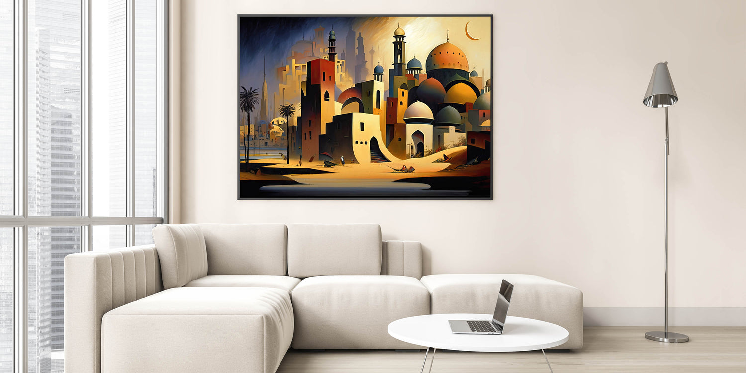 Discover the vibrant beauty of a Mesopotamian city with this stunning Golden Domes of Mesopotamia wall art. The painting captures a mesmerizing cityscape filled with grand domes, towering minarets, and palm trees, all set beneath a golden, dusky sky. The warm, rich colors create an inviting glow, evoking the charm and architectural splendor of ancient Middle Eastern cities. This artwork beautifully combines history, culture, and artistry, making it a perfect addition to any home or office space.