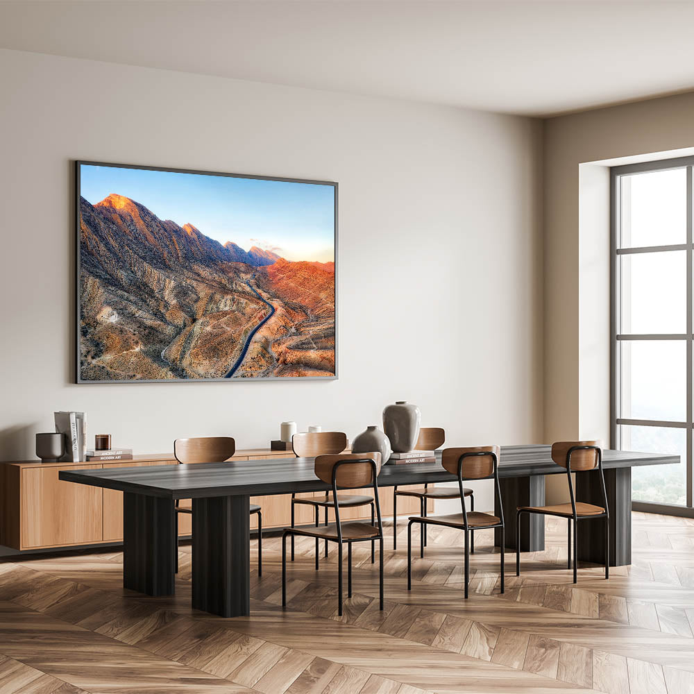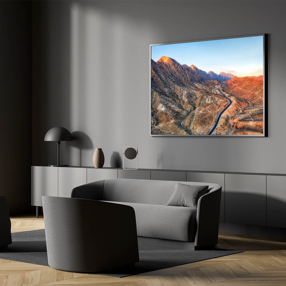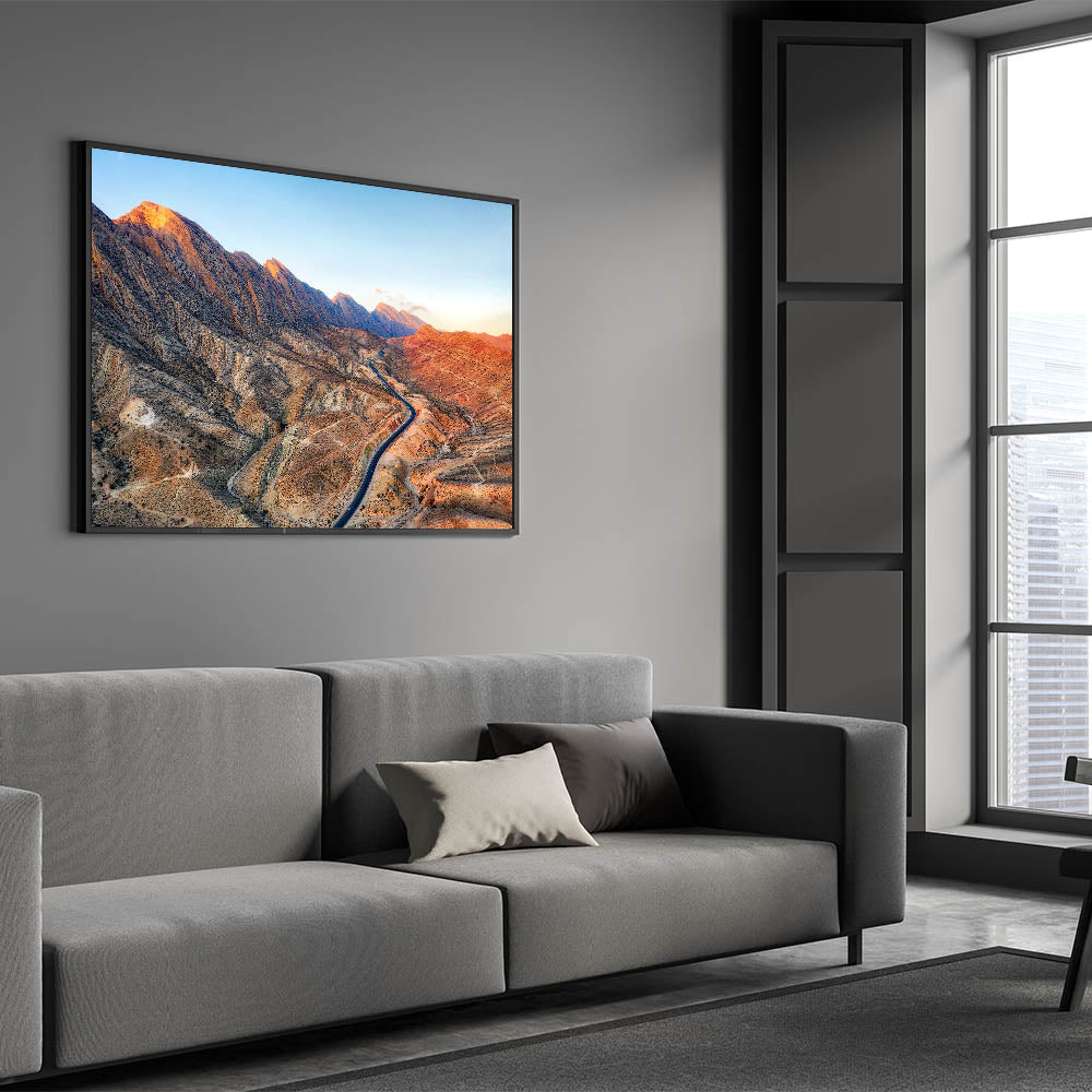 Discover the breathtaking beauty of Iraq's rugged mountains with this stunning Iraq Wall Art, featuring a scenic road winding through Mesopotamia’s majestic terrain. The intricate layers of the landscape are bathed in warm, golden light as the sun sets, creating a dramatic and awe-inspiring view. This piece captures the essence of Iraq's natural beauty and offers a unique glimpse into the rich history of this ancient region.