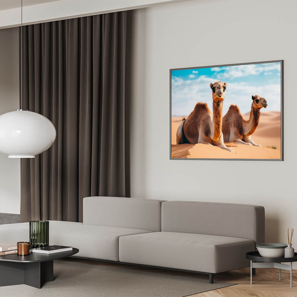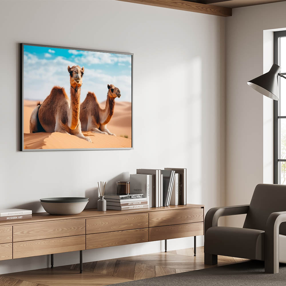 Capture the tranquil beauty of the Mesopotamian desert with this exquisite Middle Eastern Scenic Wall Art, featuring two camels resting on golden sand dunes beneath a bright blue sky. This artwork celebrates the peaceful moments of desert life, where the majestic creatures of the desert find respite under the warmth of the sun. The vibrant colors and serene scene create an atmosphere of calm and wonder, perfect for bringing the essence of the Middle East into your home.