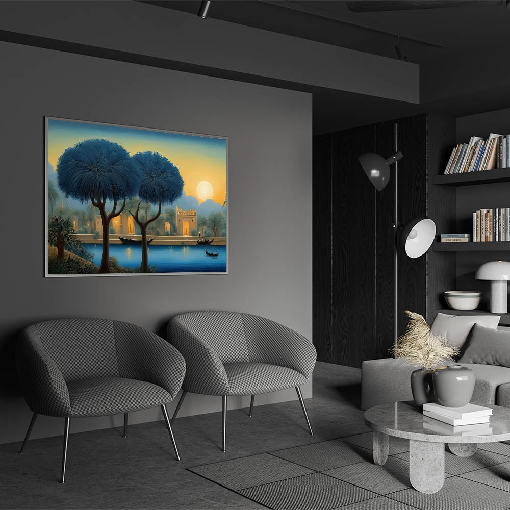 Embrace the serene beauty of the Mesopotamian landscape with this stunning Mesopotamian River at Dusk wall art. The tranquil scene features tall, elegant trees lining a calm river as the sun sets, casting a soft golden glow over the sky. The warm lights from the distant buildings add a magical touch, creating a perfect blend of natural beauty and architectural charm. This artwork captures the timeless elegance of Iraq’s riverside life and brings the peaceful atmosphere of a Middle Eastern evening into your home.
