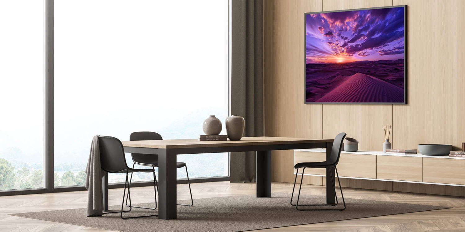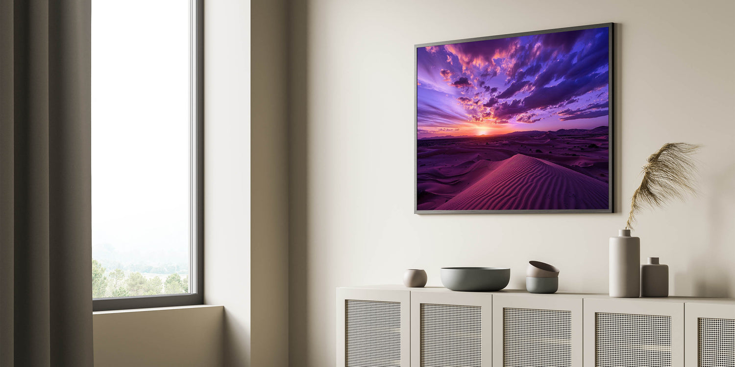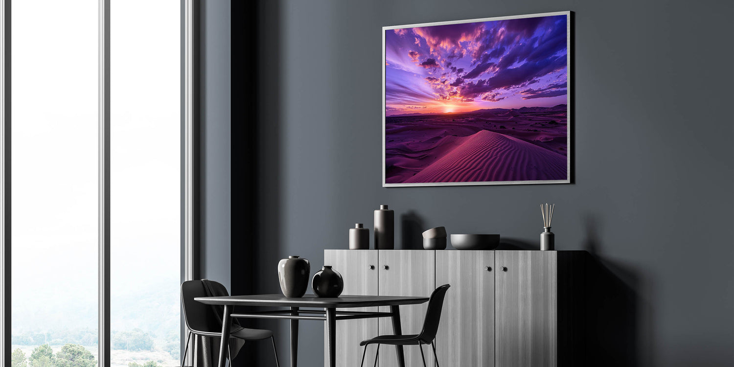 - High-definition printing captures the intense colors and fine details of the desert sunset.