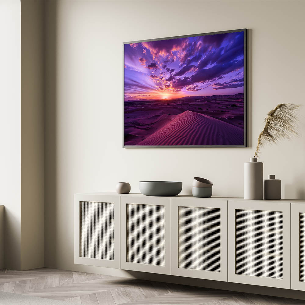 Experience the beauty of Mesopotamian landscapes with this stunning Mesopotamian Sunset wall art. The image captures a mesmerizing sunset over vast desert dunes, painted in rich shades of purple, pink, and orange. The interplay between the dramatic sky and the softly rippled sand creates a breathtaking visual that evokes the timeless allure of the desert. The setting sun casts a magical glow across the scene, making it a perfect choice for those who appreciate the grandeur of nature. This piece seamlessly combines vibrant colors with serene desert beauty, offering an awe-inspiring tribute to the landscapes of the Middle East.