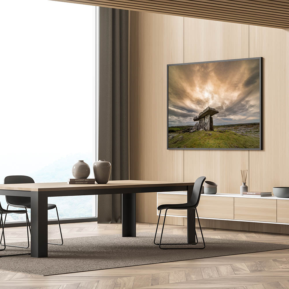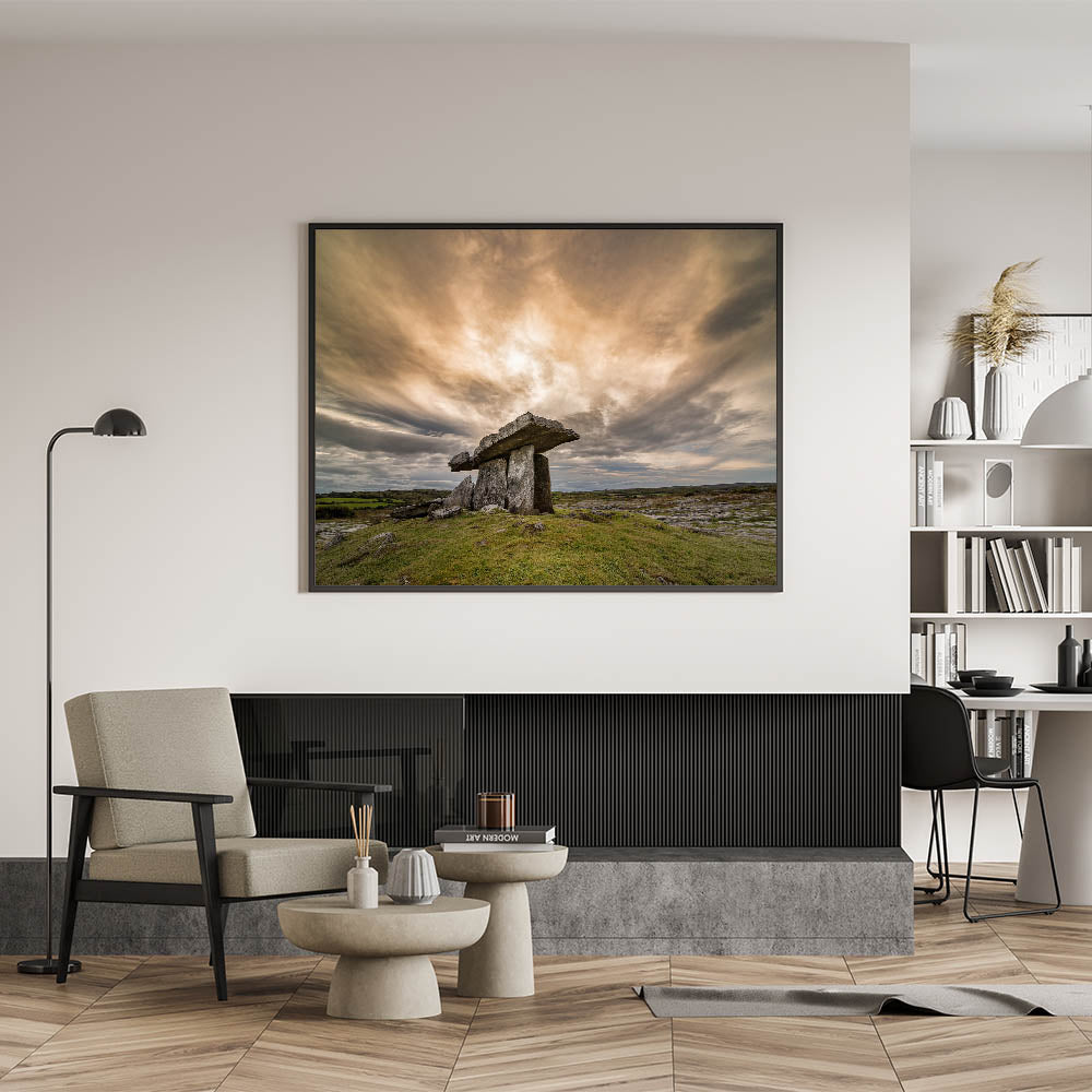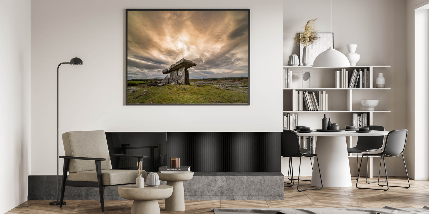 Elevate your space with this stunning Irish landscape art, featuring an ancient dolmen under a vast, dramatic sky. The swirling clouds create a moody atmosphere that perfectly complements the timeless stone structure. Surrounded by the rolling green hills of the Irish countryside, this Ireland-inspired wall art captures the ancient mystique and natural beauty of Ireland's landscapes. This high-quality Irish landscape print is an ideal way to bring a sense of history and wonder into your home.