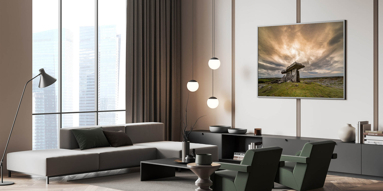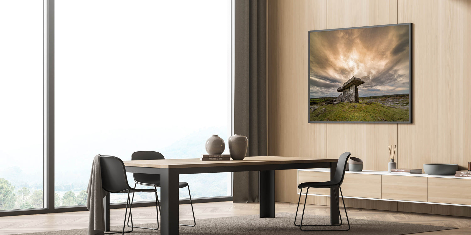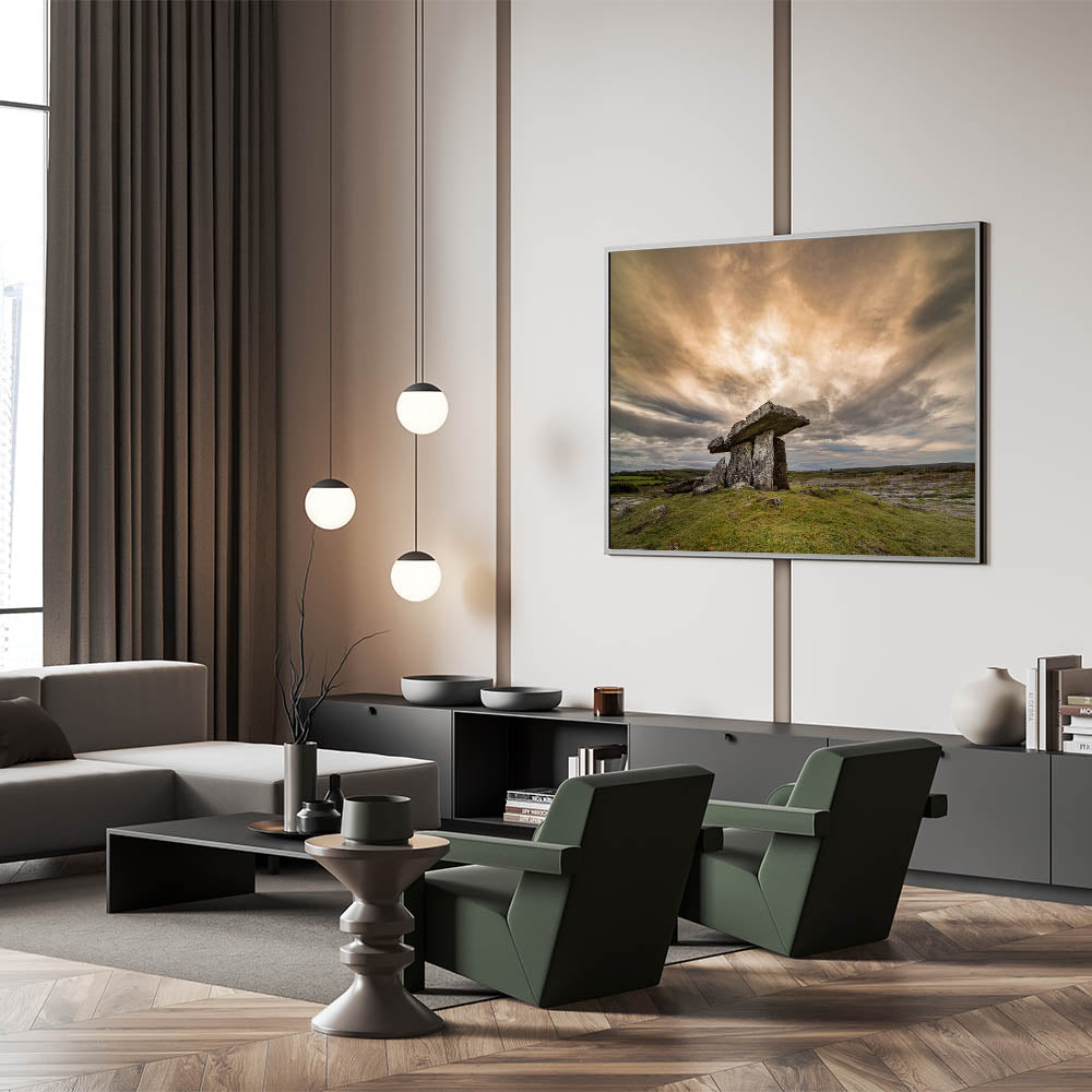 Elevate your space with this stunning Irish landscape art, featuring an ancient dolmen under a vast, dramatic sky. The swirling clouds create a moody atmosphere that perfectly complements the timeless stone structure. Surrounded by the rolling green hills of the Irish countryside, this Ireland-inspired wall art captures the ancient mystique and natural beauty of Ireland's landscapes. This high-quality Irish landscape print is an ideal way to bring a sense of history and wonder into your home.