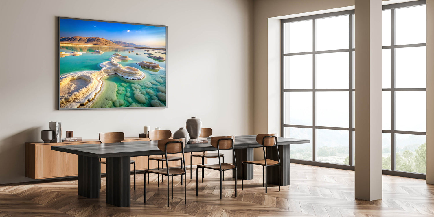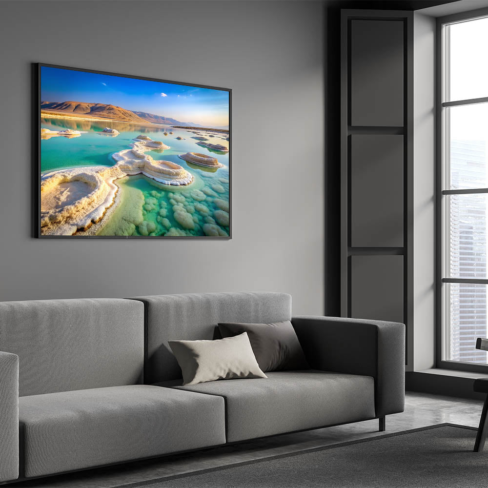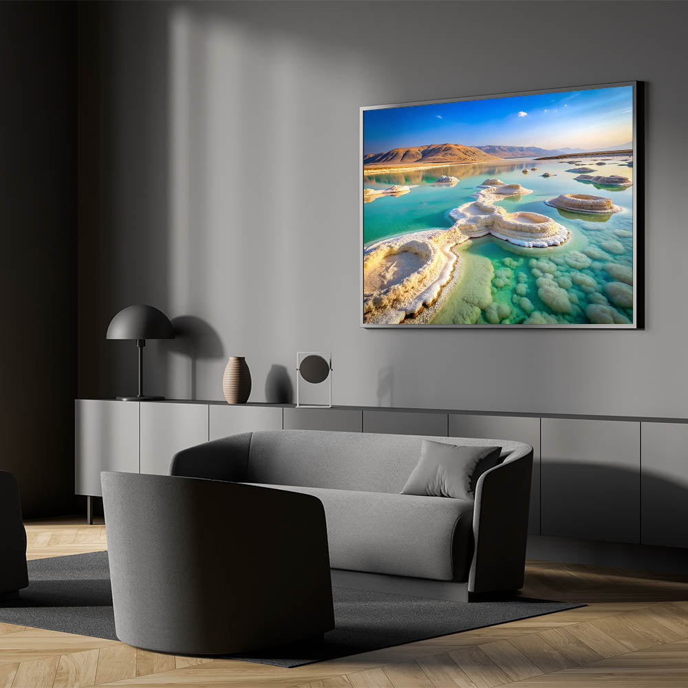 This piece of Dead Sea canvas art brings the tranquility of Israel’s natural landscapes into your home. The vibrant water, paired with the unique salt formations, creates a calming atmosphere that can enhance any space, from a living room to an office.