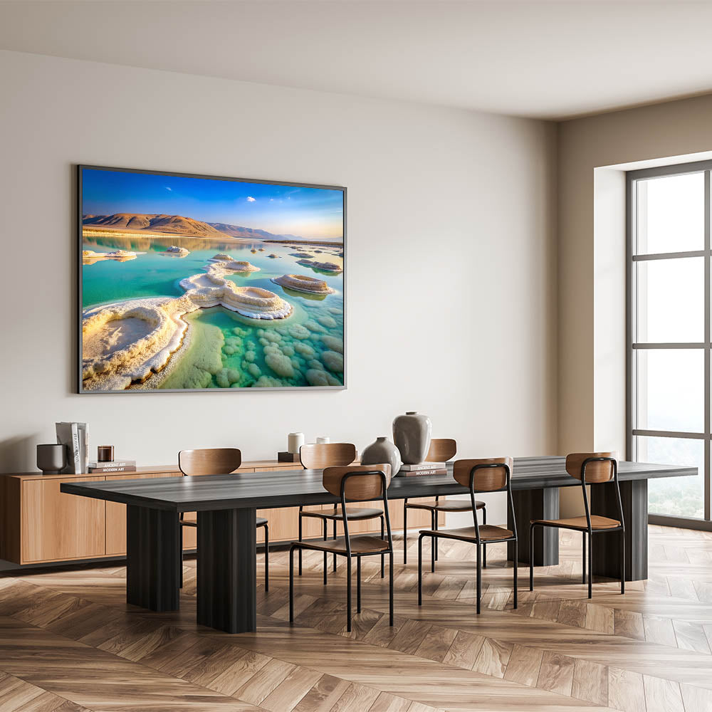 Enhance your space with this stunning canvas art, capturing the surreal beauty of the Dead Sea’s salt formations and vibrant turquoise waters. This striking photograph of Israel’s iconic Dead Sea showcases the natural wonder of the mineral-rich waters, set against the soft, golden hues of the surrounding desert mountains. The detailed salt formations add a unique and tranquil element, making this artwork a perfect focal point for any room.