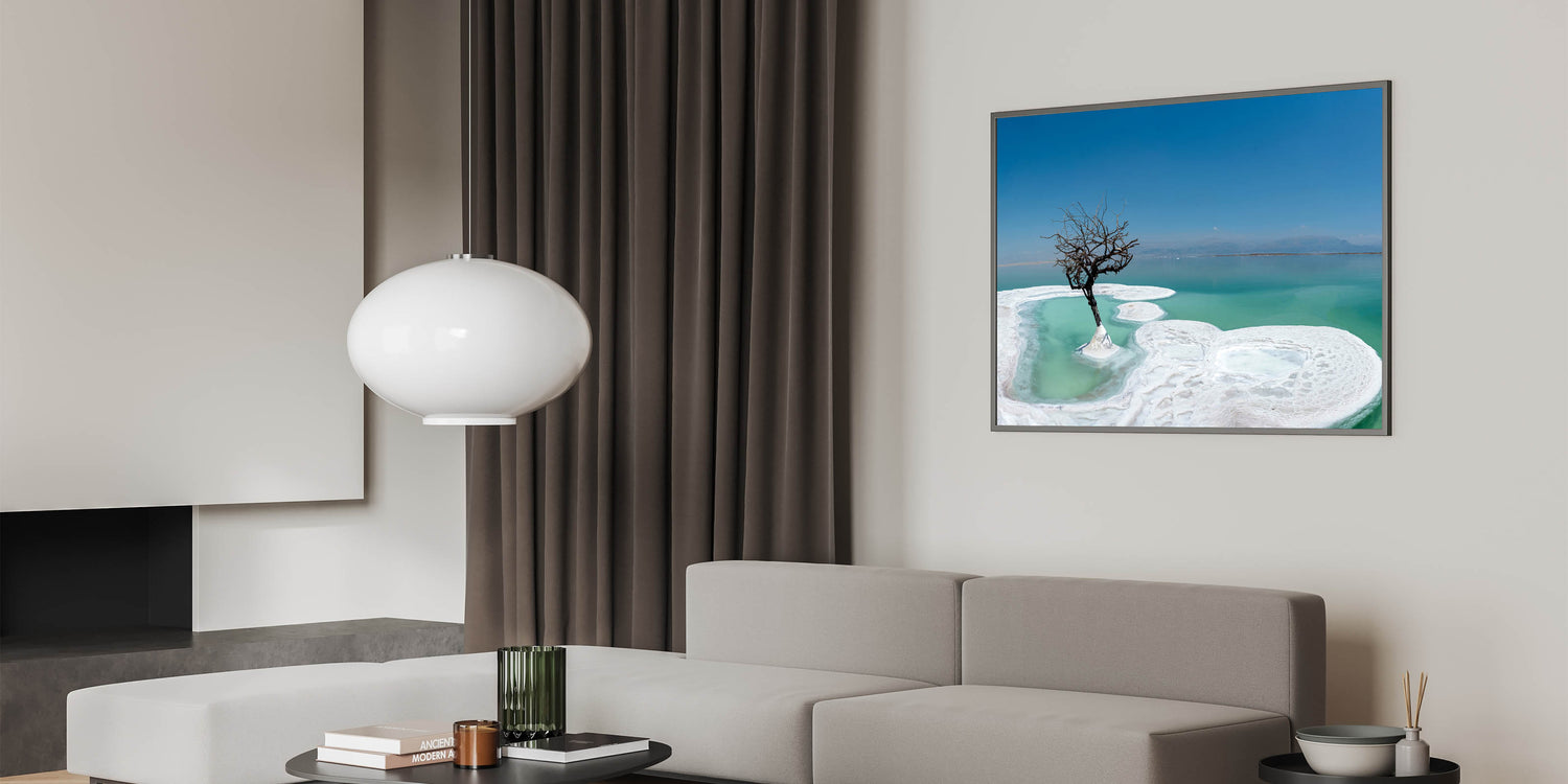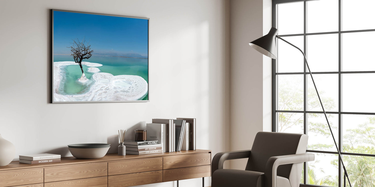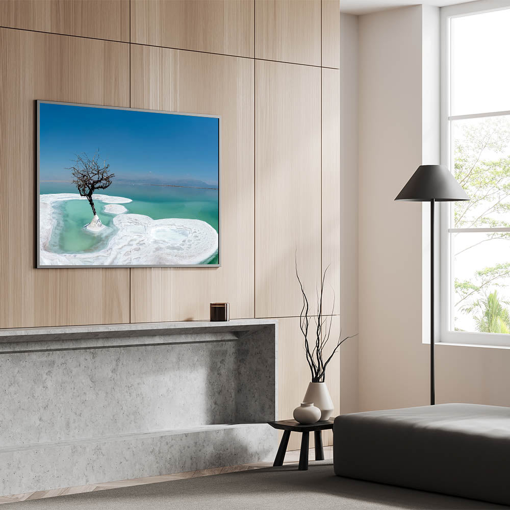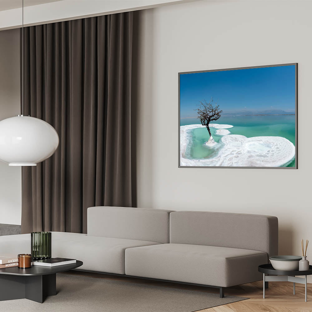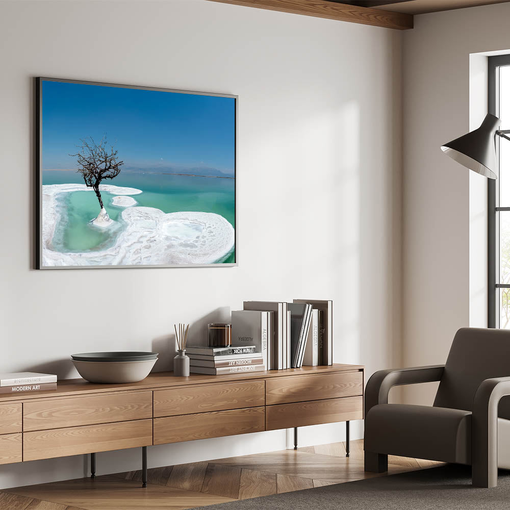 Experience the serenity of the Dead Sea with this captivating photography that showcases the stark beauty of a solitary tree on a salt island. Set against the vibrant turquoise waters of Israel’s Dead Sea, this art captures the tranquility of nature and the fascinating salt formations that define this unique landscape. The clear blue skies, calm waters, and striking contrast between the white salt and dark tree create an eye-catching and thought-provoking image perfect for any space.