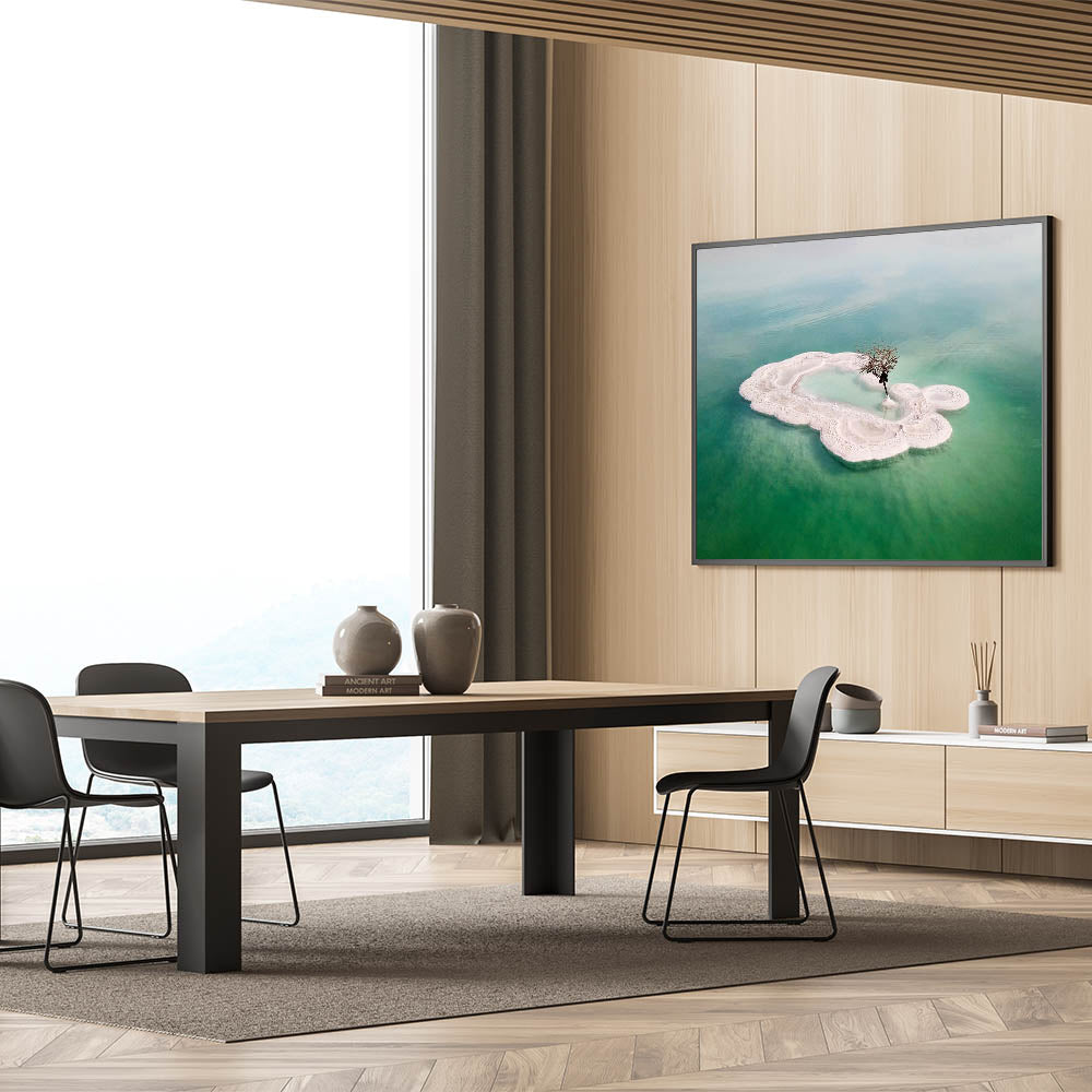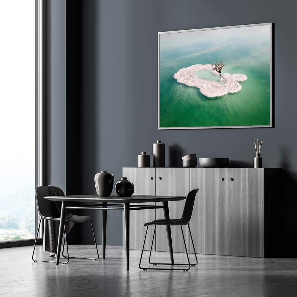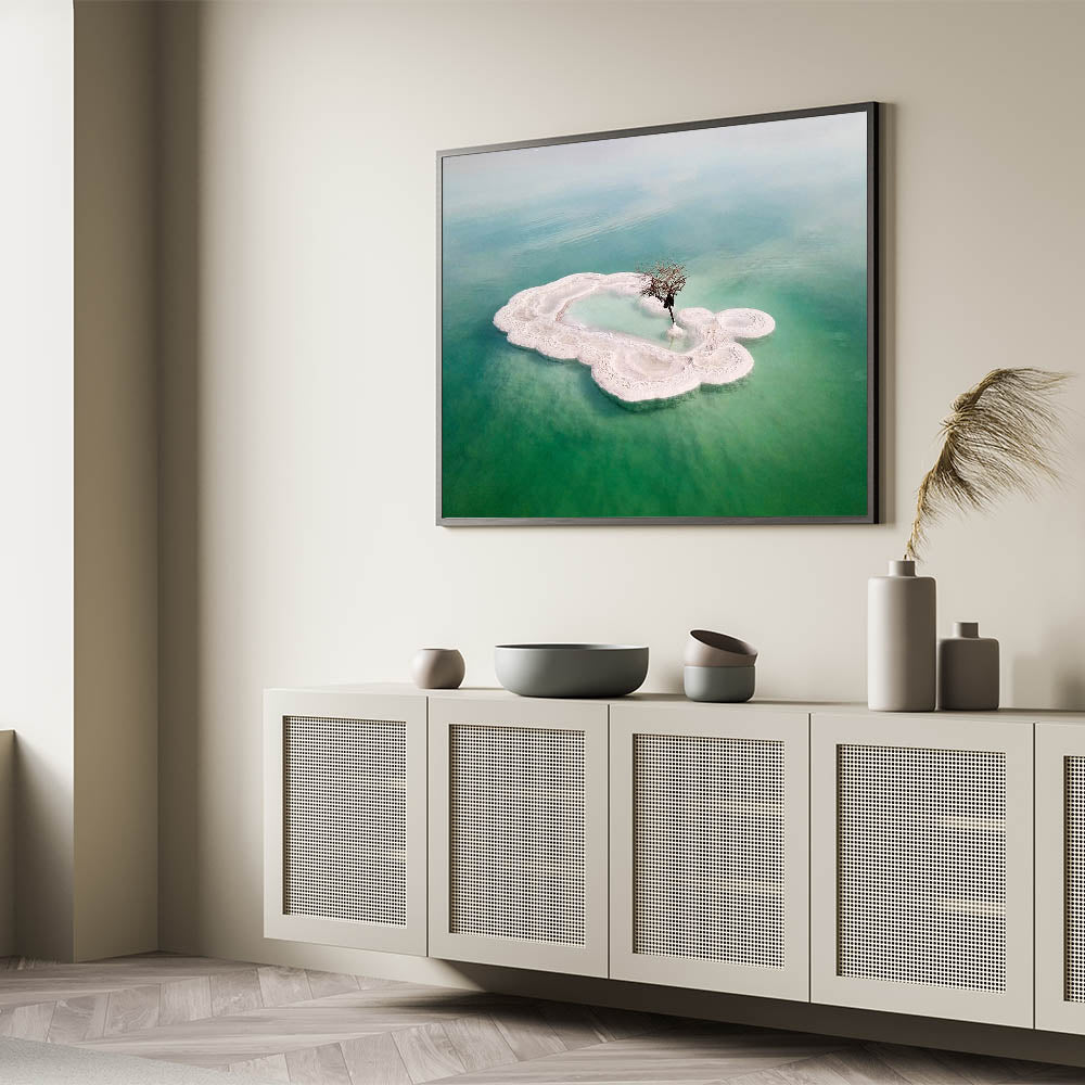 Capture the essence of the Dead Sea with this stunning photography that showcases Israel’s most unique and tranquil landscapes. This breathtaking image features a solitary tree on a salt island, surrounded by the calm, mineral-rich waters of the Dead Sea. The vibrant green and turquoise hues of the water create a peaceful and surreal atmosphere, making this artwork a perfect centerpiece for any modern home or office decor.