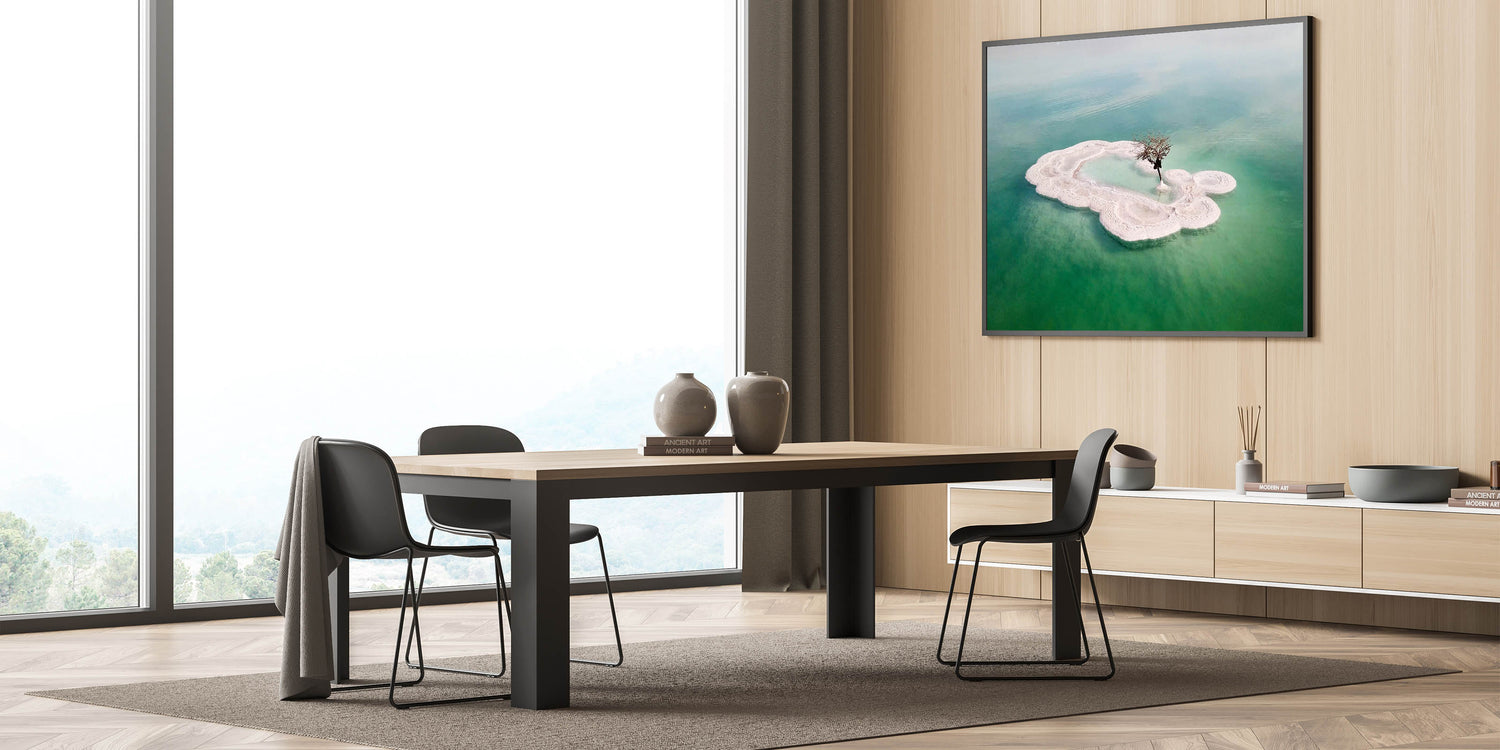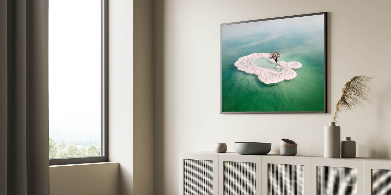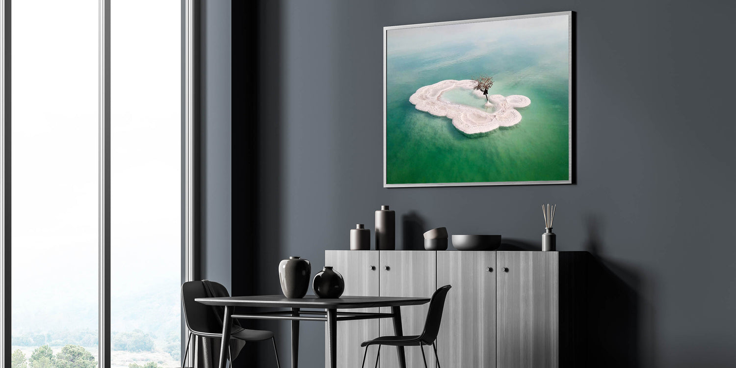 Capture the essence of the Dead Sea with this stunning photography that showcases Israel’s most unique and tranquil landscapes. This breathtaking image features a solitary tree on a salt island, surrounded by the calm, mineral-rich waters of the Dead Sea. The vibrant green and turquoise hues of the water create a peaceful and surreal atmosphere, making this artwork a perfect centerpiece for any modern home or office decor.