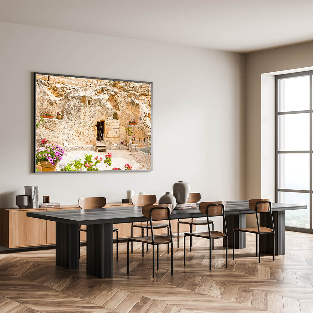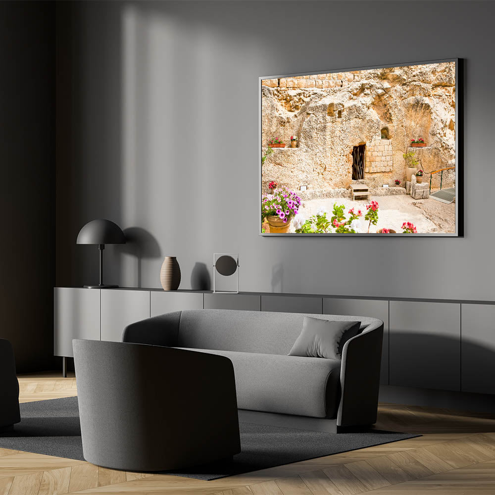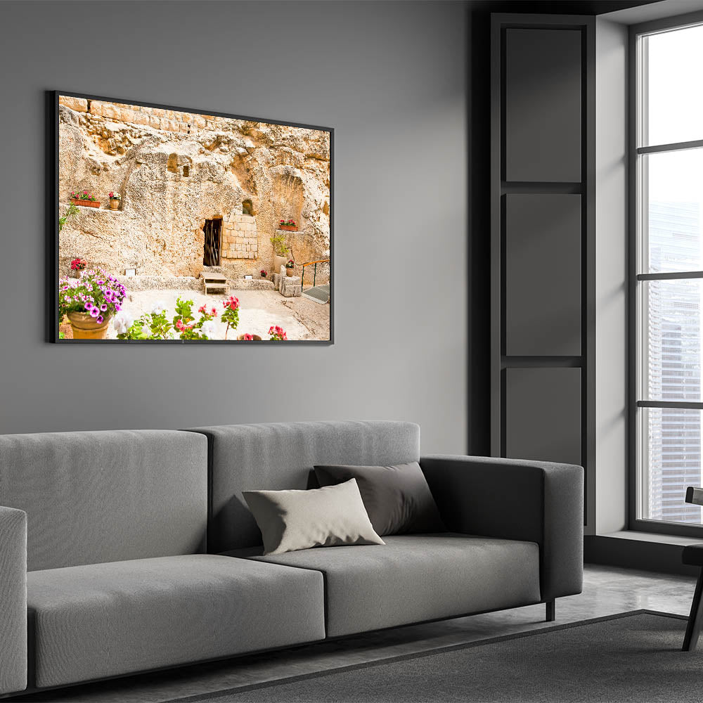 Add a serene and meaningful touch to your home with this beautiful depiction of the Garden Tomb in Jerusalem. This historic site, believed by many to be the burial place of Jesus, is captured in stunning detail with its ancient stone walls and peaceful floral arrangements. Perfect for those who admire historic Jerusalem artwork or Jerusalem landscape photography, this piece brings the beauty and spirituality of the Holy Land into any space.
