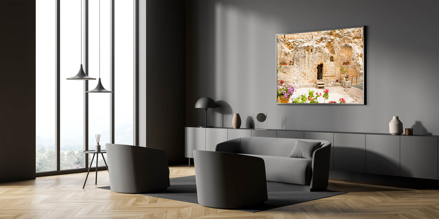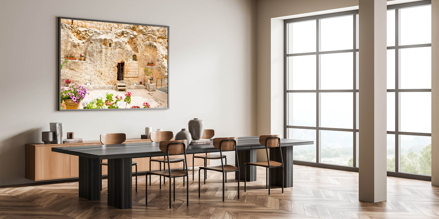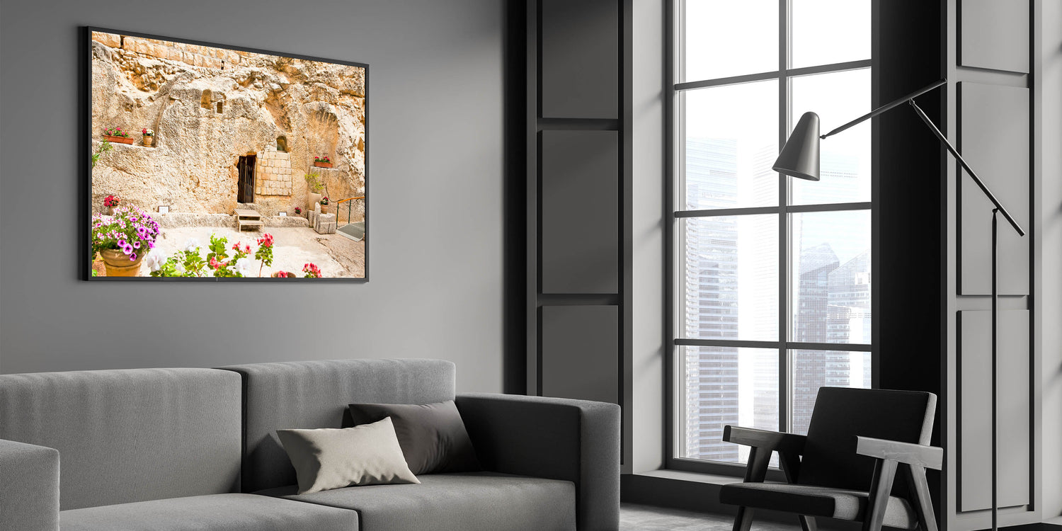 Add a serene and meaningful touch to your home with this beautiful depiction of the Garden Tomb in Jerusalem. This historic site, believed by many to be the burial place of Jesus, is captured in stunning detail with its ancient stone walls and peaceful floral arrangements. Perfect for those who admire historic Jerusalem artwork or Jerusalem landscape photography, this piece brings the beauty and spirituality of the Holy Land into any space.