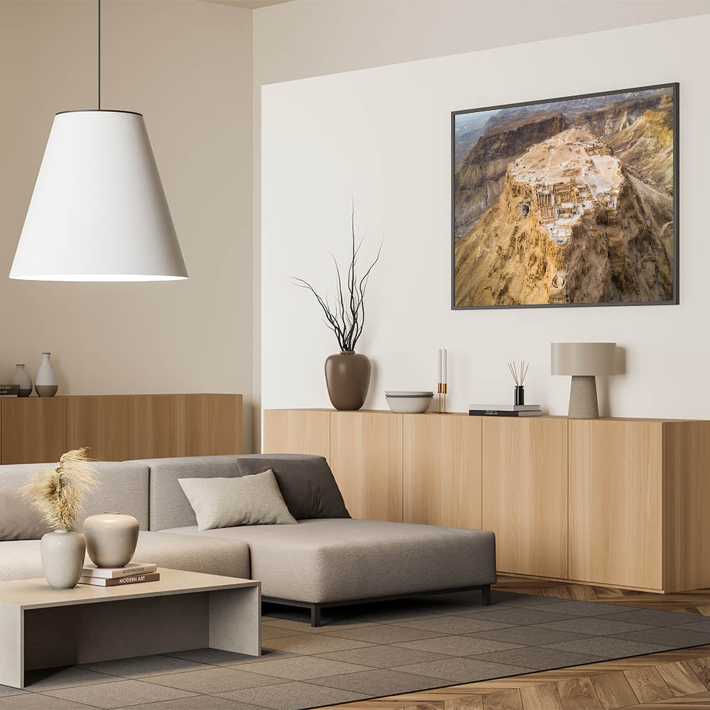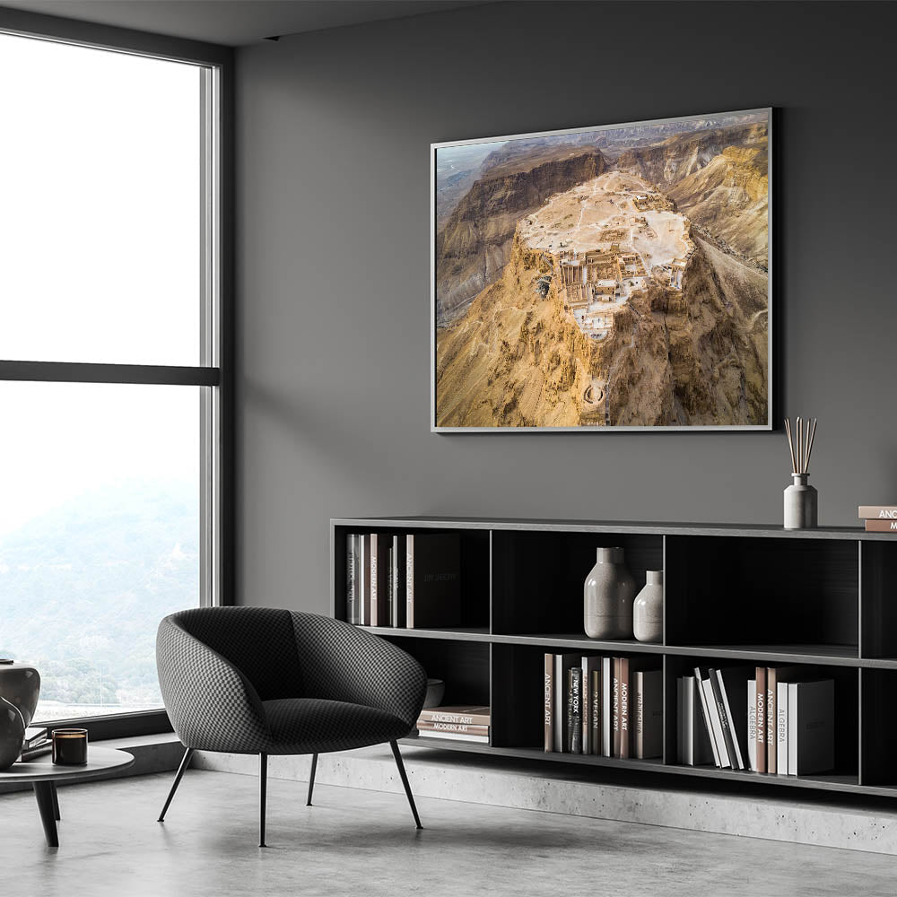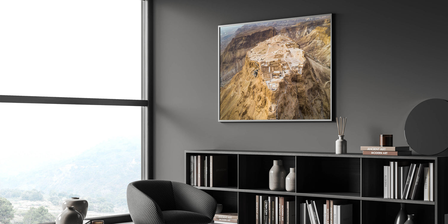 Explore the historical significance of Masada with this breathtaking aerial wall art, capturing the ancient fortress atop the rugged cliffs of Israel. This stunning piece of photography provides a unique perspective of one of Israel's most iconic sites, offering a glimpse into the architectural brilliance and historical depth of the Holy Land. Perfect for lovers of biblical art prints and Middle Eastern history, this artwork brings the grandeur of Masada into your home.