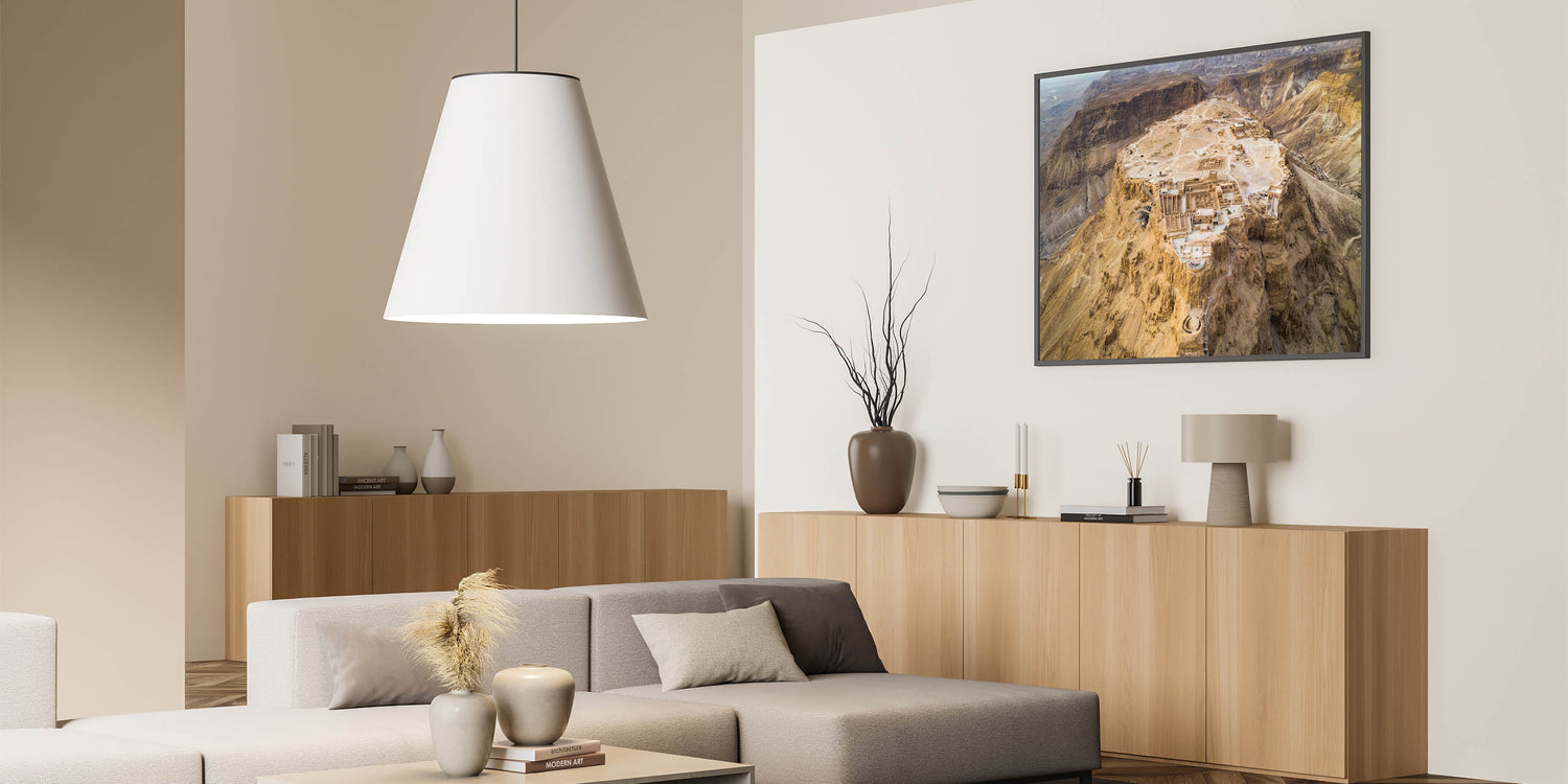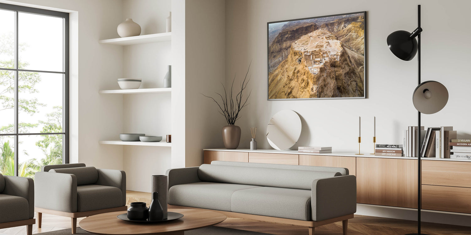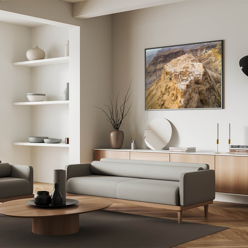 Explore the historical significance of Masada with this breathtaking aerial wall art, capturing the ancient fortress atop the rugged cliffs of Israel. This stunning piece of photography provides a unique perspective of one of Israel's most iconic sites, offering a glimpse into the architectural brilliance and historical depth of the Holy Land. Perfect for lovers of biblical art prints and Middle Eastern history, this artwork brings the grandeur of Masada into your home.