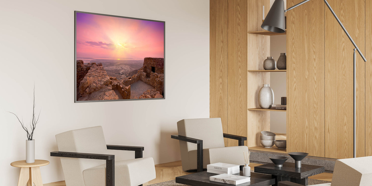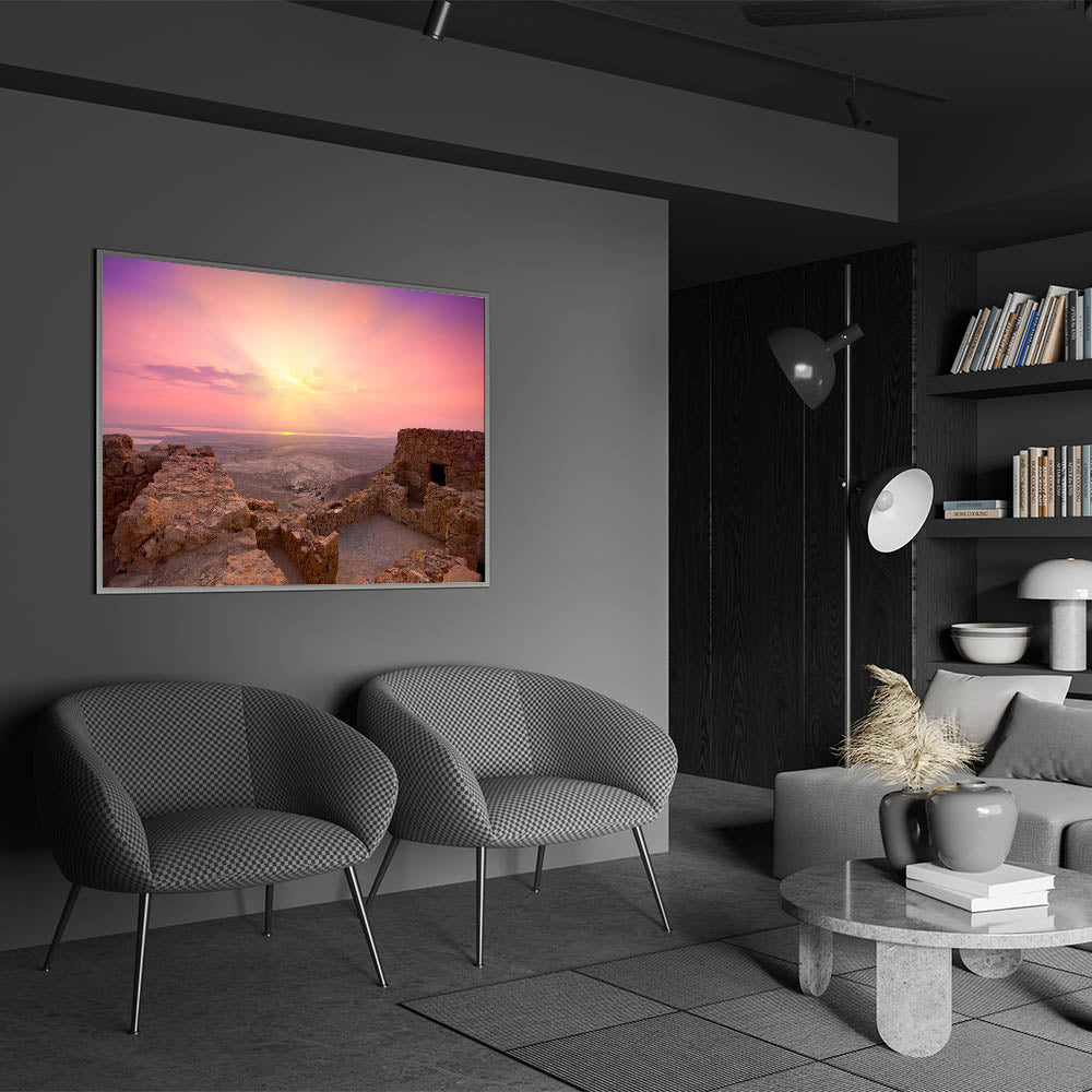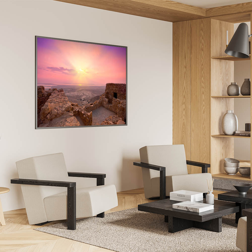 Experience the serenity of Israel’s ancient landscapes with this stunning wall art capturing a beautiful sunrise over the ruins of Jerusalem. This piece masterfully showcases the rugged beauty of the Holy Land, blending warm tones of the early morning light with the historic stone structures. It’s perfect for those who appreciate the natural beauty and cultural heritage of Israel and are looking to bring a piece of the Holy Land into their homes.