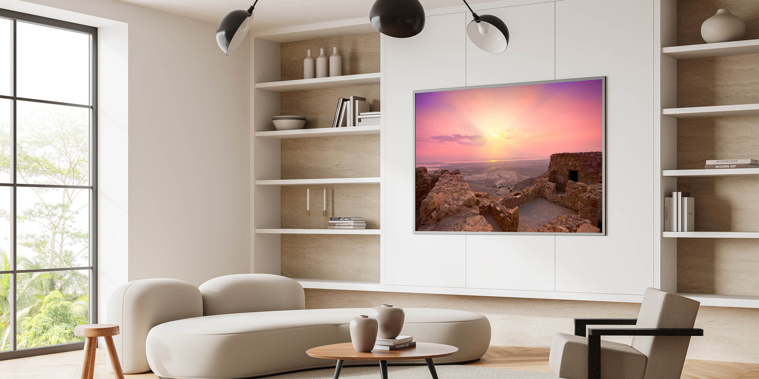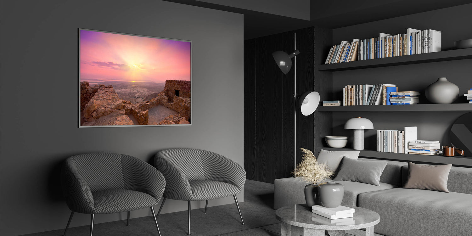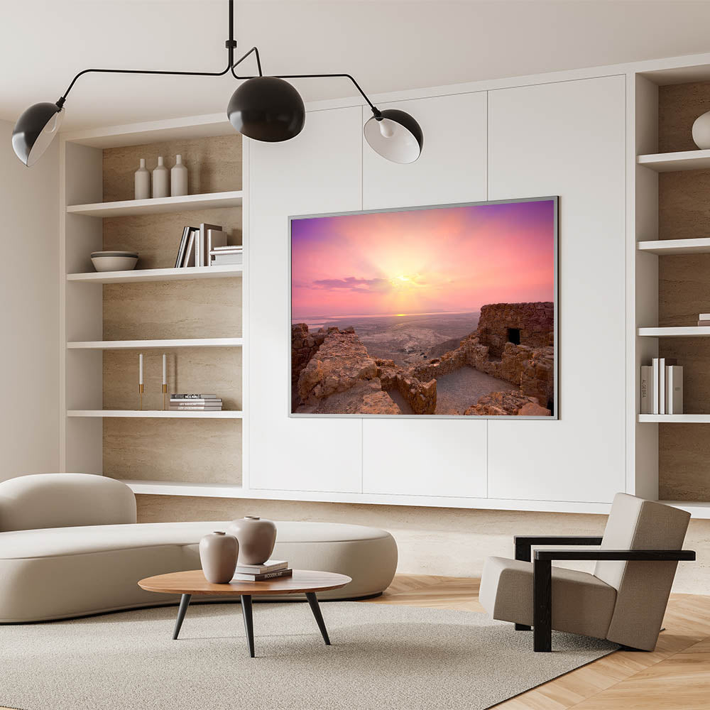 Experience the serenity of Israel’s ancient landscapes with this stunning wall art capturing a beautiful sunrise over the ruins of Jerusalem. This piece masterfully showcases the rugged beauty of the Holy Land, blending warm tones of the early morning light with the historic stone structures. It’s perfect for those who appreciate the natural beauty and cultural heritage of Israel and are looking to bring a piece of the Holy Land into their homes.