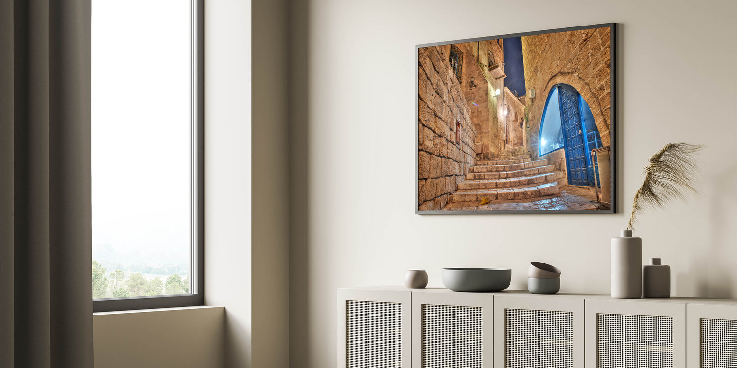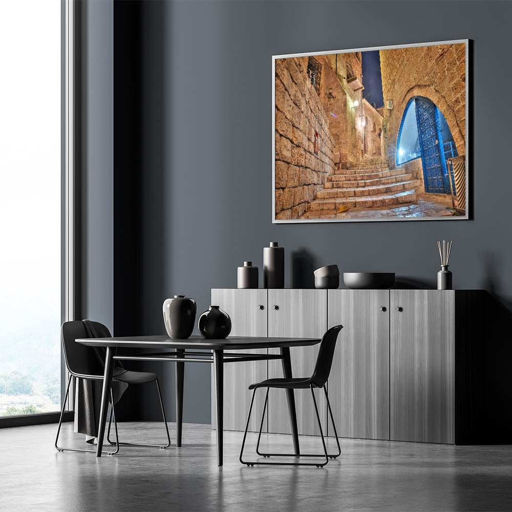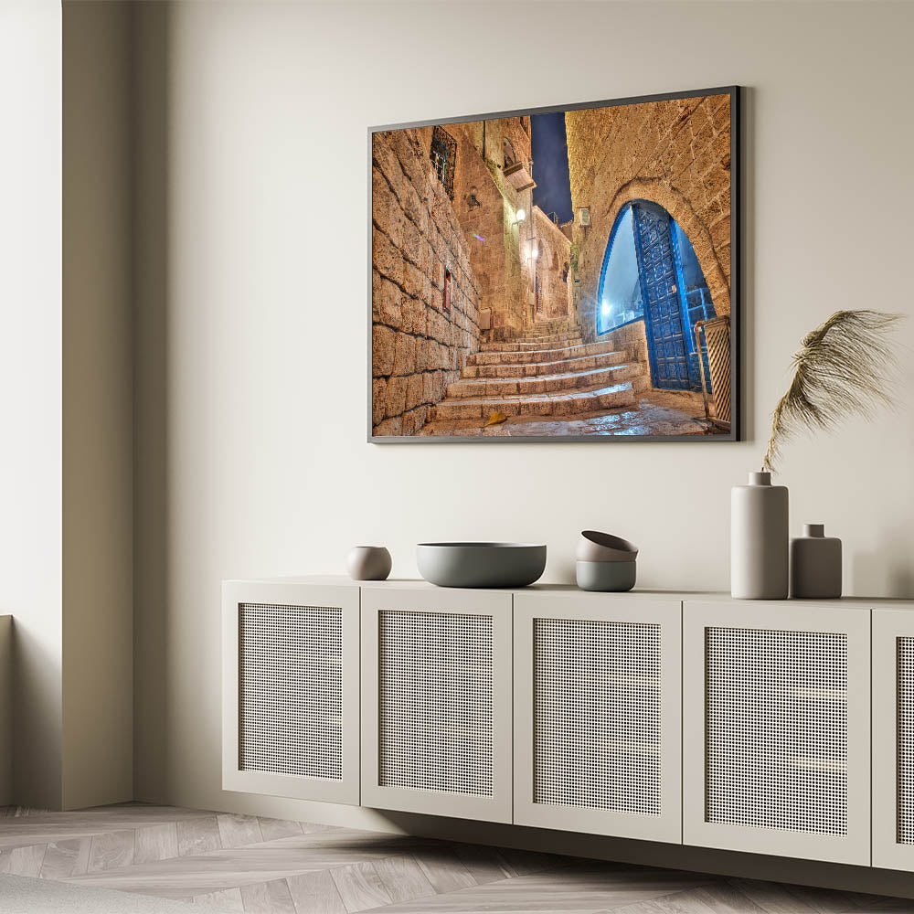 Step into the historic charm of Jaffa with this atmospheric Tel Aviv wall art. This artwork beautifully captures a stone alleyway at night, showcasing the ancient architecture of Jaffa with its weathered stone walls and archways. The softly glowing lights reflect off the stone steps, inviting you to take a journey through the winding streets of one of Tel Aviv’s most iconic neighborhoods. The blue accents of the windows and doors bring a subtle pop of color, adding to the captivating contrast of the warm stone and cool evening light.