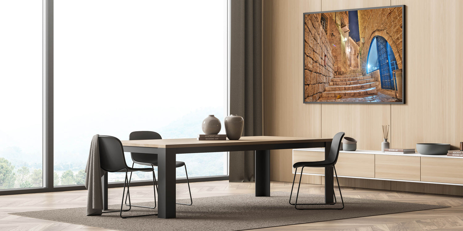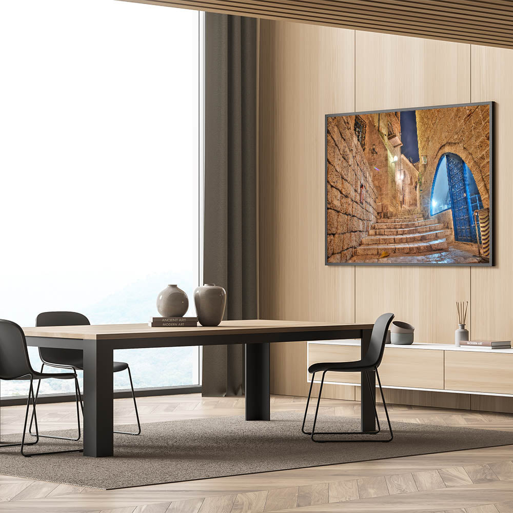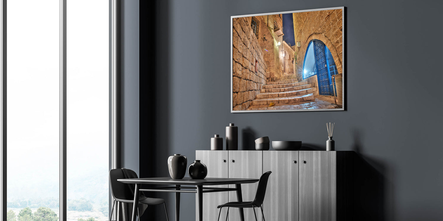 Step into the historic charm of Jaffa with this atmospheric Tel Aviv wall art. This artwork beautifully captures a stone alleyway at night, showcasing the ancient architecture of Jaffa with its weathered stone walls and archways. The softly glowing lights reflect off the stone steps, inviting you to take a journey through the winding streets of one of Tel Aviv’s most iconic neighborhoods. The blue accents of the windows and doors bring a subtle pop of color, adding to the captivating contrast of the warm stone and cool evening light.
