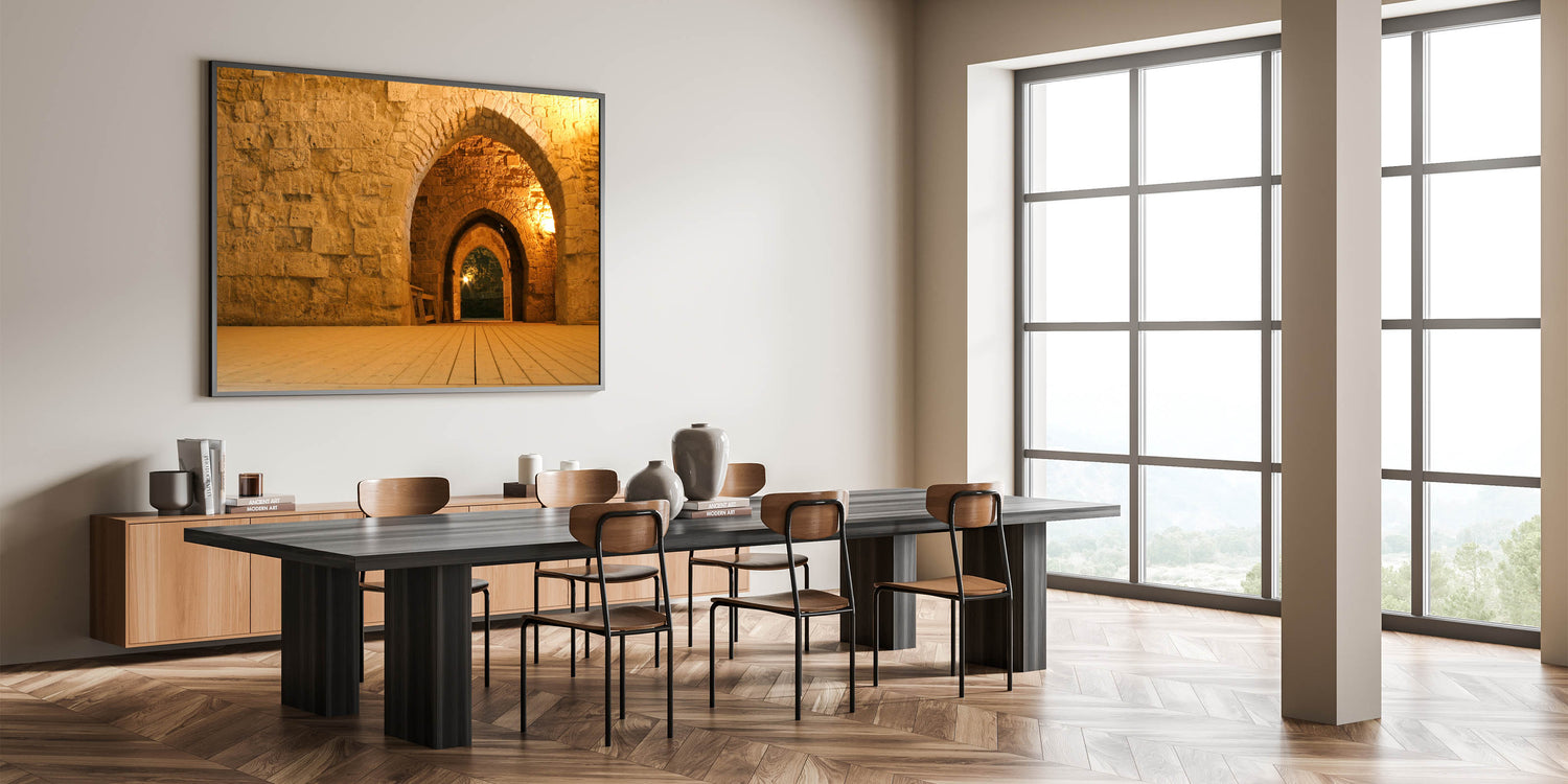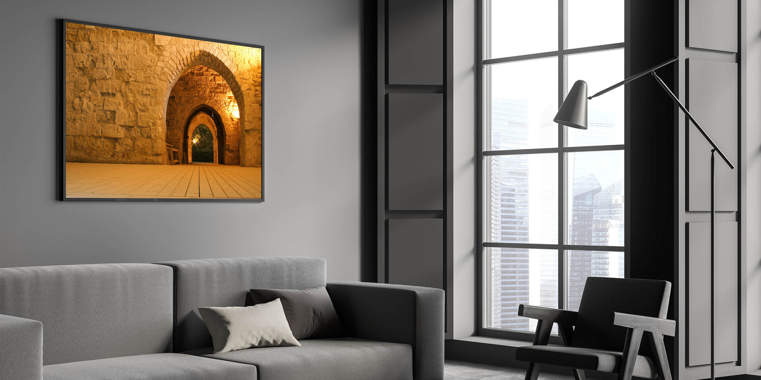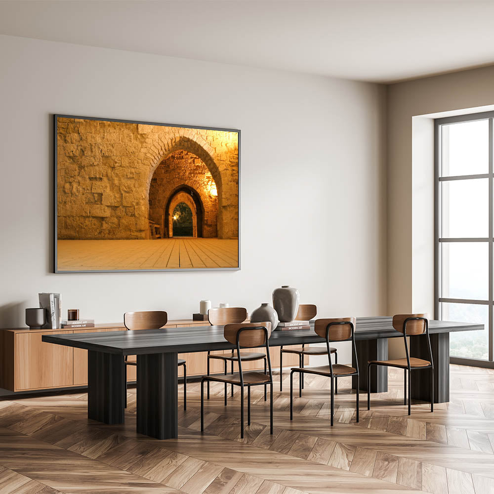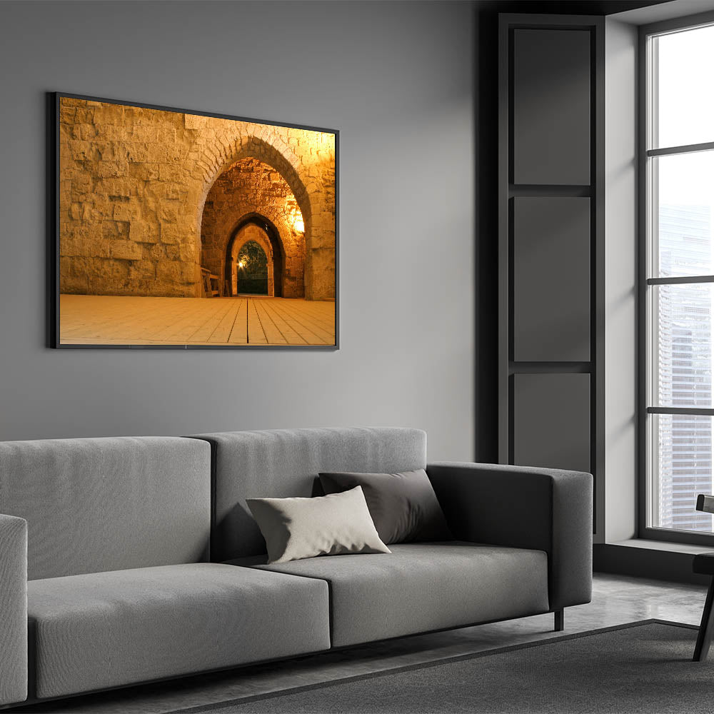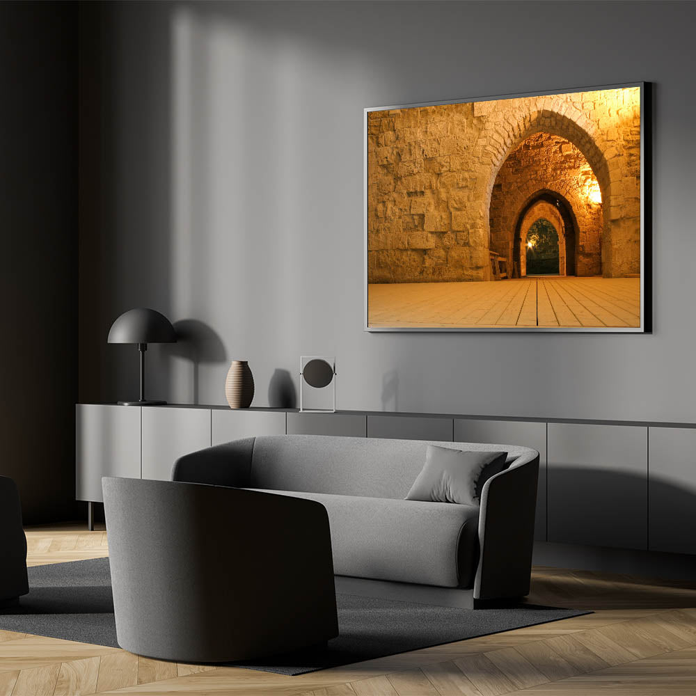Capture the essence of Jerusalem’s sacred architecture with this stunning Israel wall art. Featuring the timeless stone archways of ancient Jerusalem, this artwork evokes a deep sense of history and spirituality. The warm tones and textured stone reflect the rich heritage of the Holy Land, making this piece perfect for lovers of biblical art prints and Middle Eastern decor.