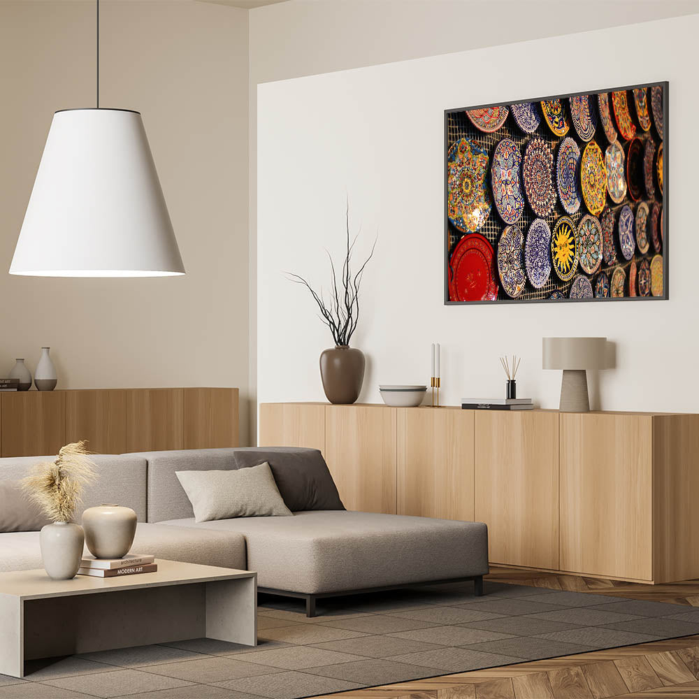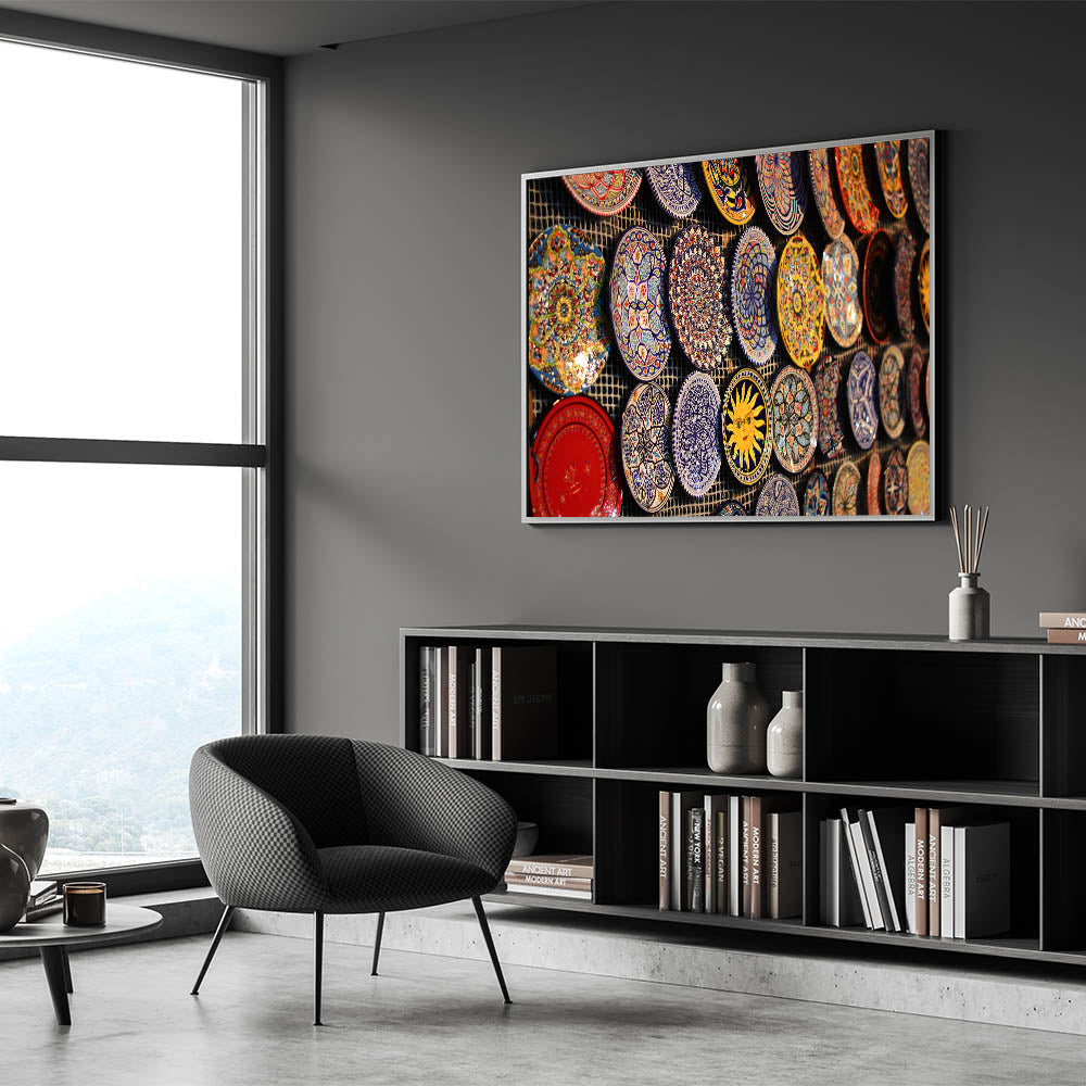 Add a splash of color and culture to your home with this stunning framed art, showcasing a vibrant display of hand-painted ceramic plates from Jerusalem. Each plate features intricate designs and bold colors, capturing the artistic heritage of the region. This piece is perfect for kitchens, dining rooms, or any space in need of a lively and authentic touch of Jerusalem’s craftmanship.