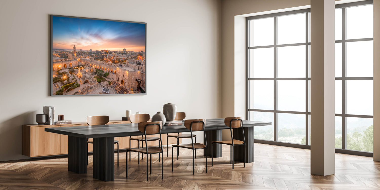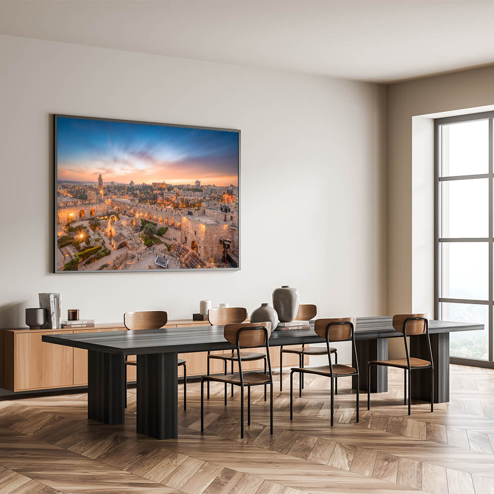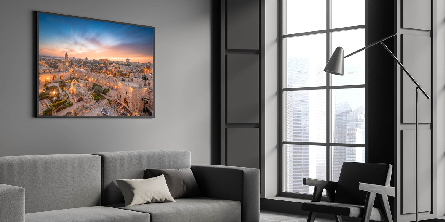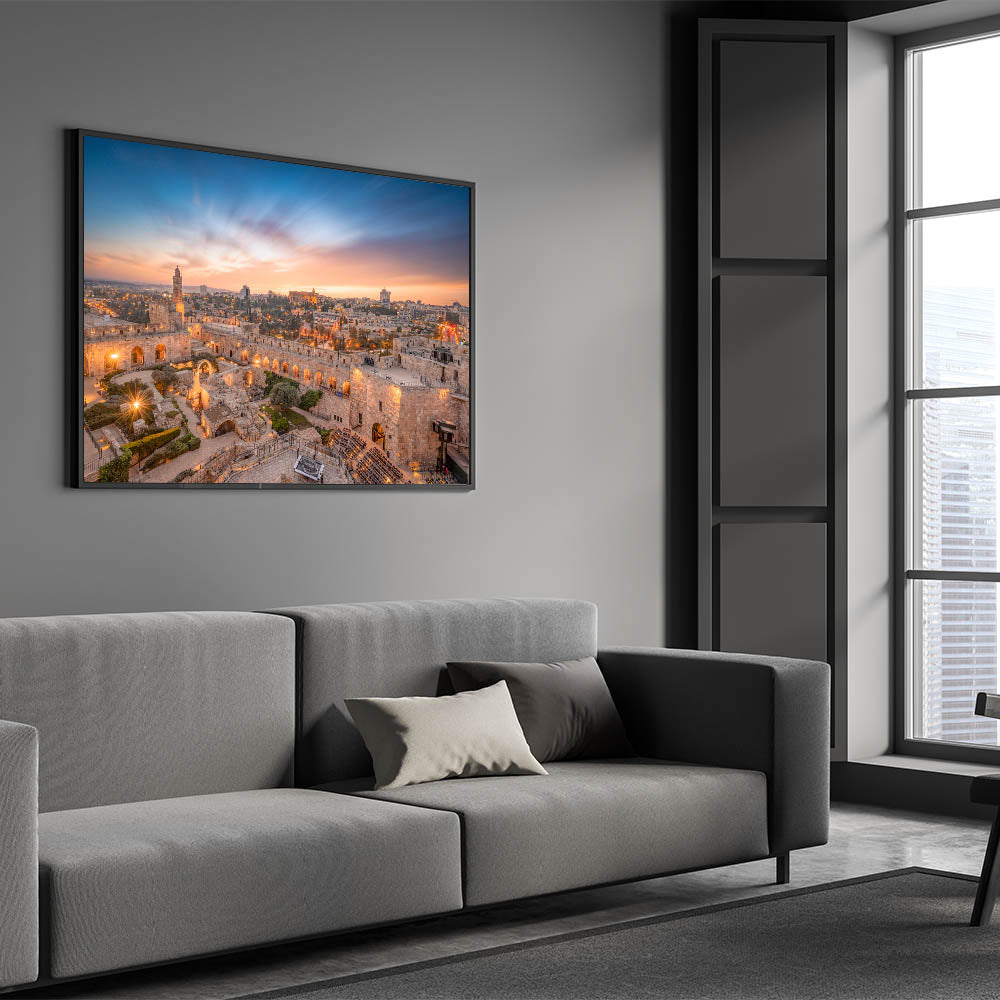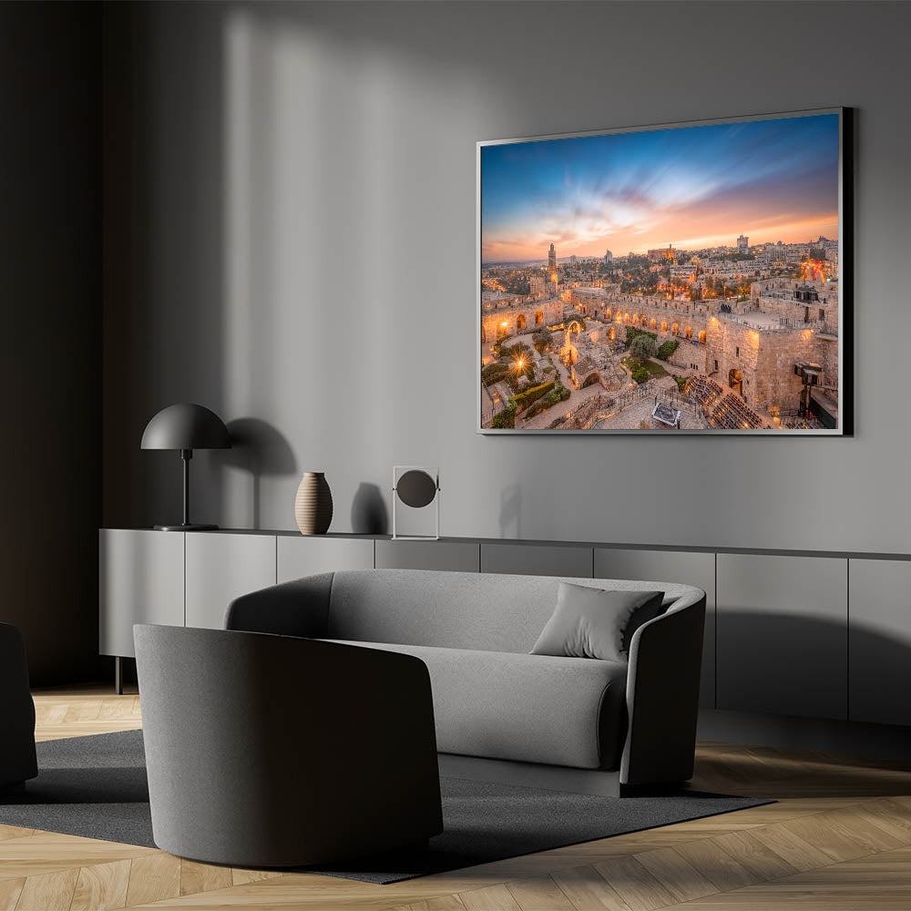 Celebrate the beauty of Jerusalem with this captivating sunset view of the Tower of David. Whether you're decorating your living room, gallery, or workspace, this timeless piece of art will add a touch of history and elegance to your decor.