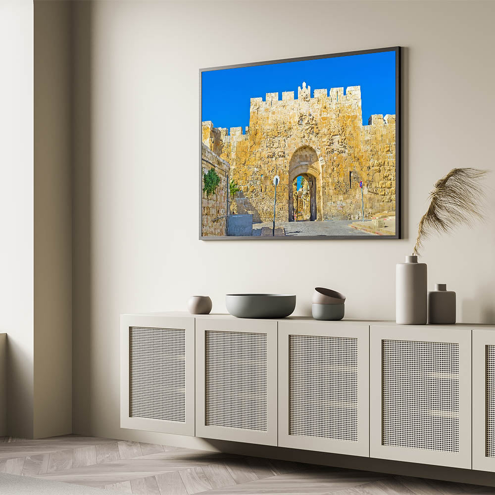 Celebrate the rich history of Jerusalem with this striking skyline print featuring one of the city’s iconic gates. The grand stone architecture, set against a clear blue sky, highlights the ancient beauty and significance of this historic landmark. Whether you are drawn to Jerusalem's architectural heritage or looking for a meaningful piece of wall art, this cityscape will add a timeless touch to any space.