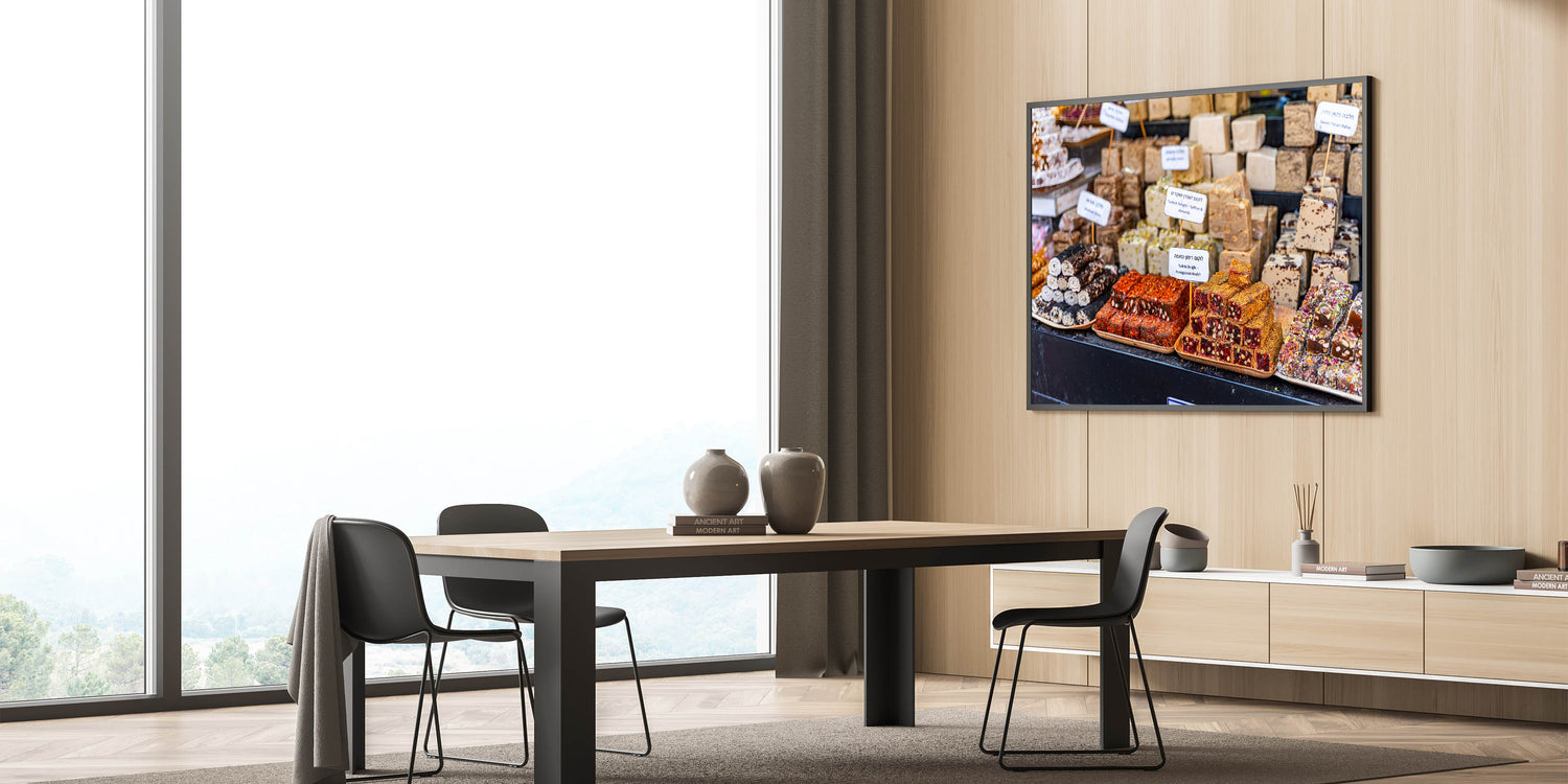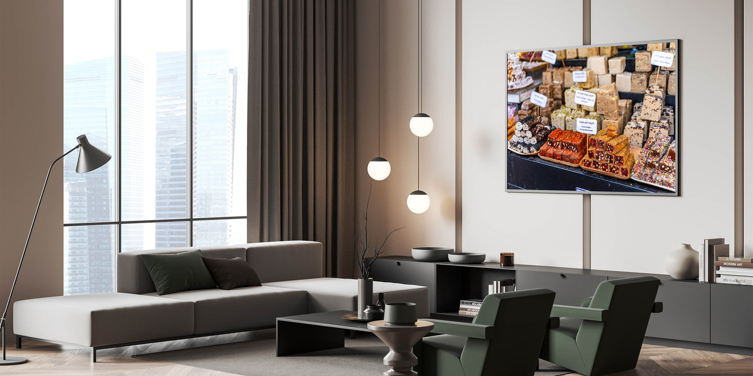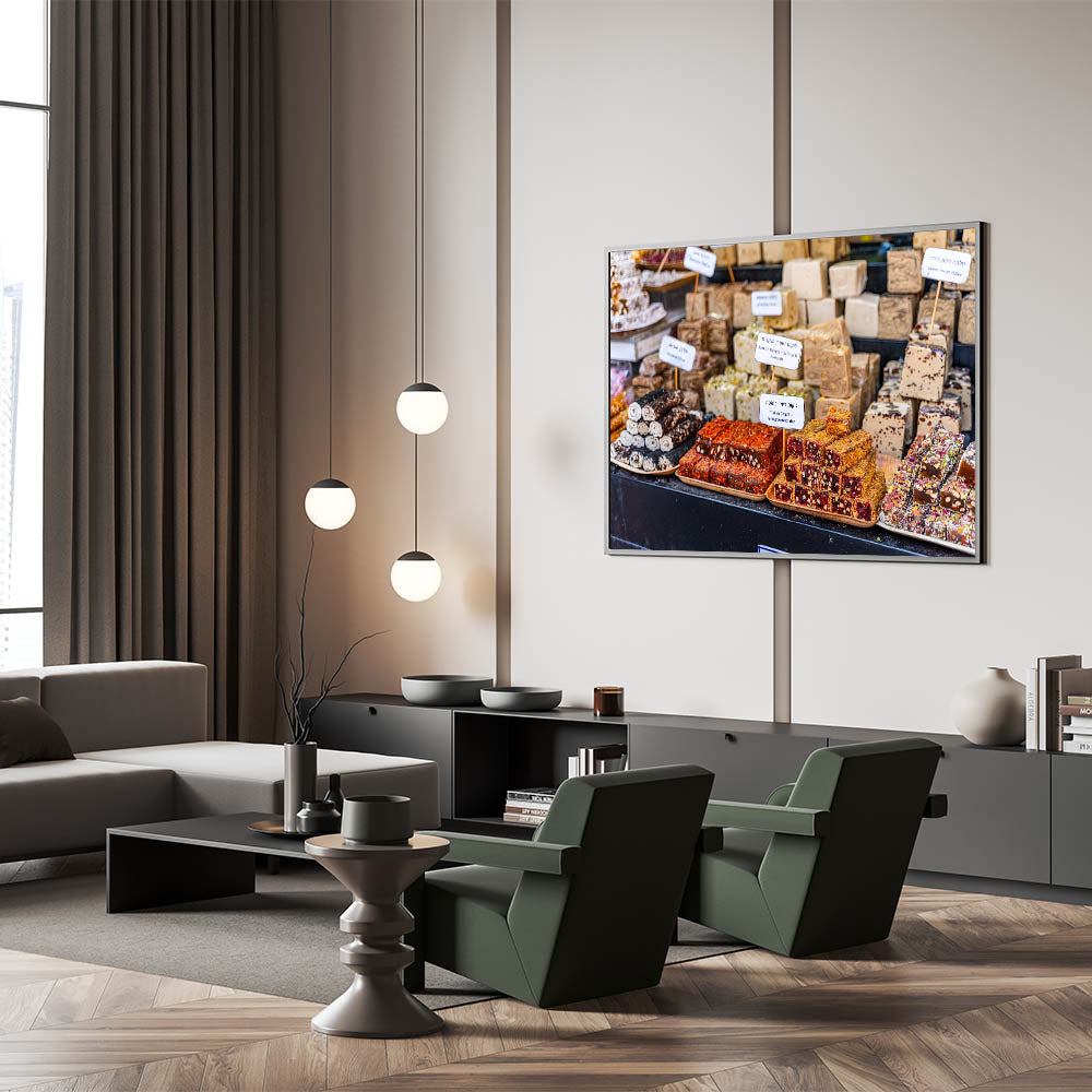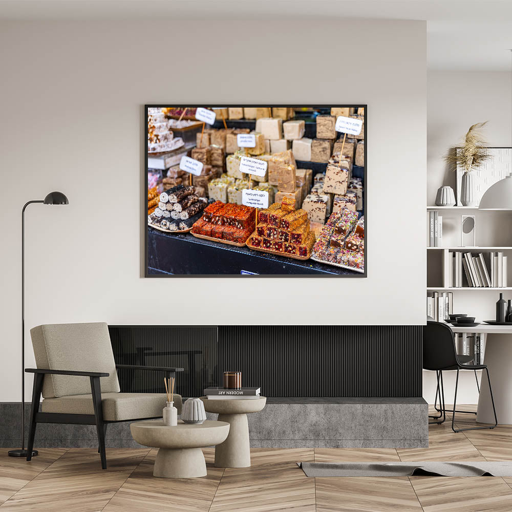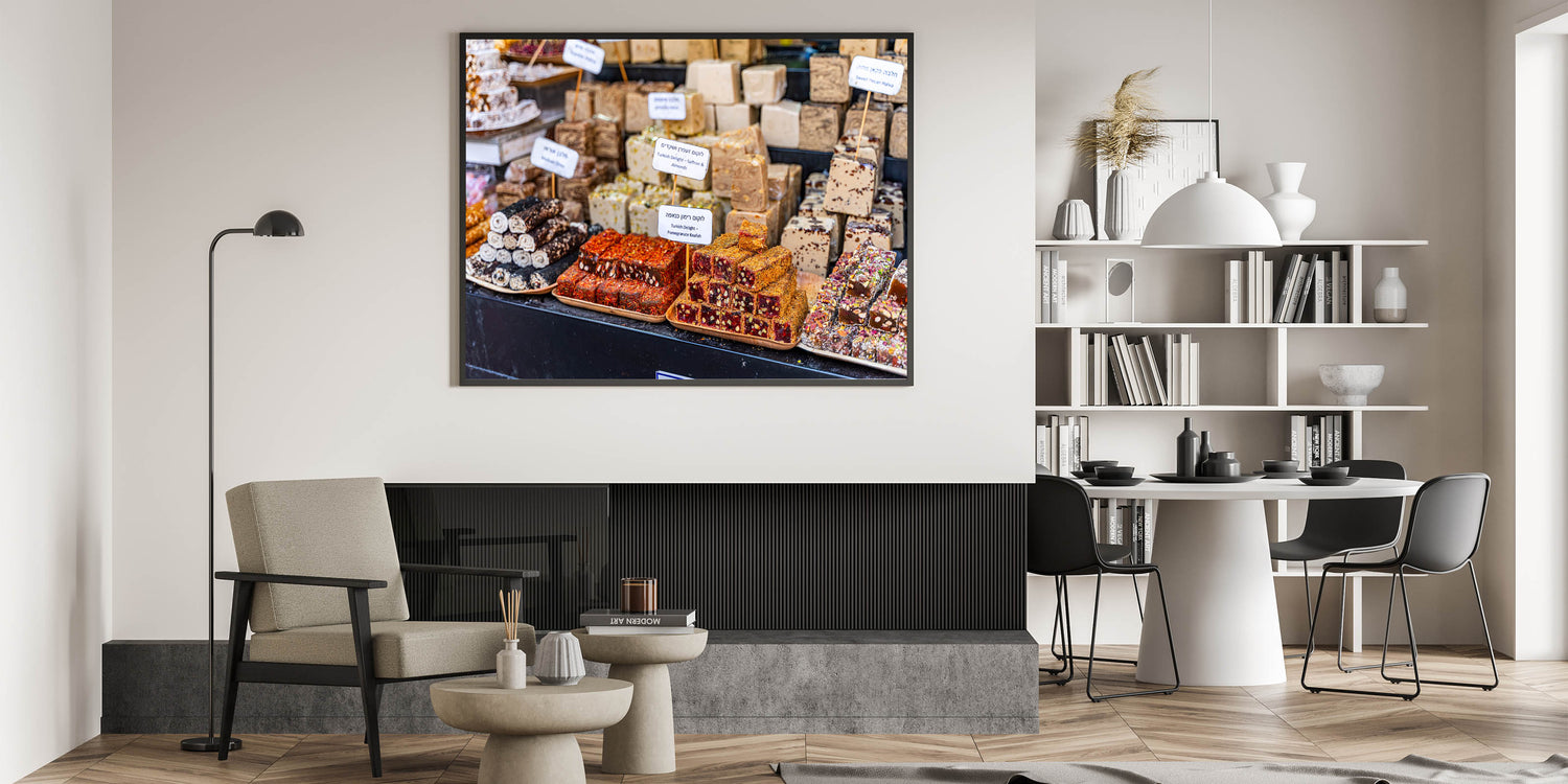 Capture the vibrant and delicious essence of Jerusalem’s markets with this stunning photography decor, featuring an array of Turkish delights and halva blocks. This beautiful image showcases the rich colors, textures, and flavors of the Middle East, offering a visual feast for the senses. Perfect for kitchens, cafes, or dining rooms, this art piece brings the lively atmosphere of Jerusalem's market to your space, infusing it with culture and warmth.