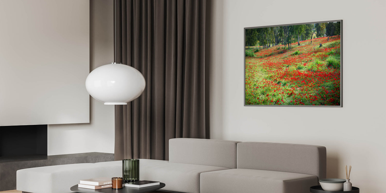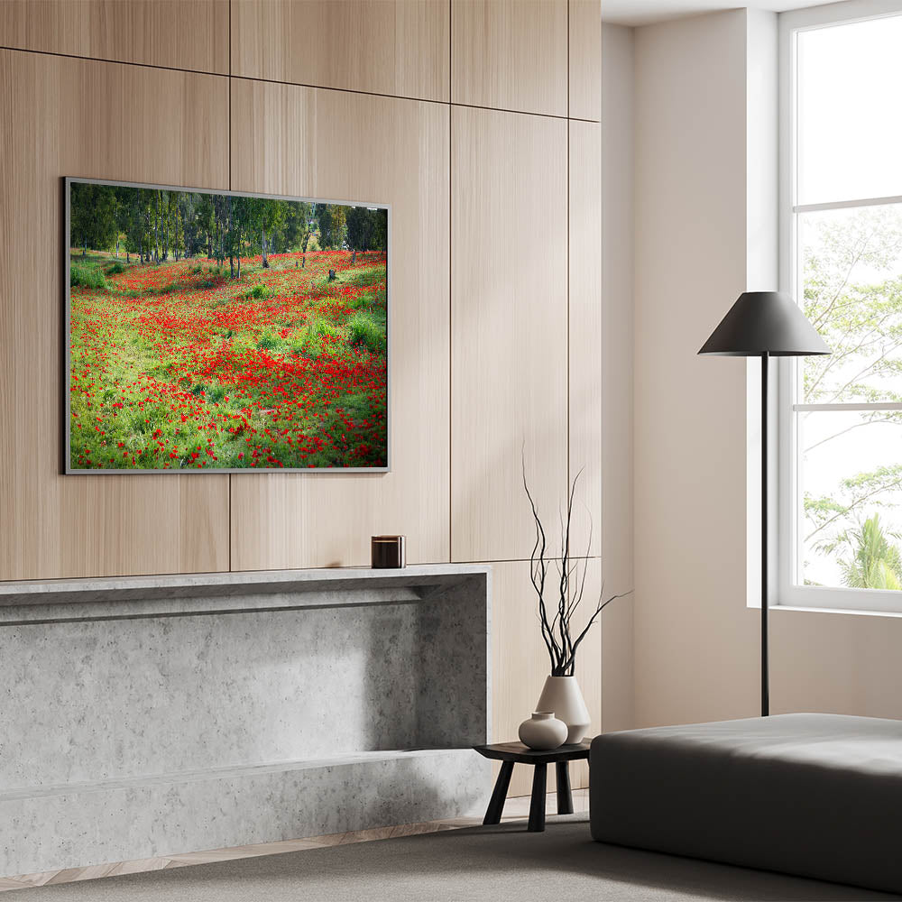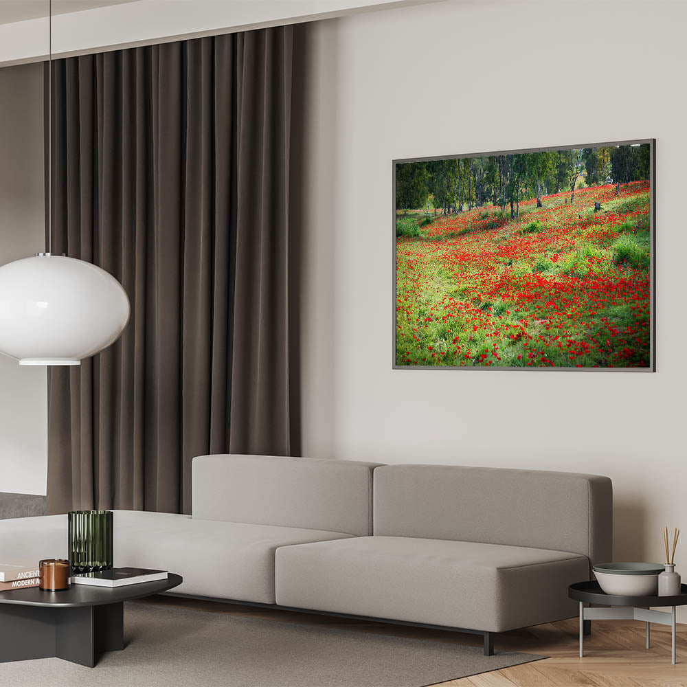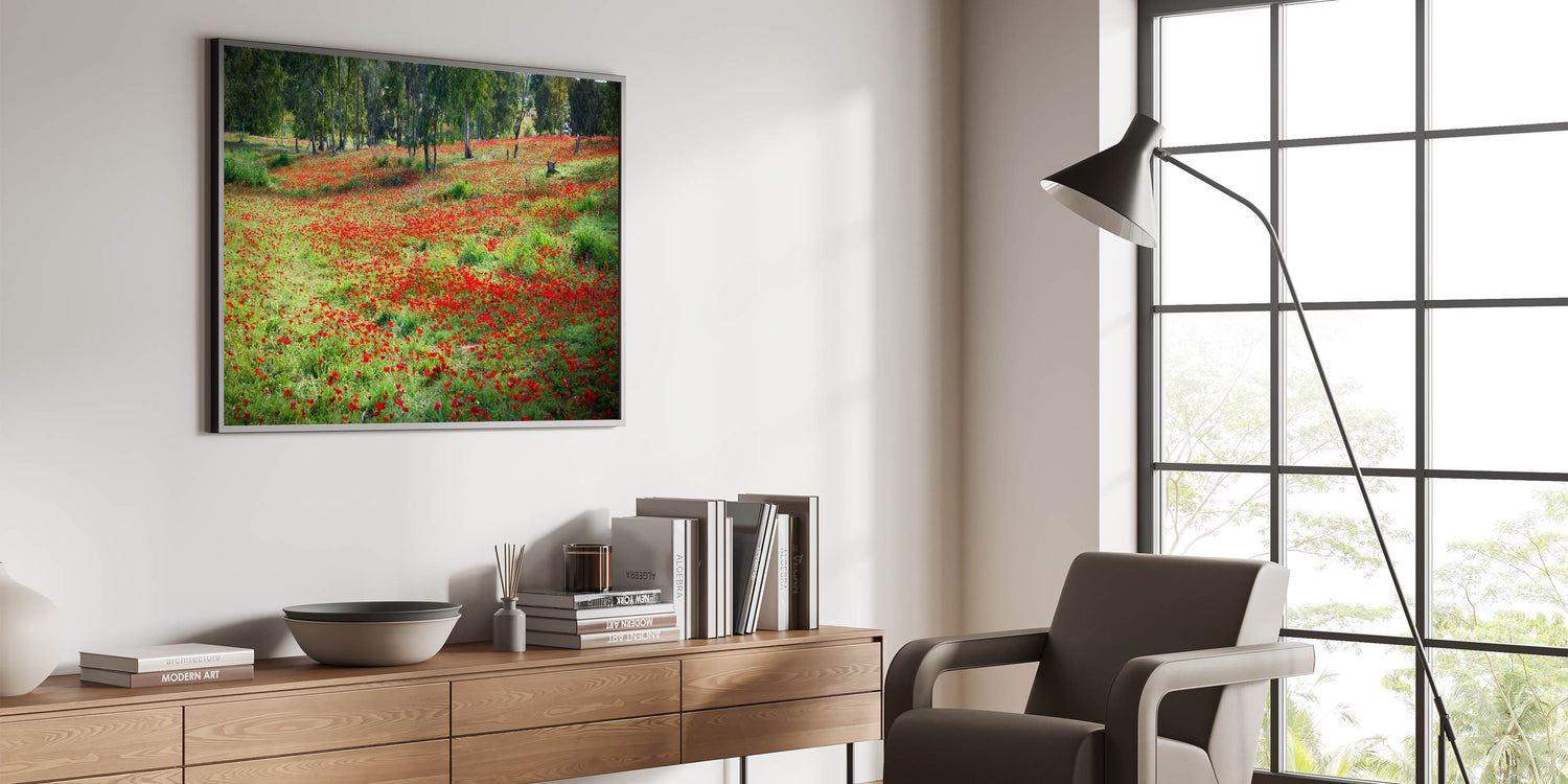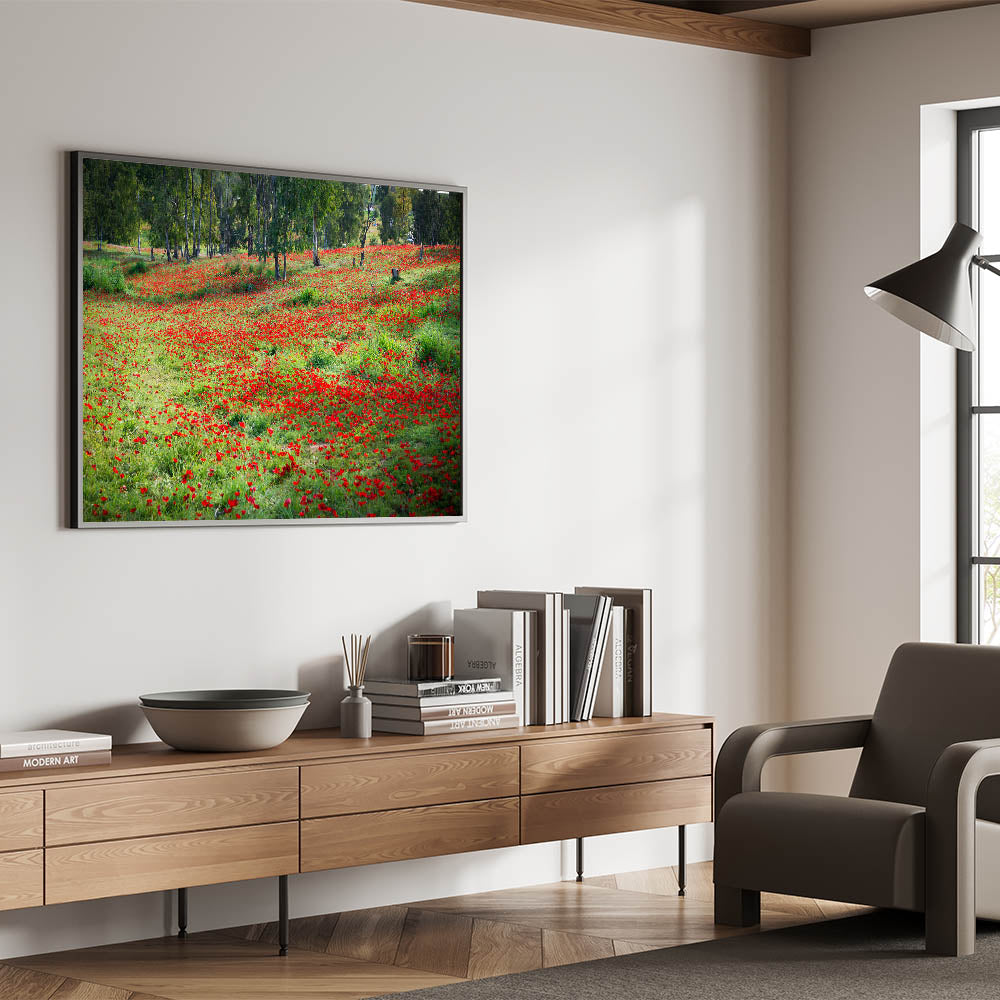 Bring the vibrant beauty of Israel’s countryside into your home with this stunning wall art, capturing a field of bright red flowers stretching across lush greenery. This striking piece of scenic Israel photography showcases the natural beauty and peaceful ambiance of Israel’s landscapes, making it the perfect addition to any room seeking to evoke tranquility and nature’s vivid colors. The blooming flowers create a captivating contrast against the deep greens of the surrounding trees, offering a sense of life and renewal.