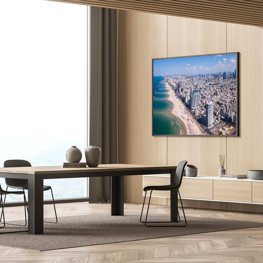 Perfect for lovers of Tel Aviv cityscape art and Mediterranean coast artwork, this piece offers a unique aerial perspective of the city and its famous beaches. Whether you are decorating a living room, office, or gallery, this Tel Aviv wall decor adds a modern yet serene element to any space, celebrating the iconic beauty of one of Israel's most vibrant cities.