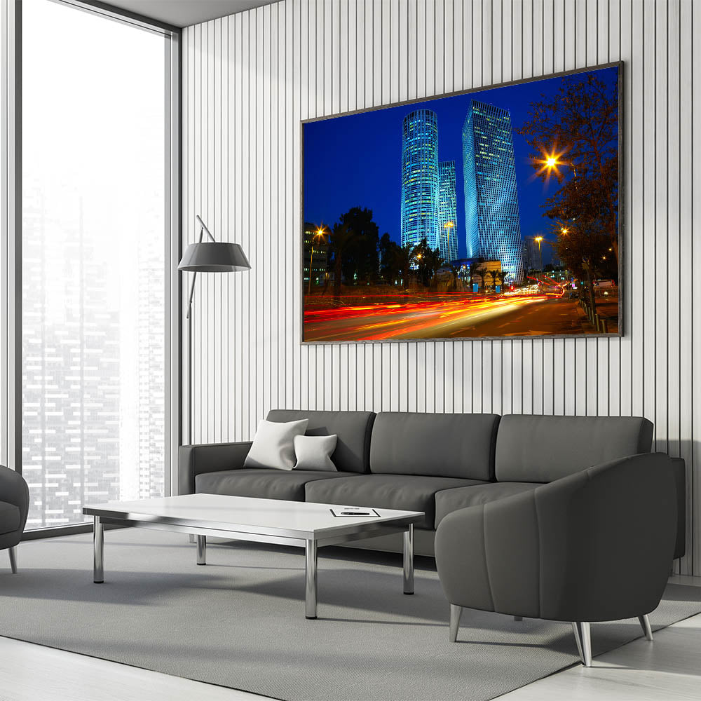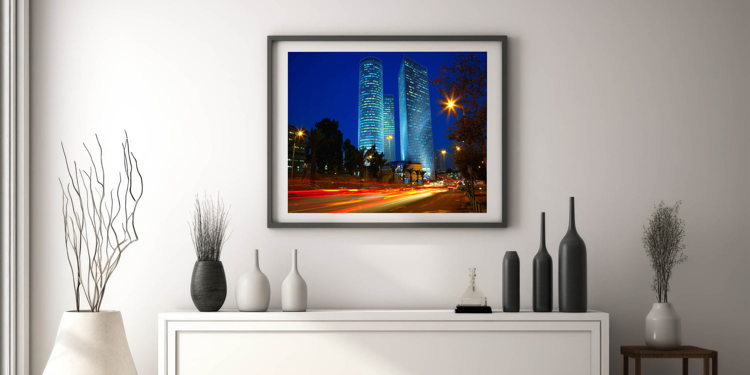 Whether you’re looking to enhance your living room or office, this vibrant Tel Aviv wall decor is ideal for lovers of Tel Aviv cityscape art and modern architectural prints. The combination of urban energy and architectural beauty makes this piece a must-have for any modern art collection.