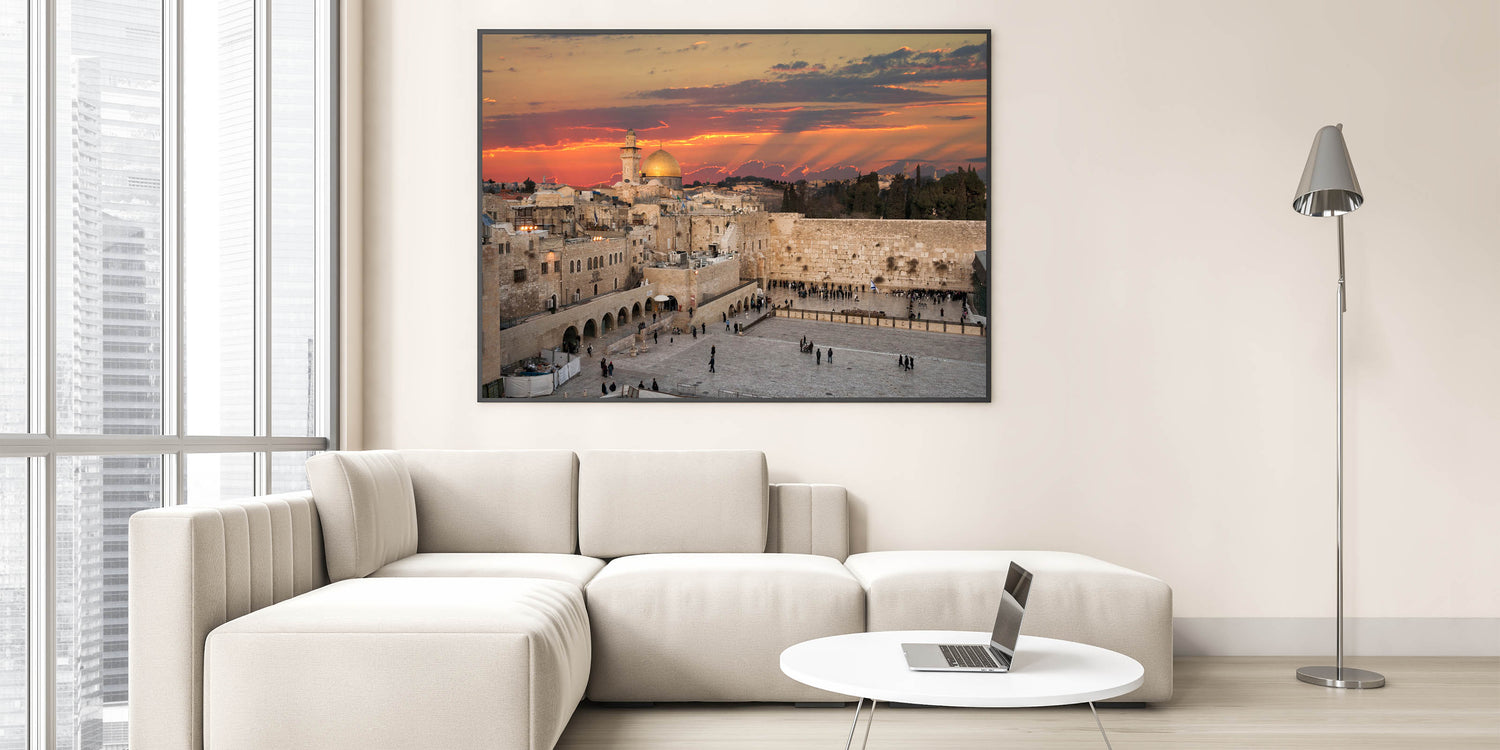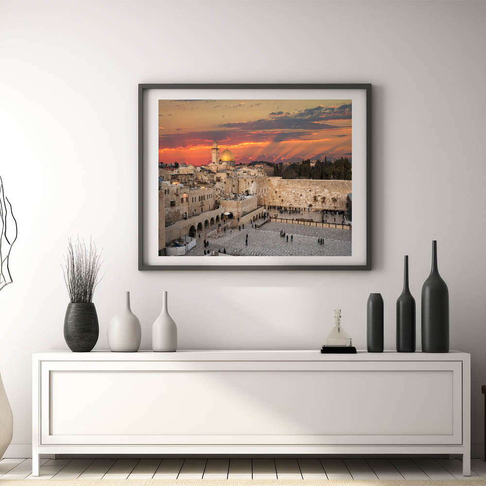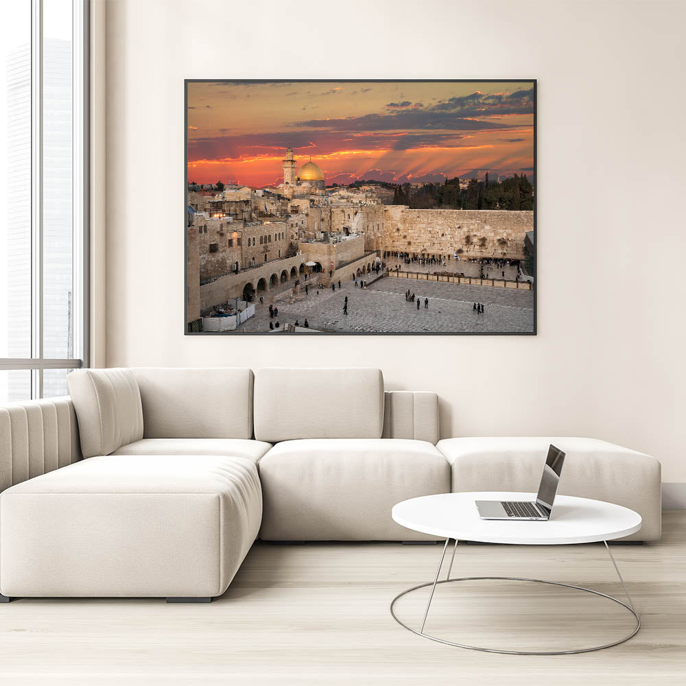 Capture the breathtaking beauty of Jerusalem with this stunning sunset wall art featuring the iconic Western Wall and Dome of the Rock. This panoramic scene highlights the historic landmarks of Jerusalem, making it a perfect addition to any room seeking a blend of history and elegance. The vibrant colors of the setting sun provide a striking contrast against the ancient stones, creating a timeless artistic view of Jerusalem.