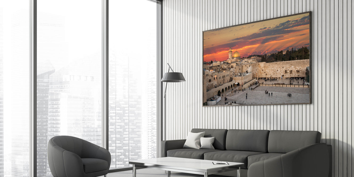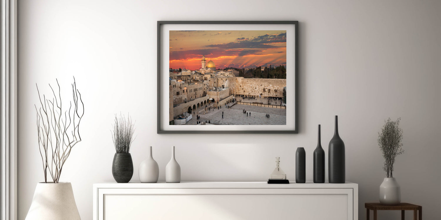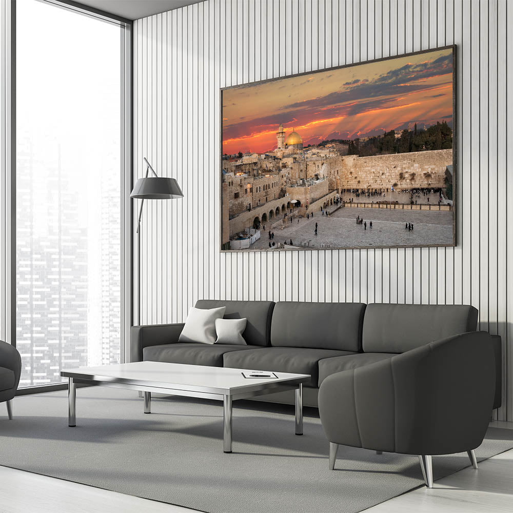 Capture the breathtaking beauty of Jerusalem with this stunning sunset wall art featuring the iconic Western Wall and Dome of the Rock. This panoramic scene highlights the historic landmarks of Jerusalem, making it a perfect addition to any room seeking a blend of history and elegance. The vibrant colors of the setting sun provide a striking contrast against the ancient stones, creating a timeless artistic view of Jerusalem.