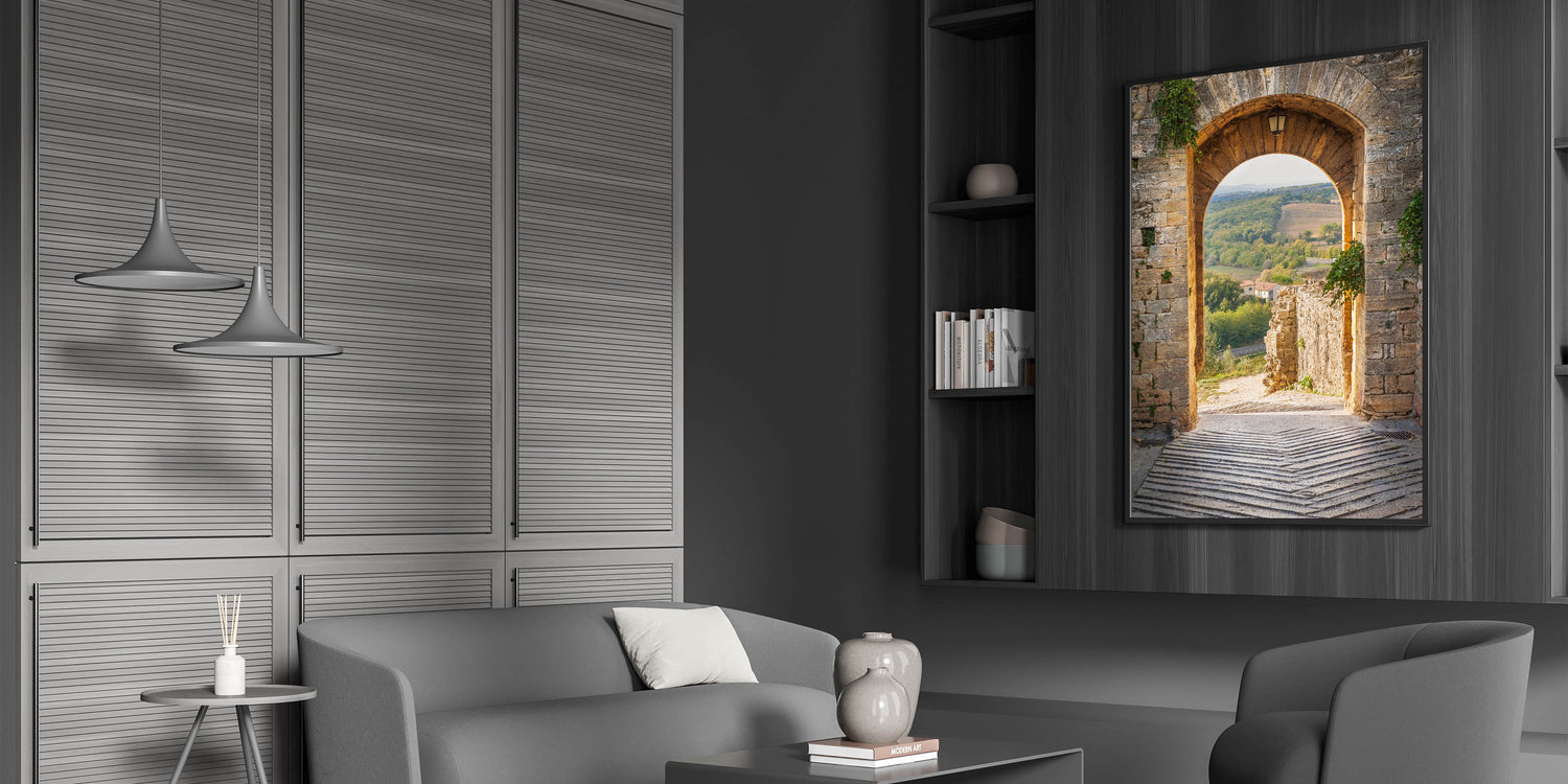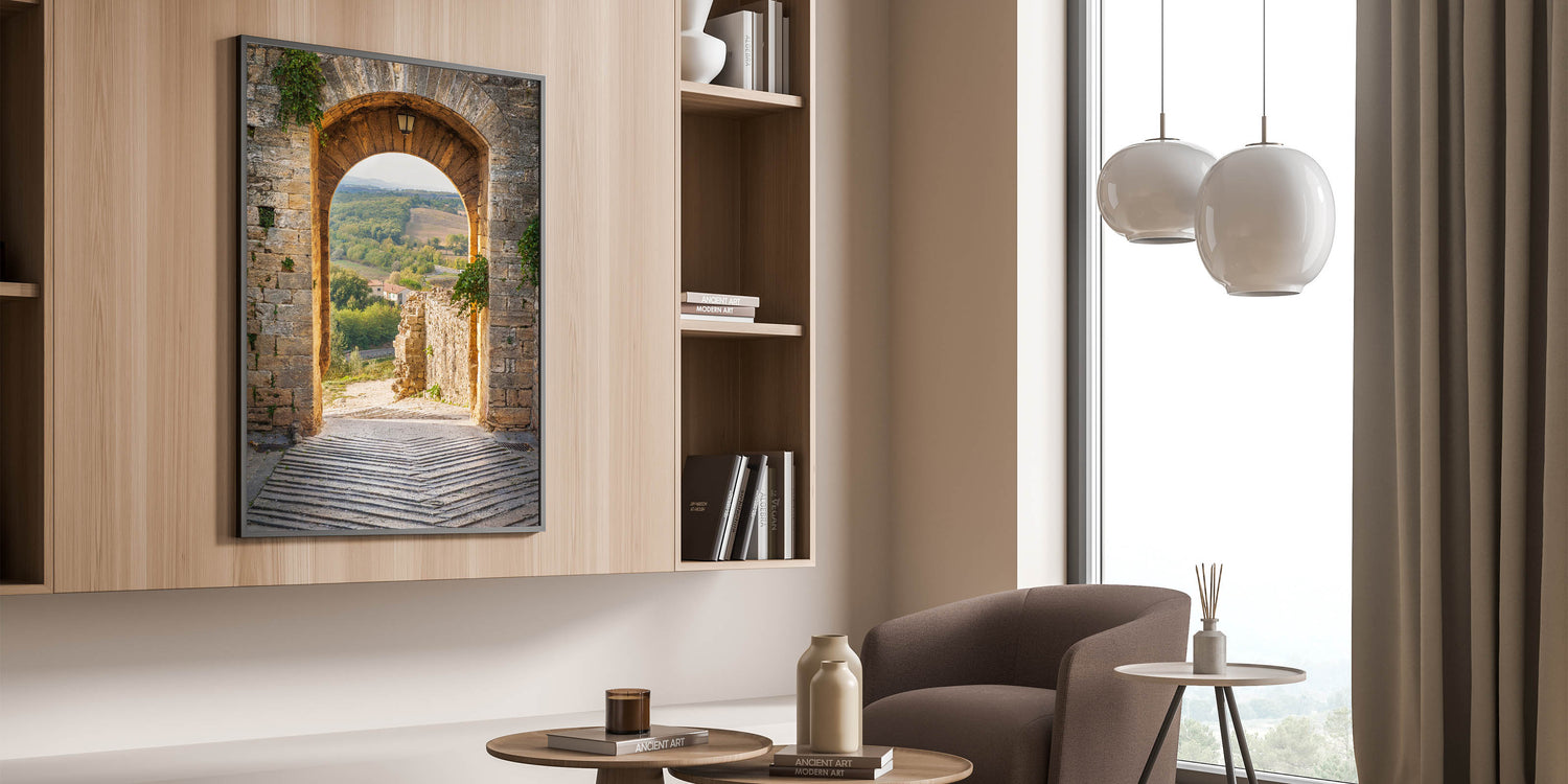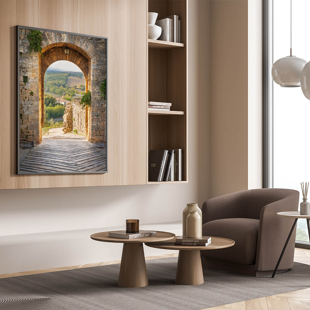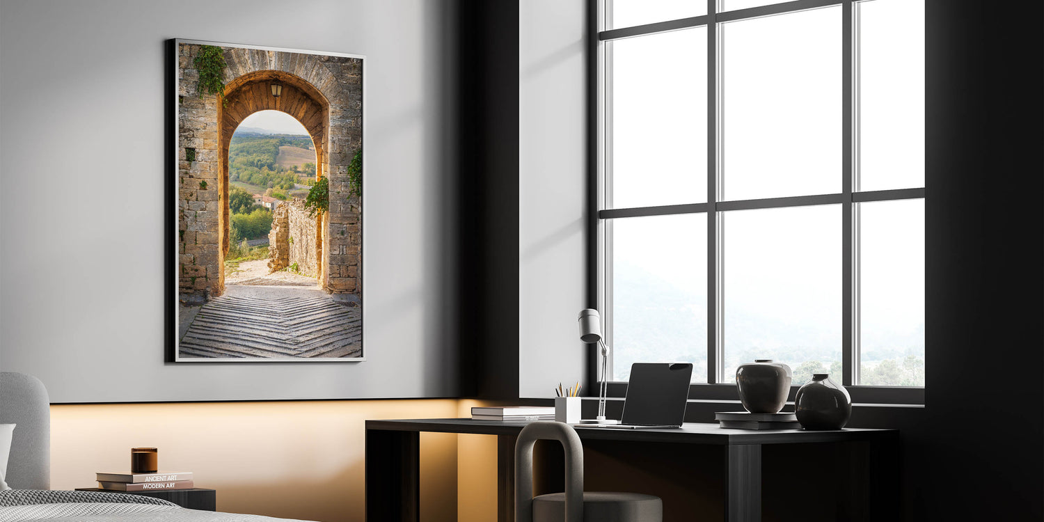 Step into the heart of Tuscany with this stunning Italy scenery art. This Tuscan countryside canvas captures the charm of an ancient stone archway opening up to a breathtaking view of the rolling hills and lush greenery of Tuscany. The soft golden light and the classic architectural elements make this Tuscan village framed art a timeless addition to any space. Perfect for those who love Italian landscape photography, this piece transports you to the warm and inviting atmosphere of Italy.