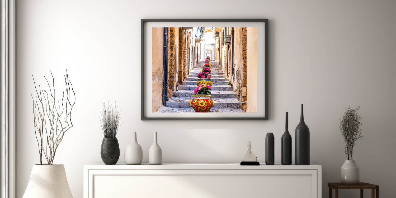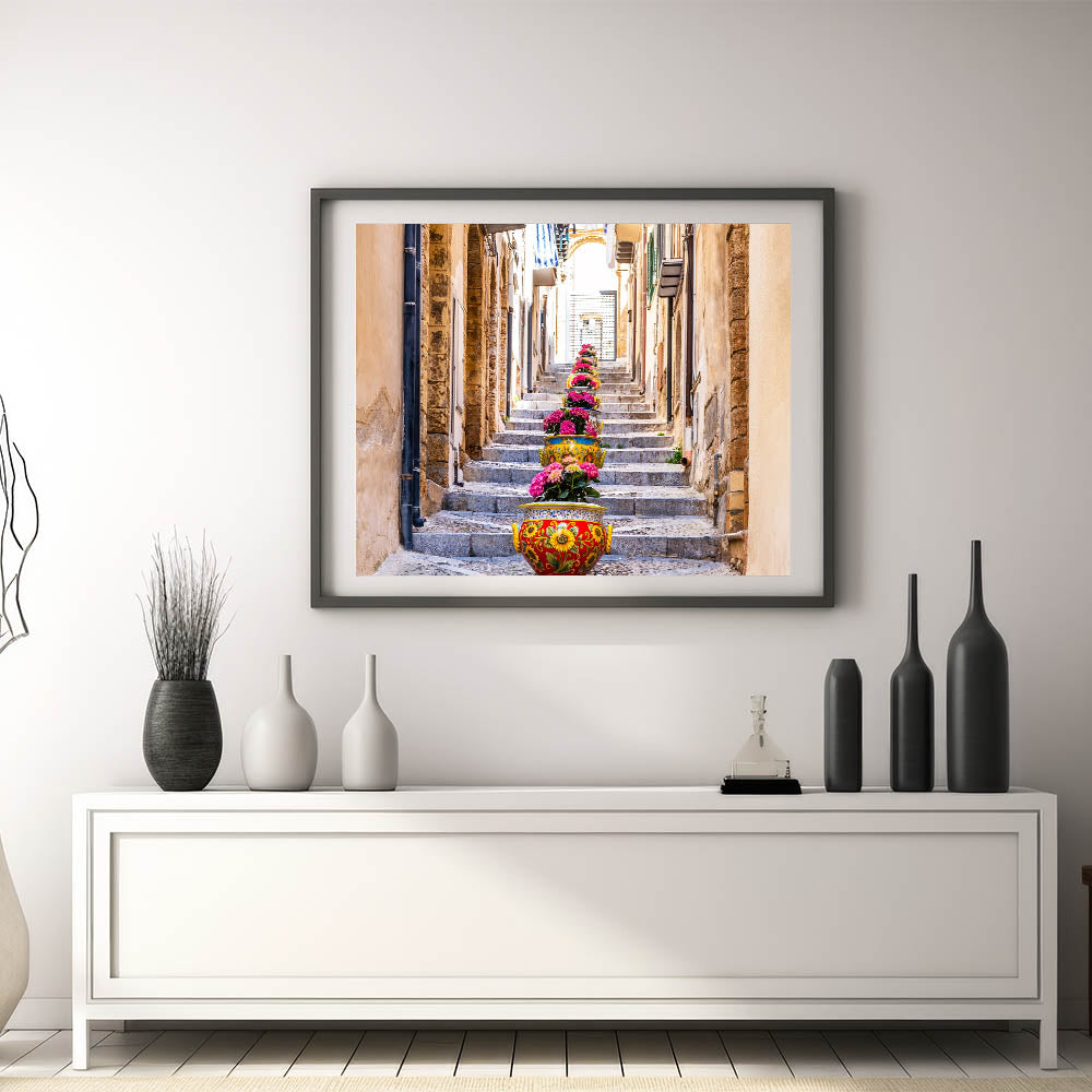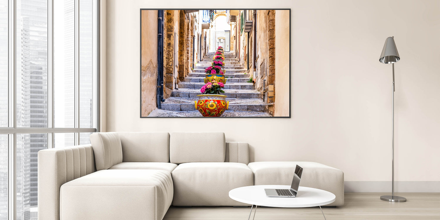 Brighten up your home with this delightful Sicily wall art that captures the vibrant essence of a Sicilian street. The stunning arrangement of colorful flower pots lining a stone stairway brings to life the charm and beauty of everyday life in Sicily. The intricate details of the traditional Sicilian pottery, combined with the rustic architecture, make this Sicily canvas print a captivating representation of Italian coastal scenes.