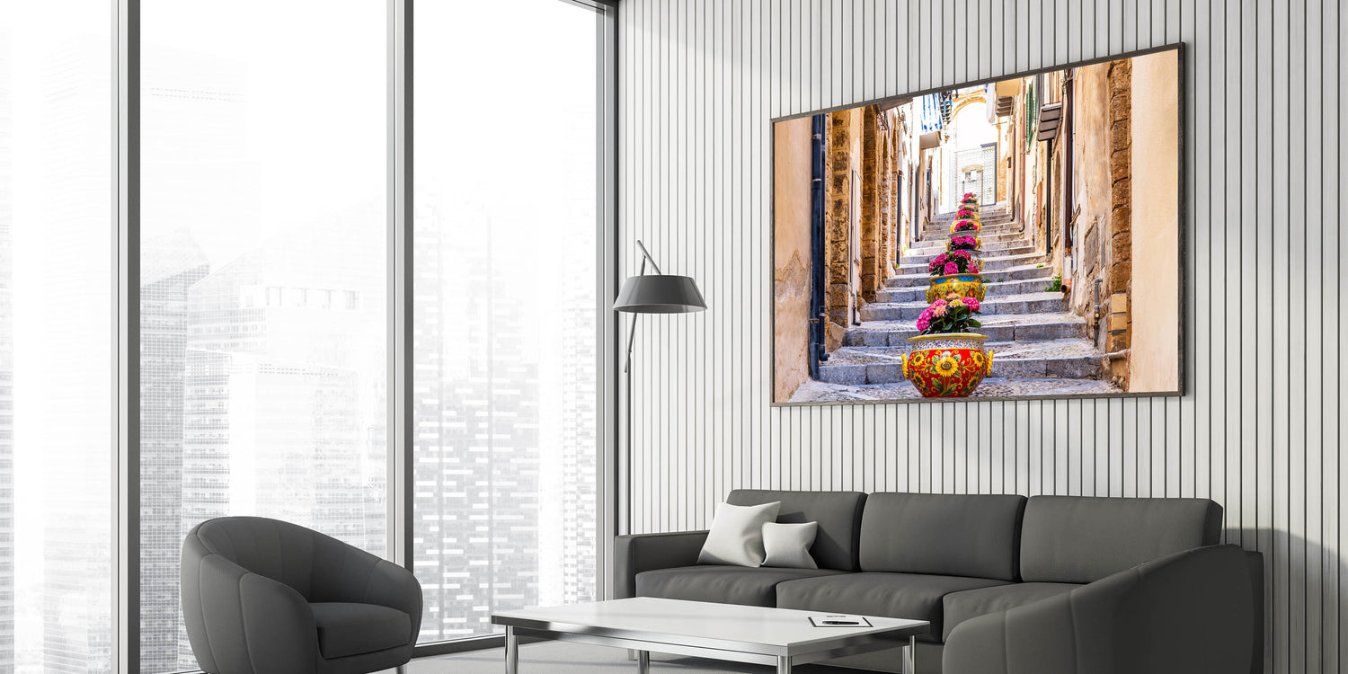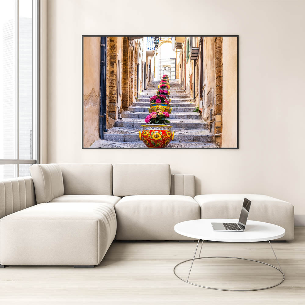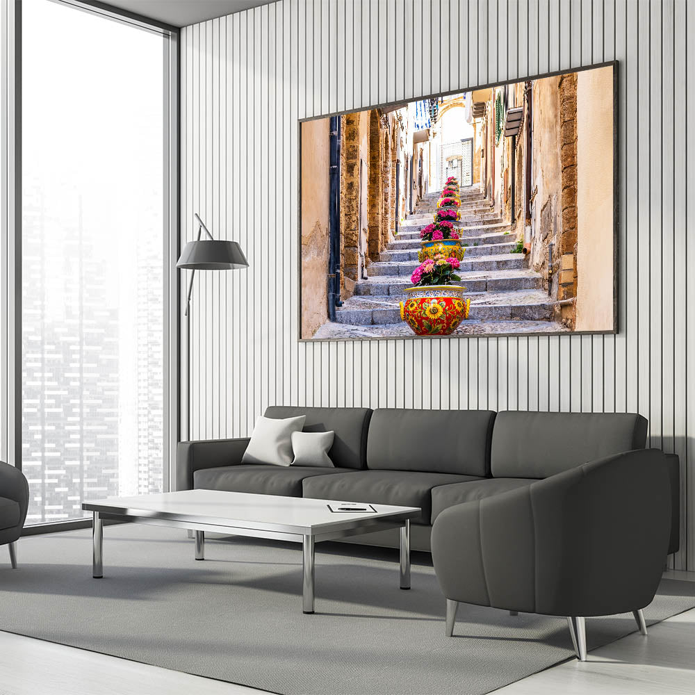 Brighten up your home with this delightful Sicily wall art that captures the vibrant essence of a Sicilian street. The stunning arrangement of colorful flower pots lining a stone stairway brings to life the charm and beauty of everyday life in Sicily. The intricate details of the traditional Sicilian pottery, combined with the rustic architecture, make this Sicily canvas print a captivating representation of Italian coastal scenes.