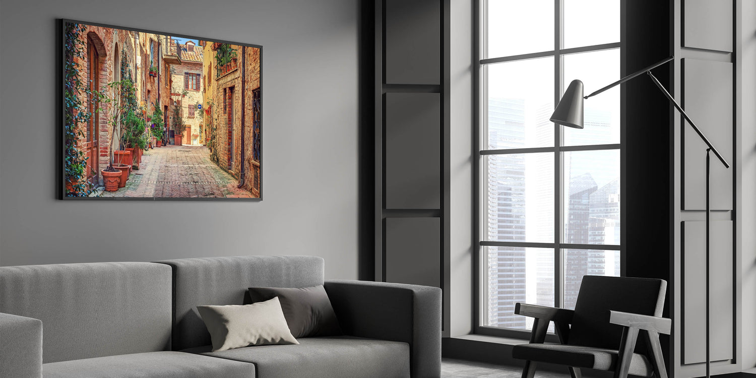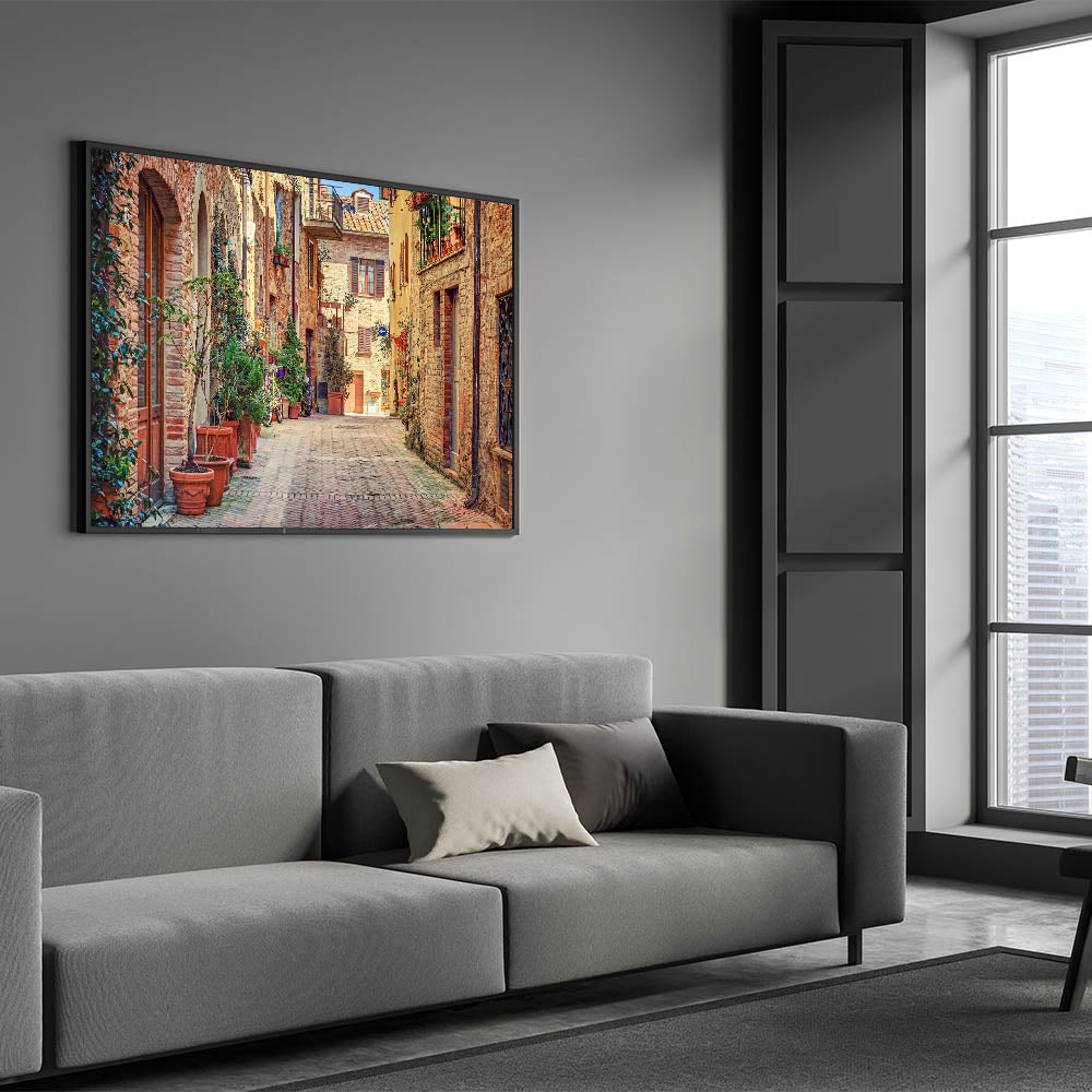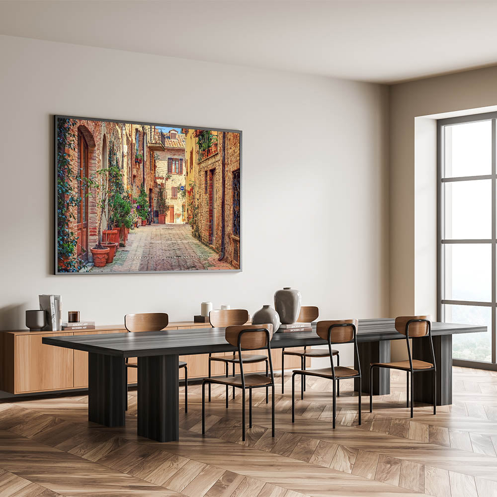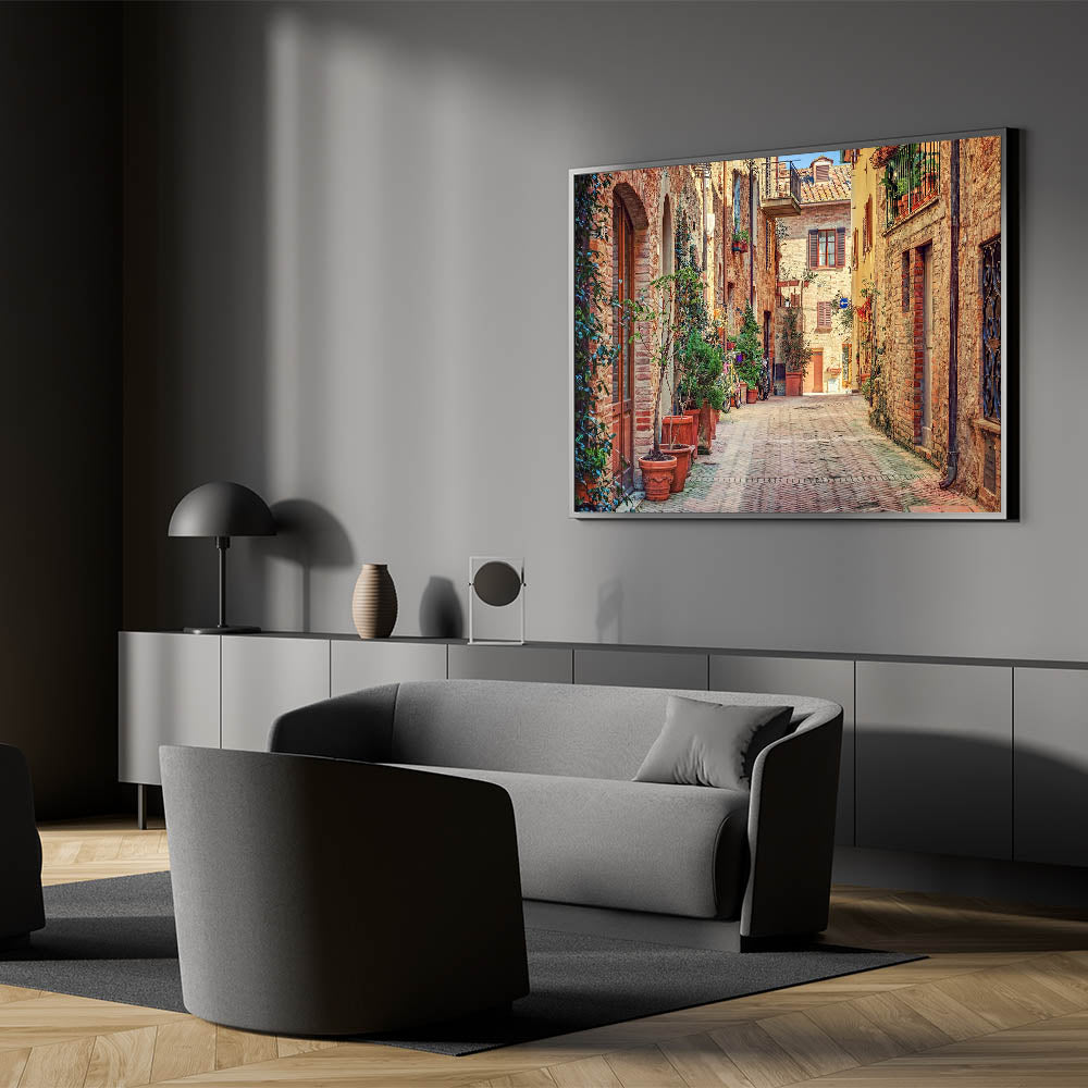 Transport yourself to a quaint Italian village with this stunning Tuscan landscape print. Featuring a charming alleyway lined with rustic homes, potted plants, and traditional architecture, this Italy scenery art brings the warmth and beauty of Tuscany into your home. Perfect for anyone looking to add a touch of European elegance to their decor, this Tuscan village framed art is a delightful snapshot of life in a traditional Italian village, capturing the peaceful and welcoming ambiance of its streets.