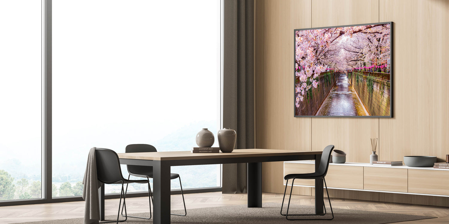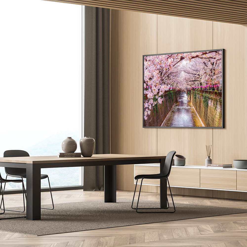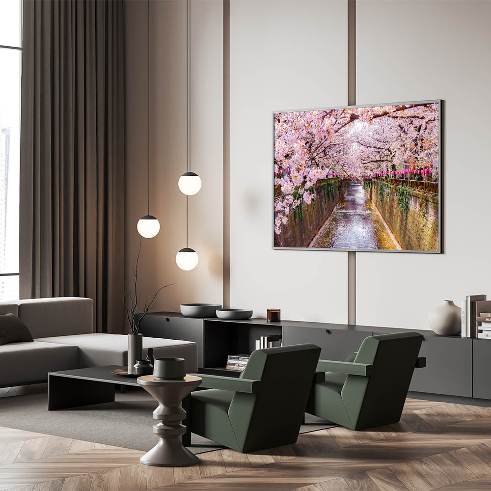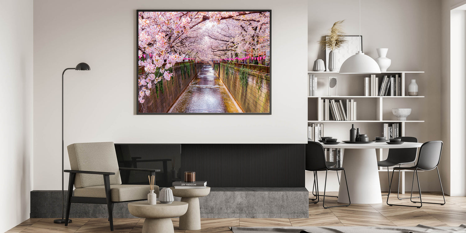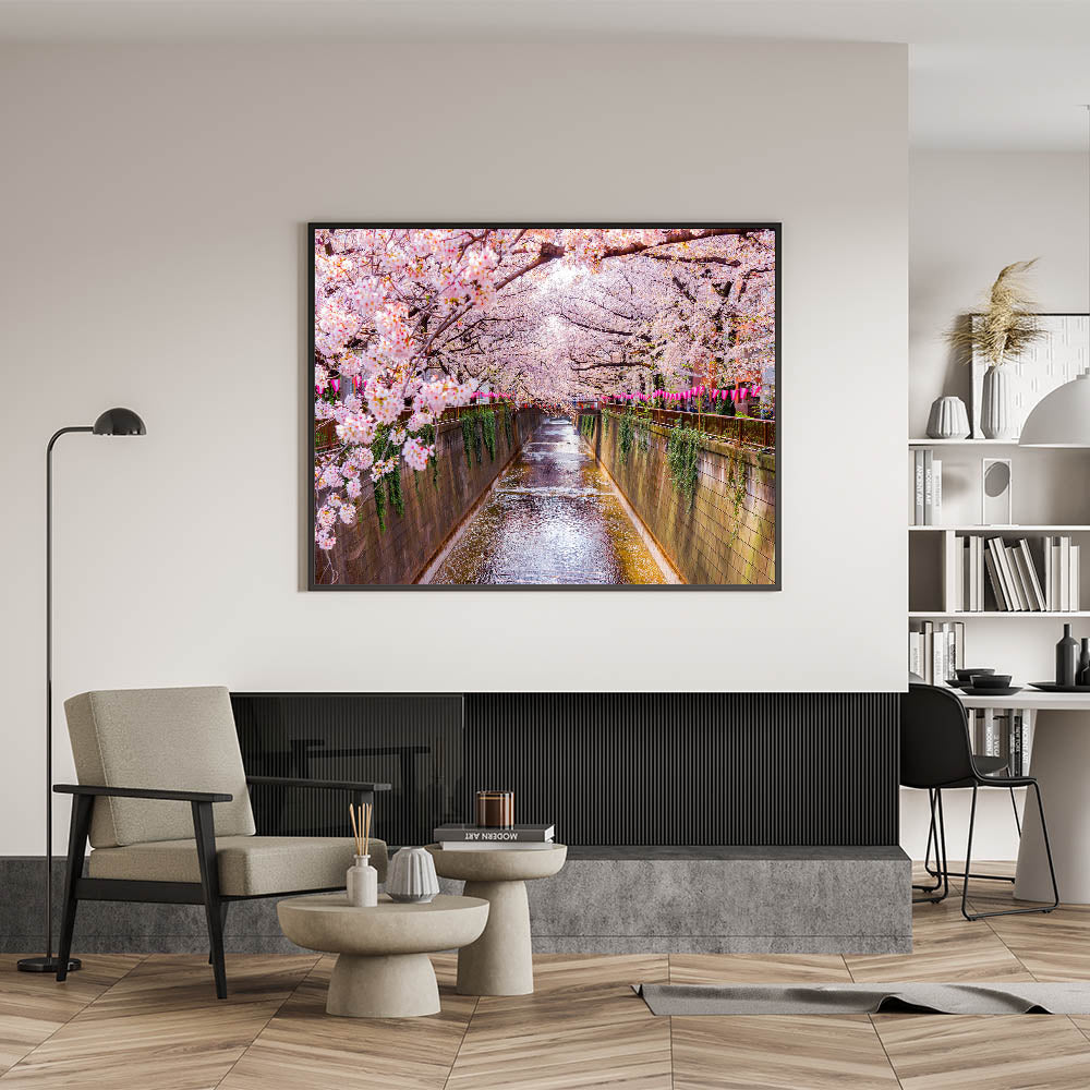 - High-quality cherry blossom canal landscape canvas print available in stretched canvas, framed canvas, and acrylic glass.