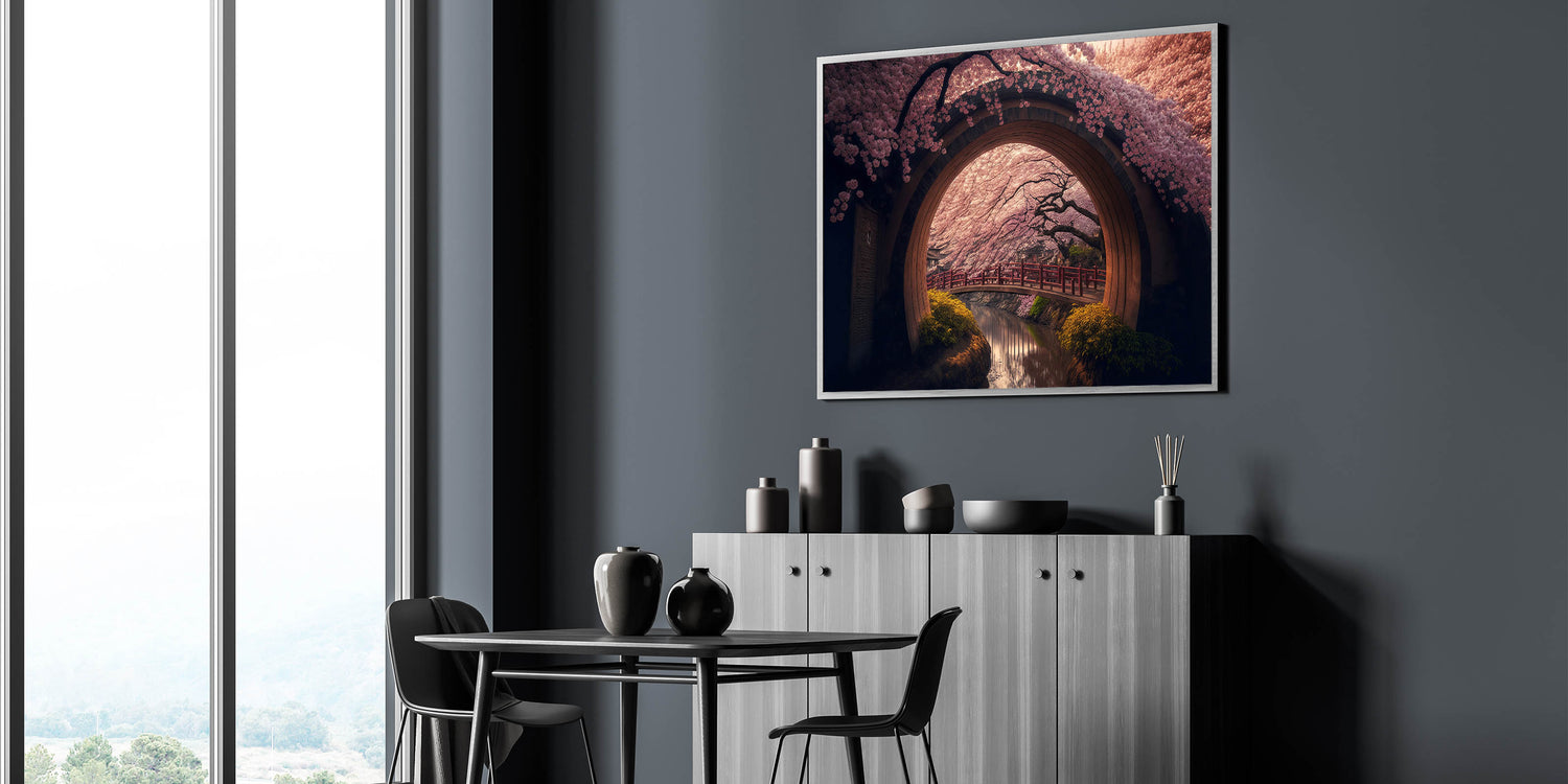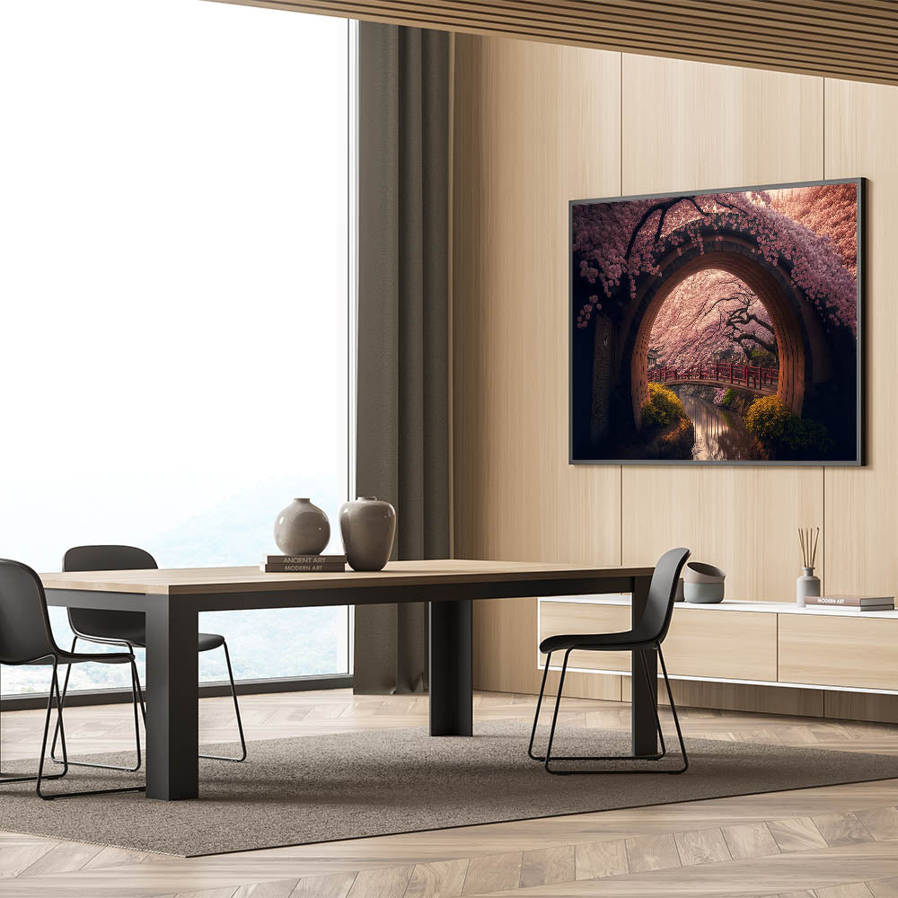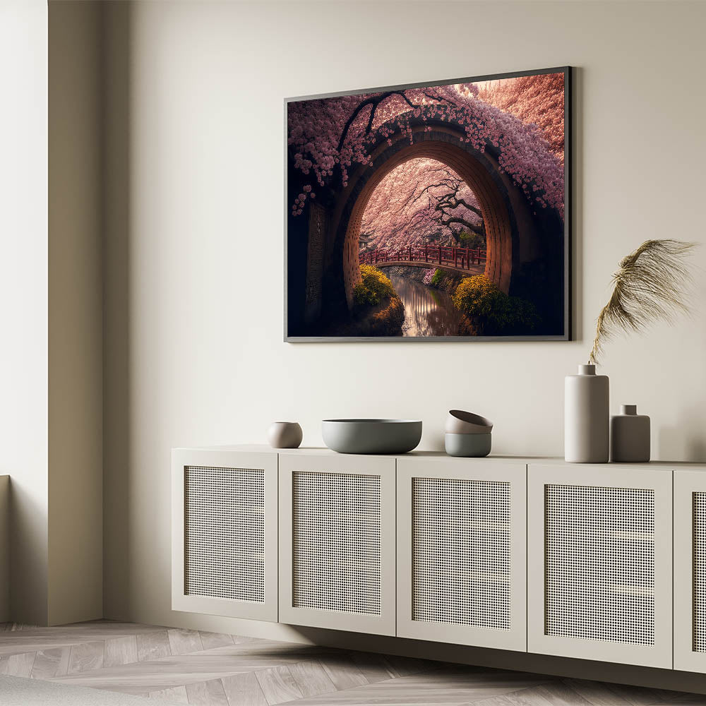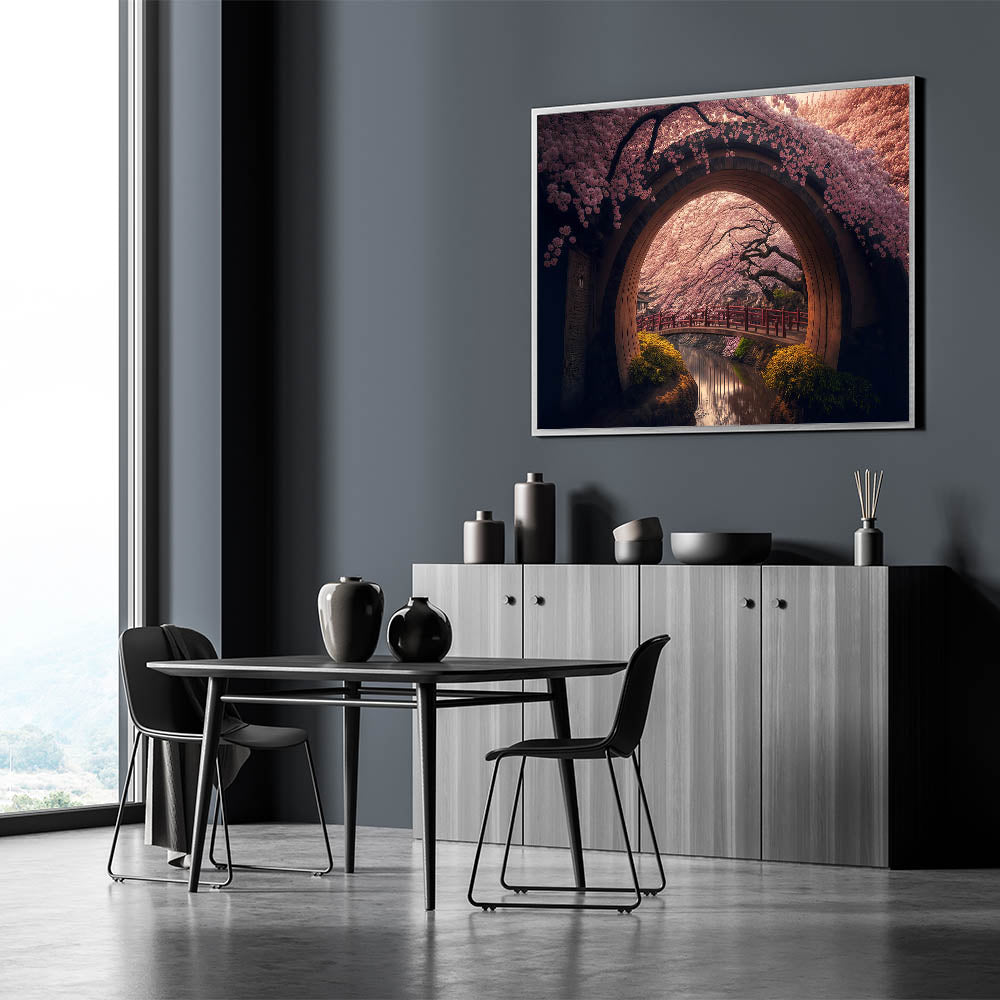 Discover the enchanting beauty of Japan’s spring season with this captivating Japanese Archway and Cherry Blossoms Art Print. The artwork features a peaceful stone archway framing a wooden bridge, surrounded by cascading cherry blossom trees in full bloom. The soft pink hues of the blossoms and the tranquil waters create a serene and calming atmosphere, inviting you into a world of tranquility and natural beauty. This piece is a perfect addition to any space, bringing the elegance of Japanese nature and architecture into your home.