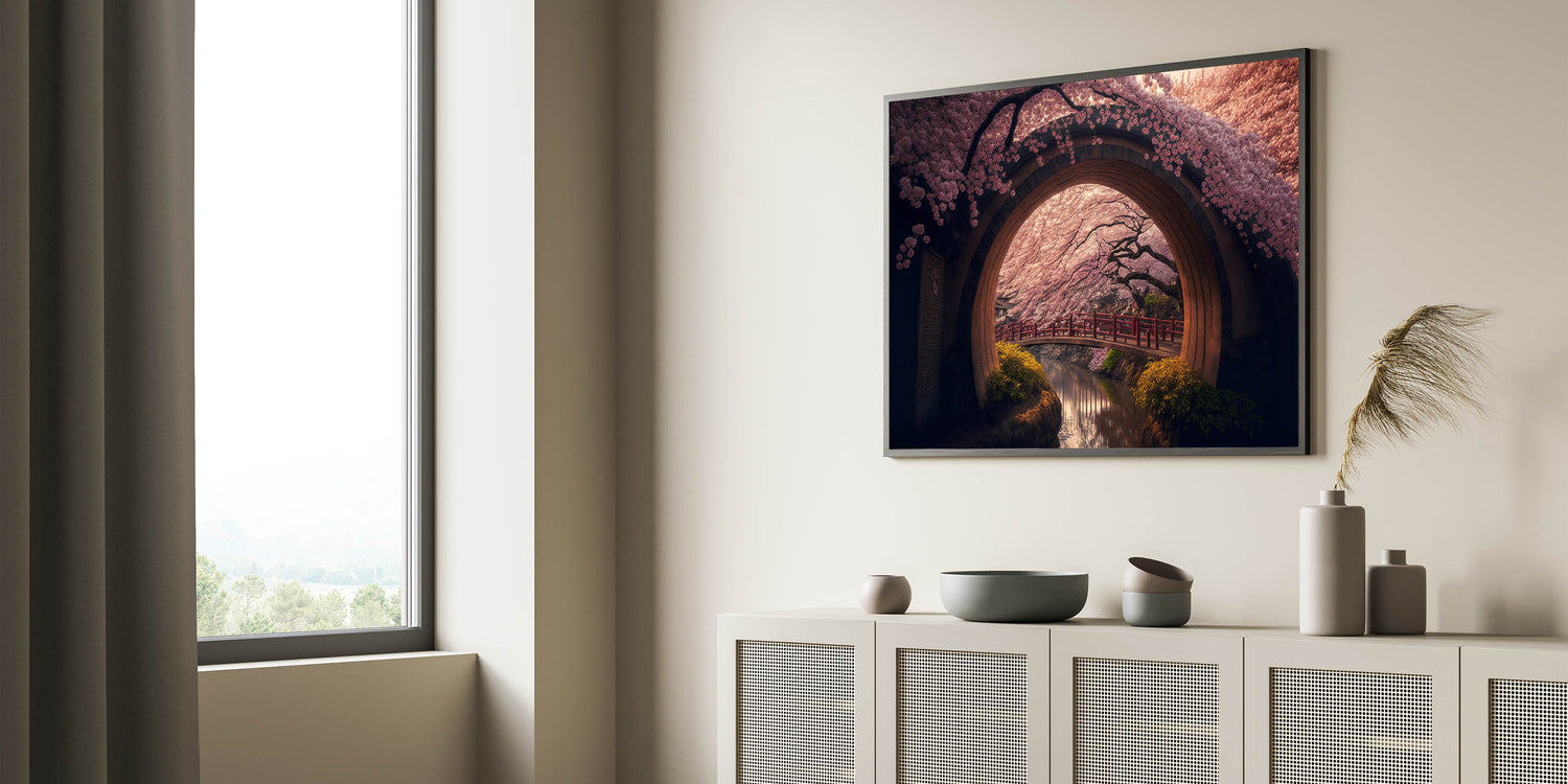 - High-quality Japanese landscape canvas print available in stretched canvas, framed canvas, and acrylic glass.