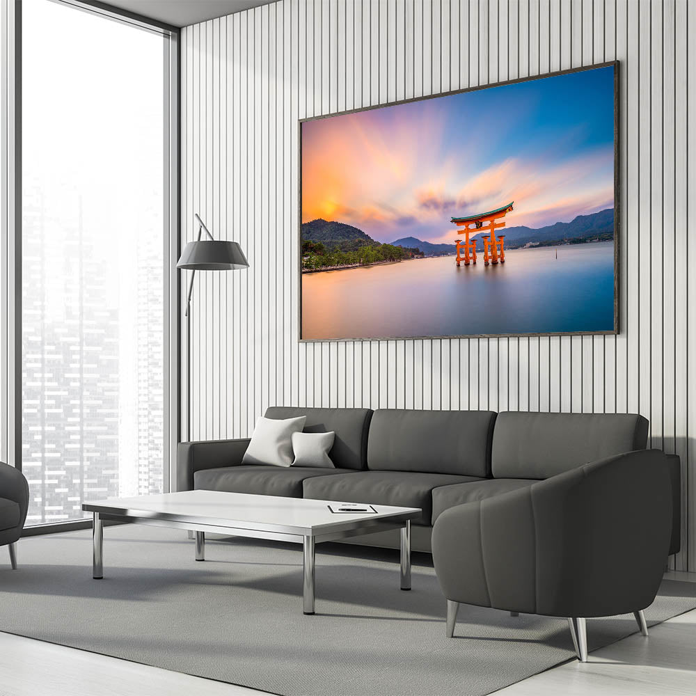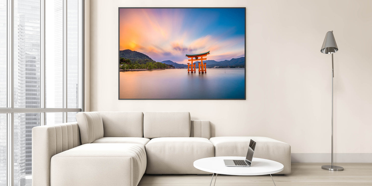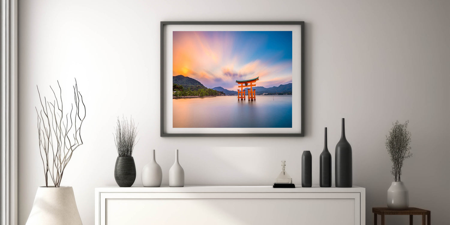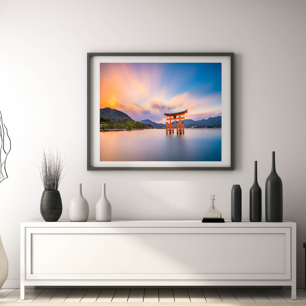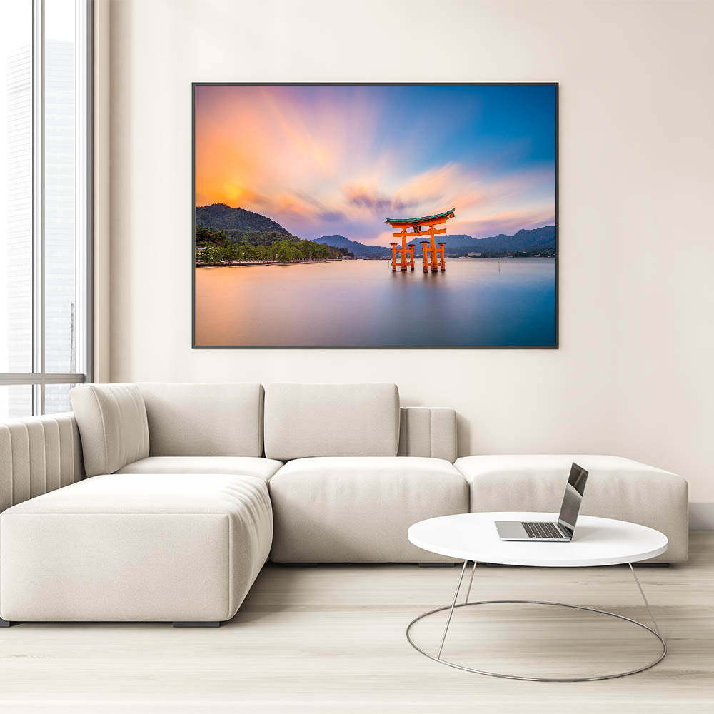 Enhance your home with this captivating Japanese Scenery Wall Art, featuring the iconic Torii Gate under a vibrant sunset sky. The peaceful waters and the glowing sky in shades of orange and pink bring a calming yet breathtaking atmosphere, making it the perfect piece to add elegance and serenity to any room. The timeless beauty of Japan’s cultural landscape is captured with precision, creating a visual journey into the heart of Japan's natural wonders.