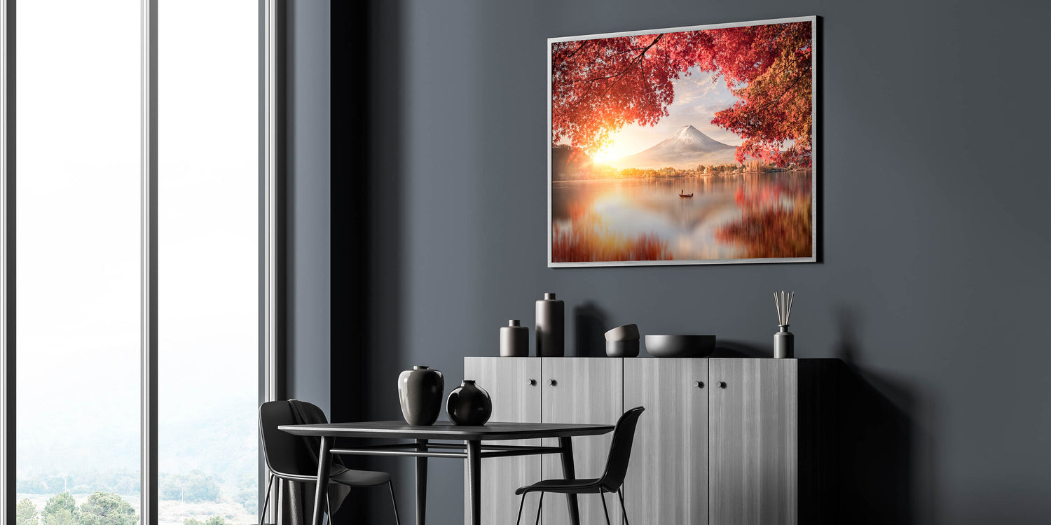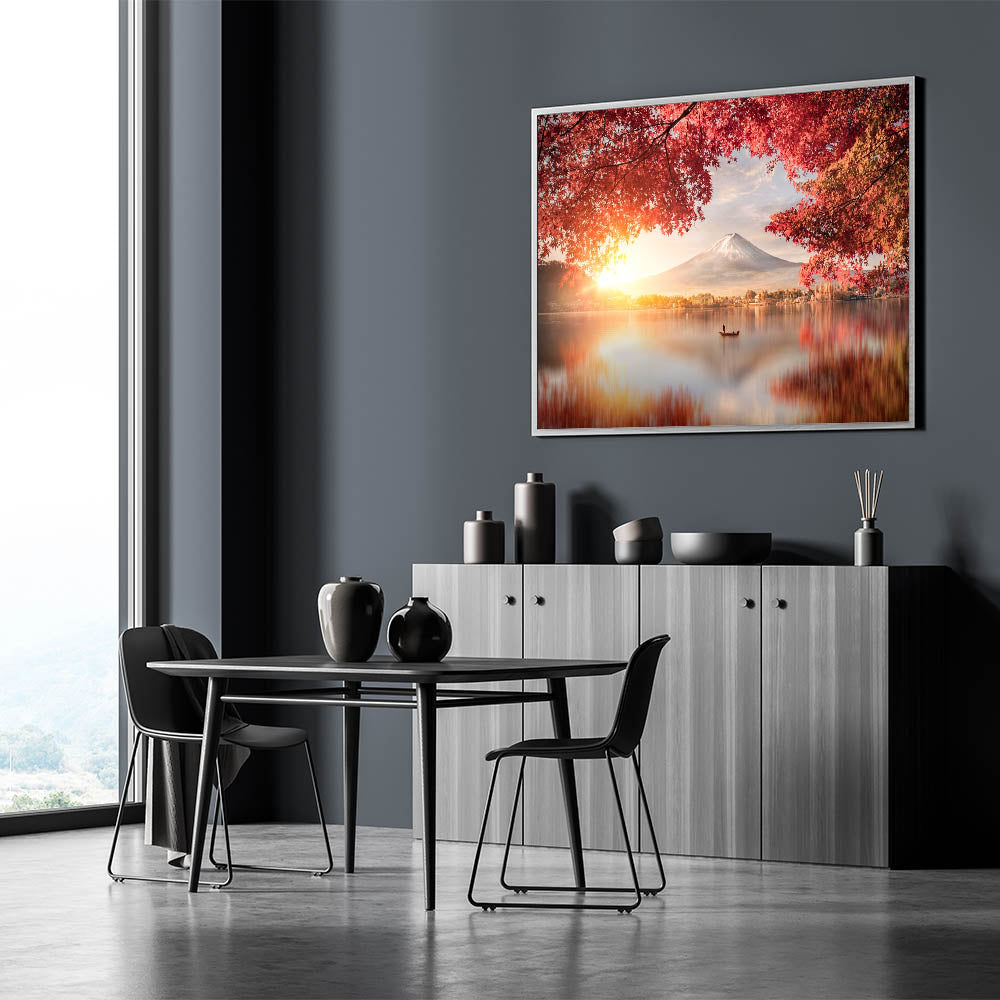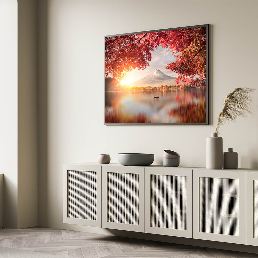 Embrace the beauty of Japan with this stunning Mount Fuji Art Print, featuring a peaceful sunrise over the lake, framed by vibrant red autumn leaves. The soft glow of the rising sun illuminates the sky, casting warm reflections on the calm waters, while Mount Fuji stands majestically in the background. This tranquil scene captures the essence of Japan's natural beauty and the harmony of its seasons, making it a perfect piece to bring warmth and serenity to any space.