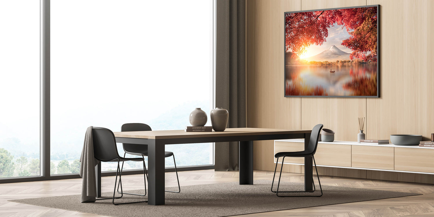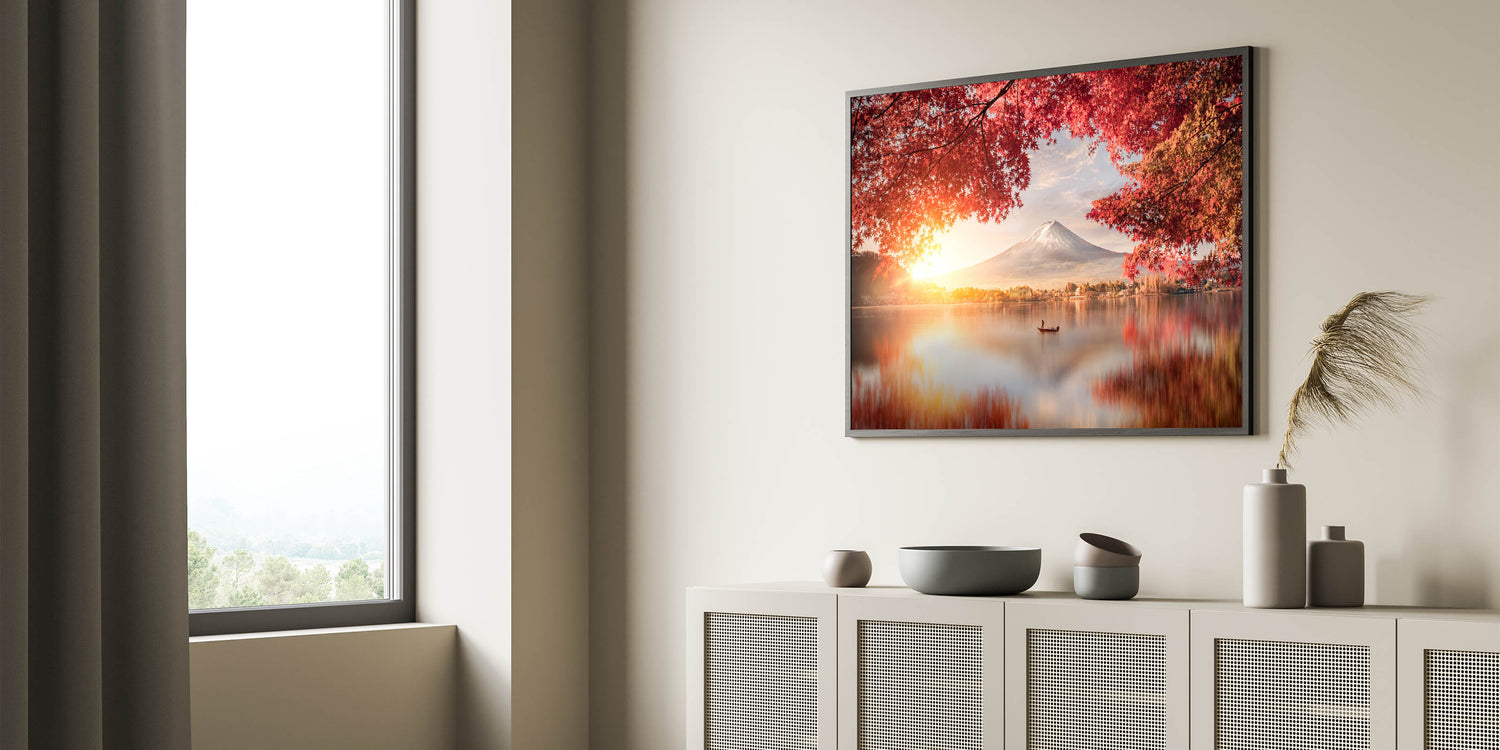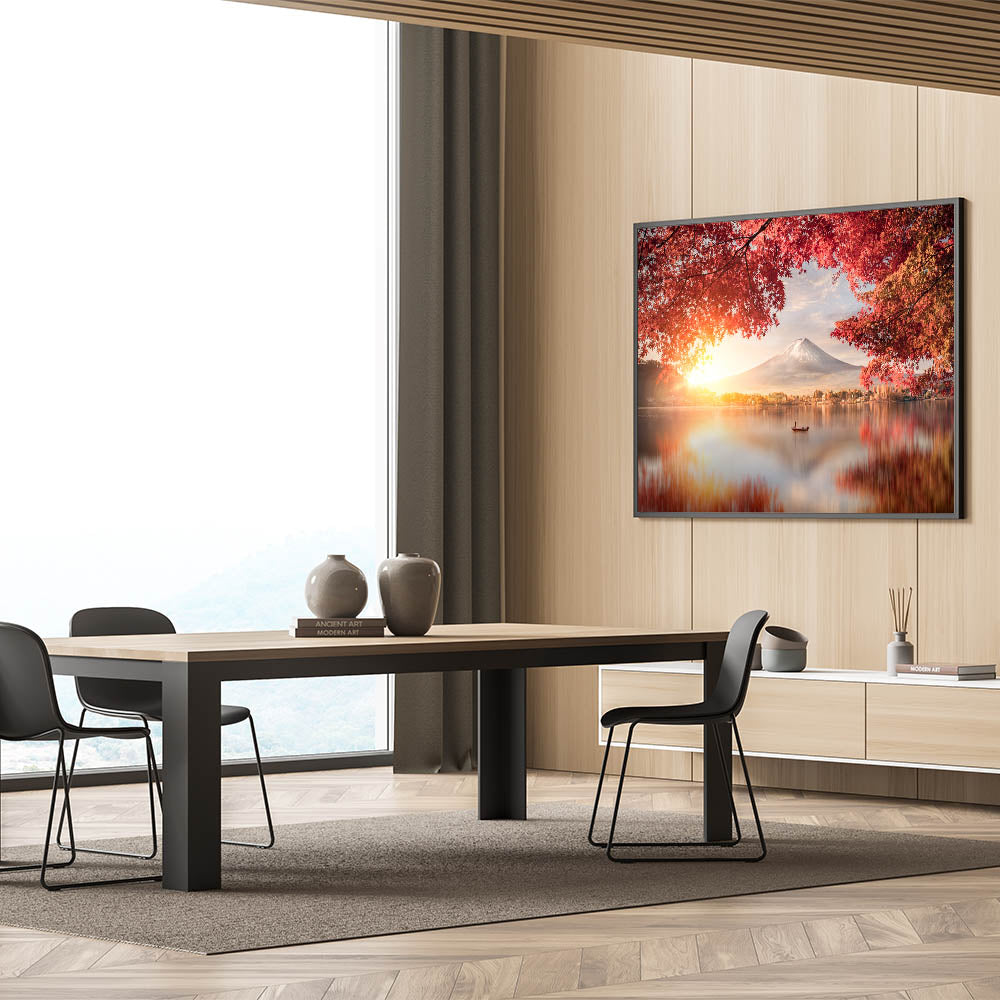 Embrace the beauty of Japan with this stunning Mount Fuji Art Print, featuring a peaceful sunrise over the lake, framed by vibrant red autumn leaves. The soft glow of the rising sun illuminates the sky, casting warm reflections on the calm waters, while Mount Fuji stands majestically in the background. This tranquil scene captures the essence of Japan's natural beauty and the harmony of its seasons, making it a perfect piece to bring warmth and serenity to any space.