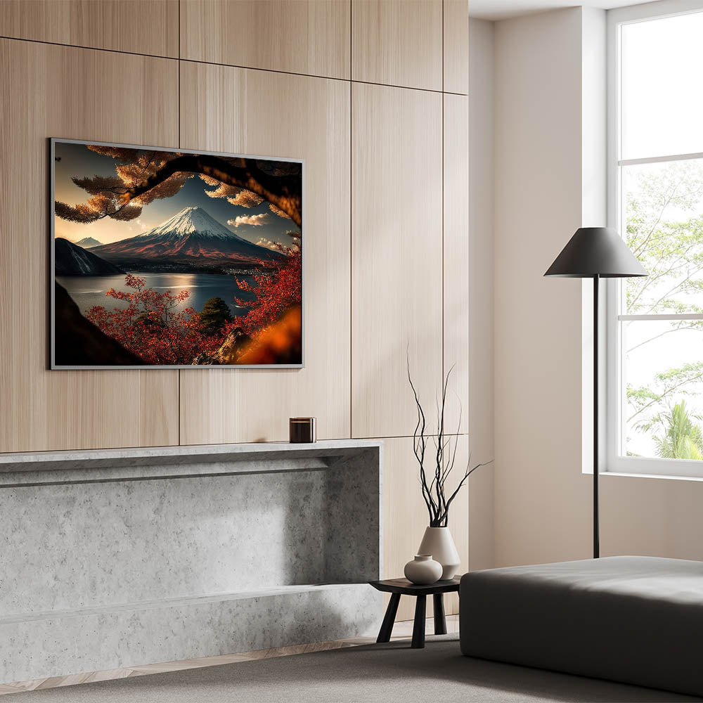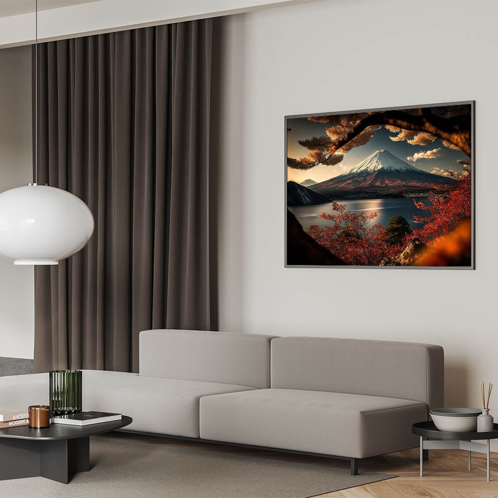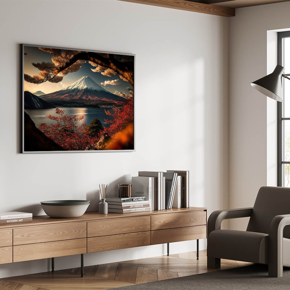 This stunning Mount Fuji photography print is a perfect blend of nature’s tranquility and vivid autumn hues. Whether you are decorating your home or office, this piece will bring warmth, culture, and beauty to your space.