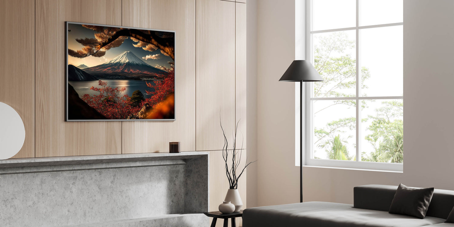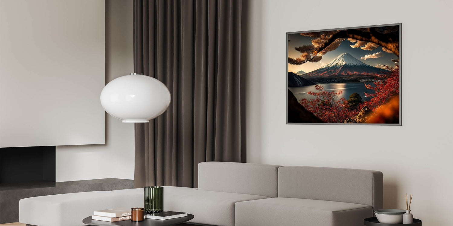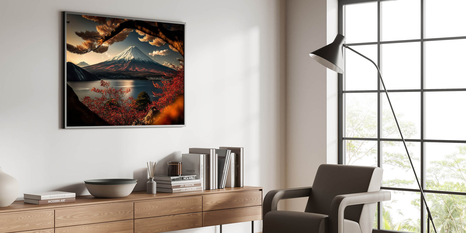 This stunning Mount Fuji photography print is a perfect blend of nature’s tranquility and vivid autumn hues. Whether you are decorating your home or office, this piece will bring warmth, culture, and beauty to your space.