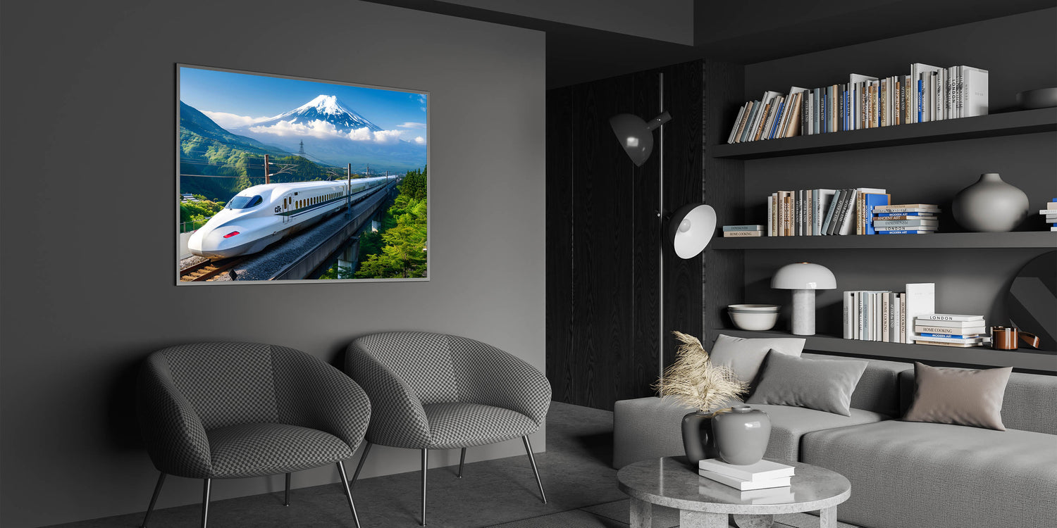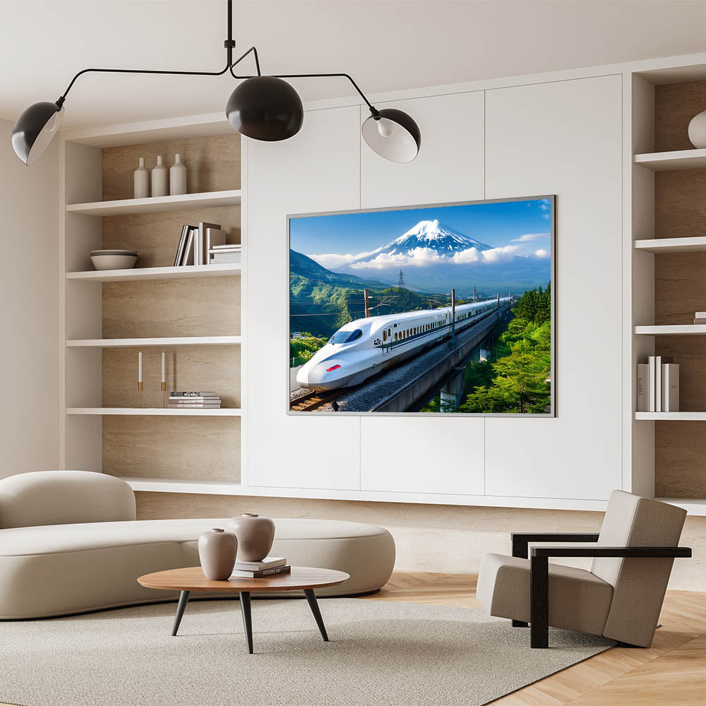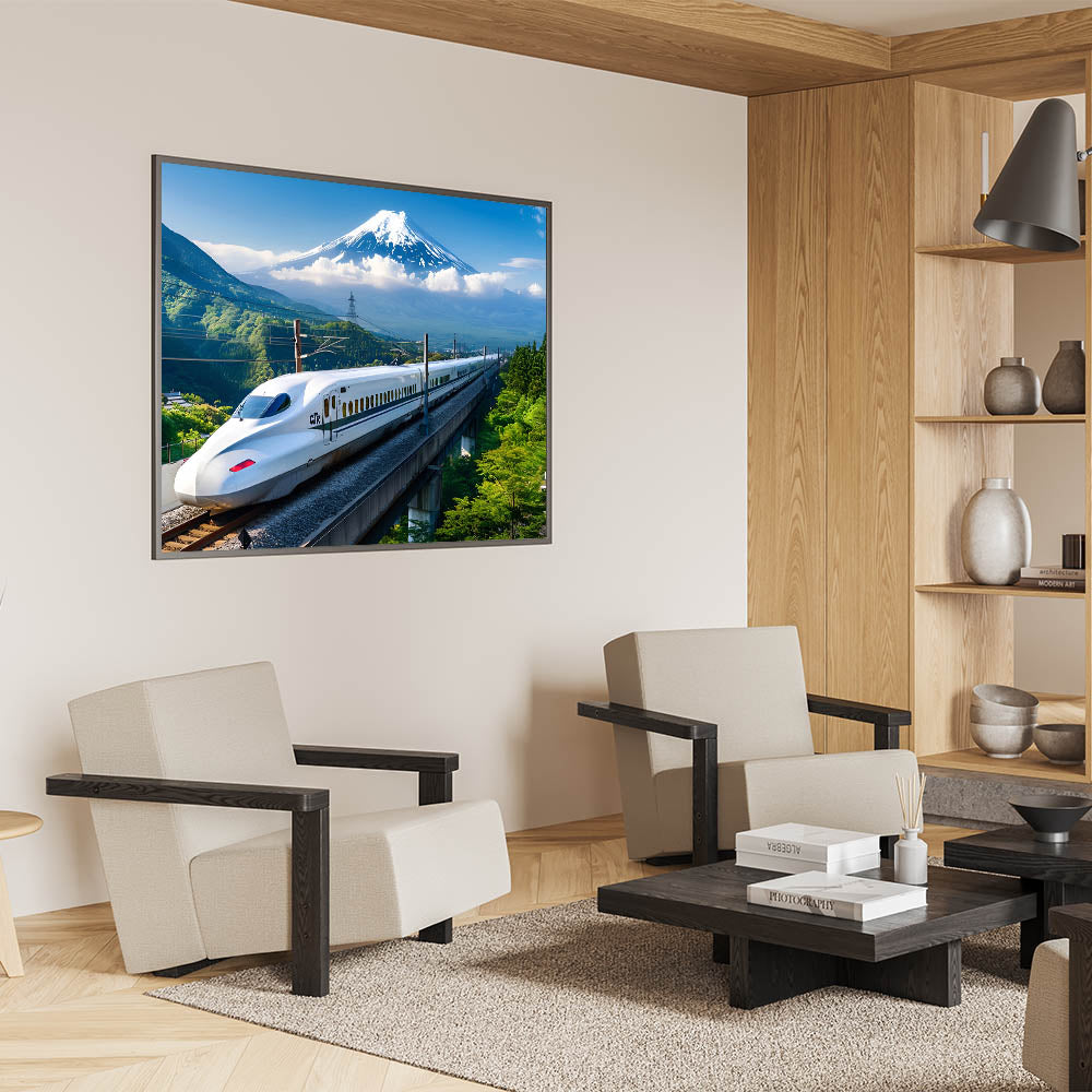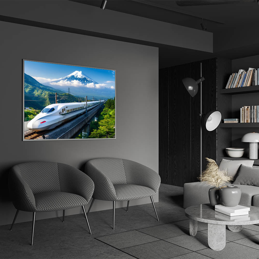 This Mount Fuji photography print offers a serene yet dynamic view of Japan, combining the tranquility of nature with the speed and efficiency of modern technology. Whether you are looking to enhance your living space or office, this stunning Mount Fuji canvas art will bring a fresh, modern perspective to your decor.