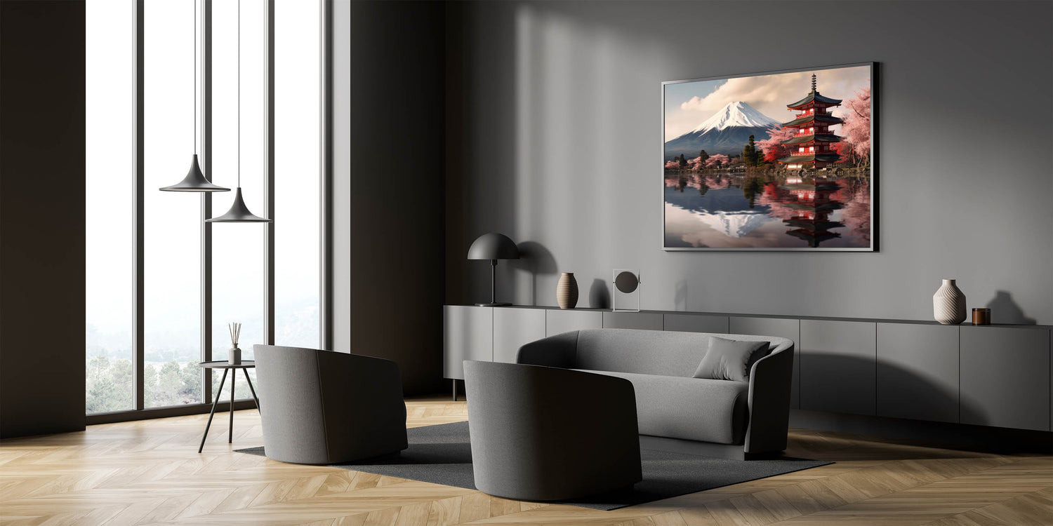 Immerse yourself in the serene beauty of Japan with this captivating Mount Fuji artwork, showcasing a traditional red pagoda reflected in tranquil waters with Mount Fuji in the background. The cherry blossoms, pagoda, and iconic mountain combine to create a perfect harmony between architecture and nature. This piece is ideal for lovers of Japanese scenic art and will bring a sense of peace and elegance to any space.