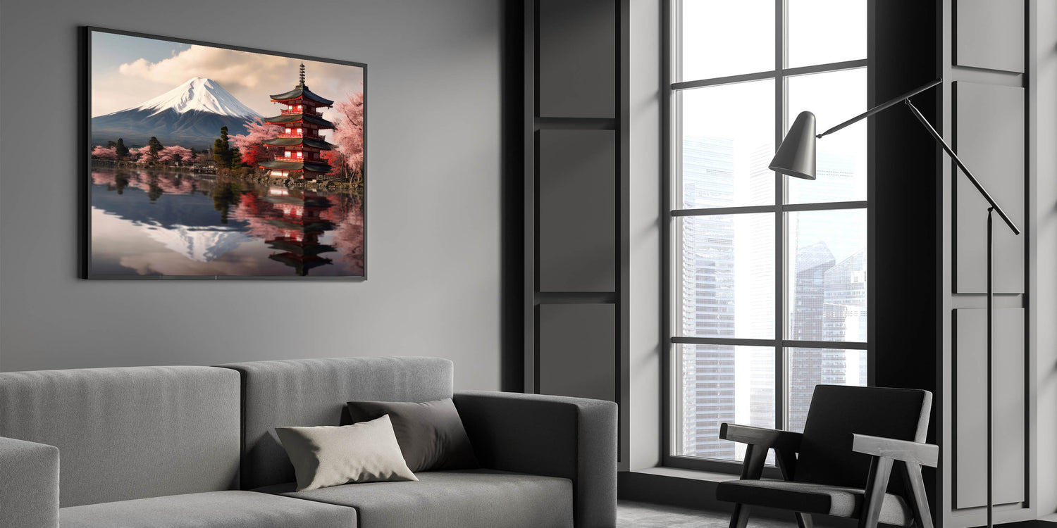 • Stunning detail of Mount Fuji canvas art with reflections and vibrant cherry blossoms