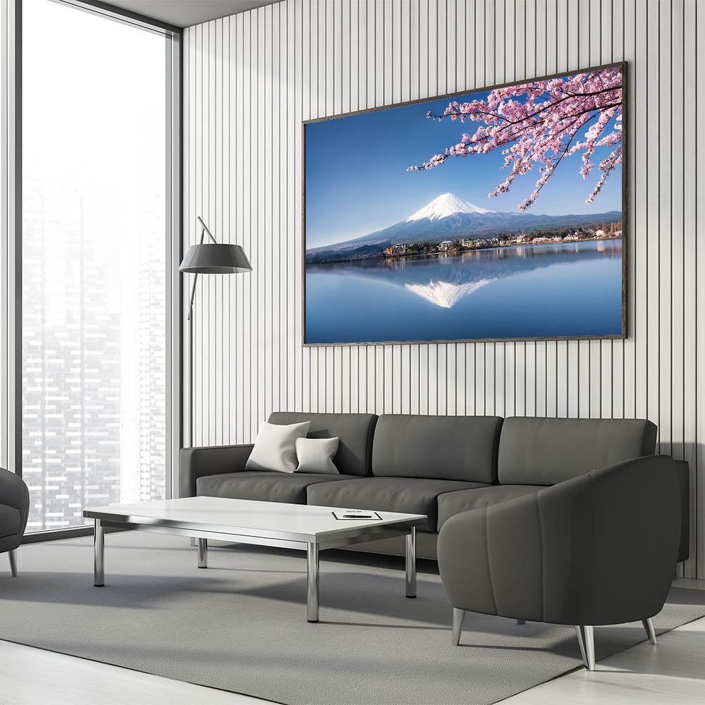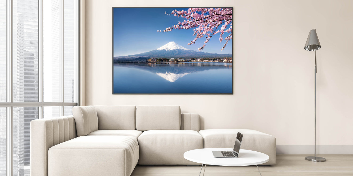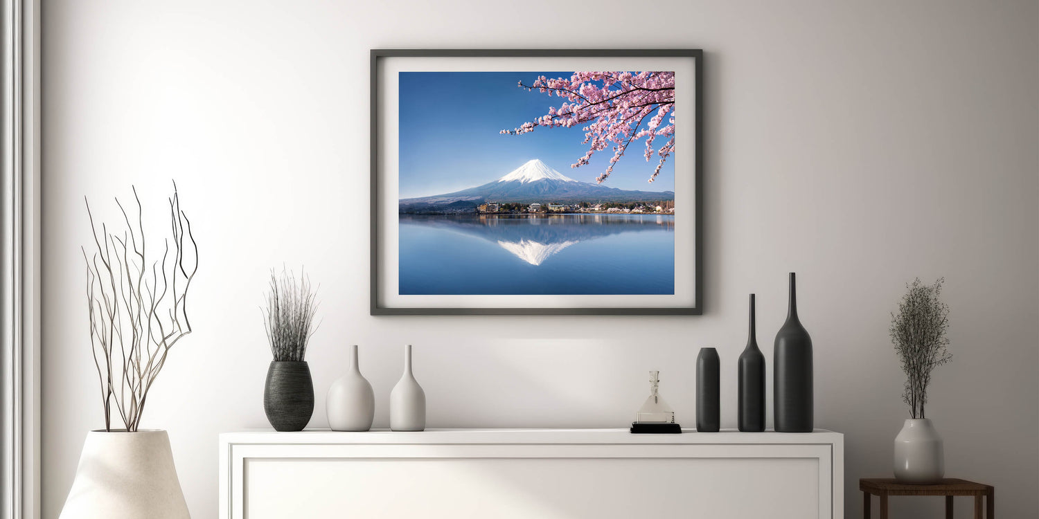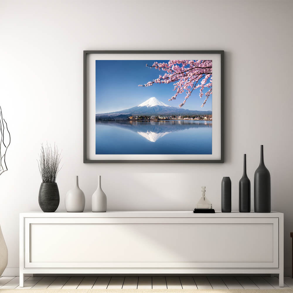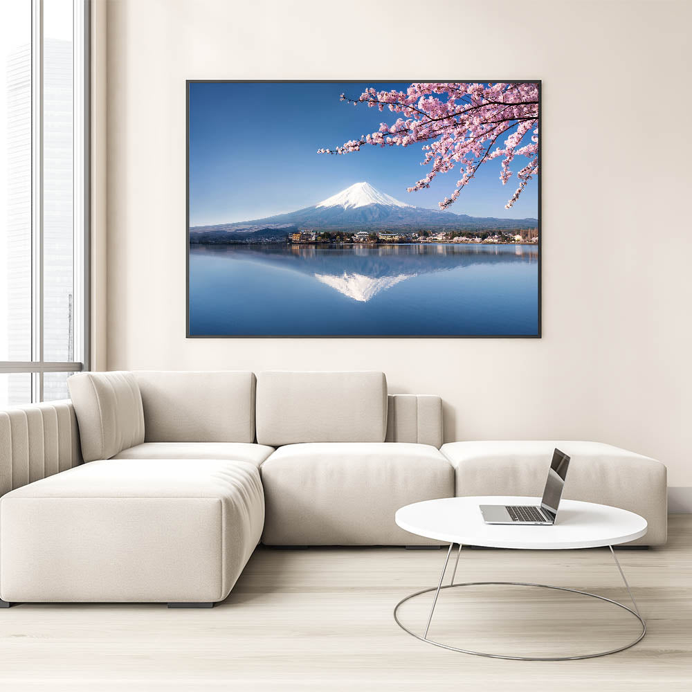• Stunning Mount Fuji canvas art with detailed reflections and cherry blossoms
